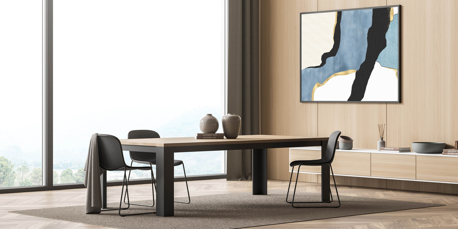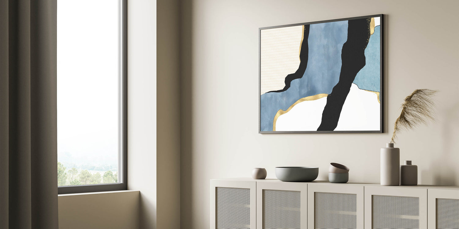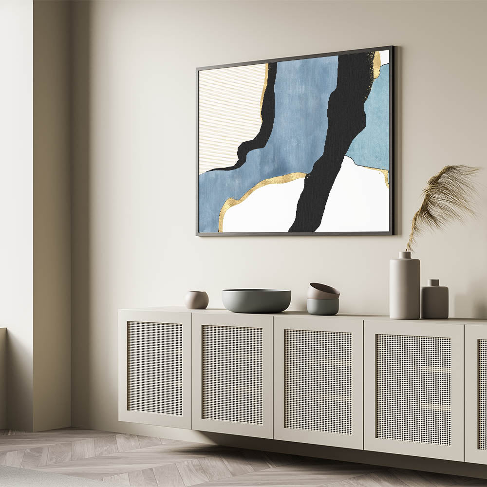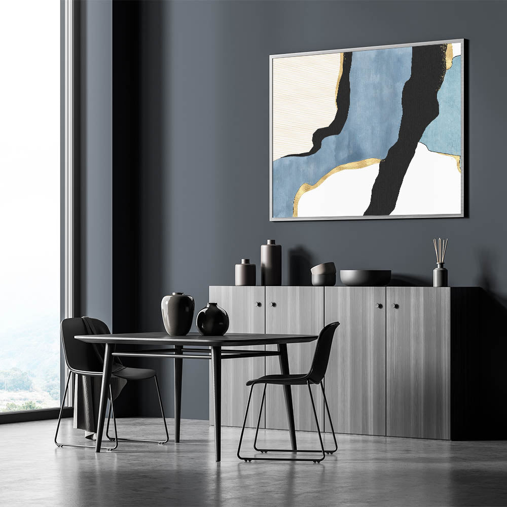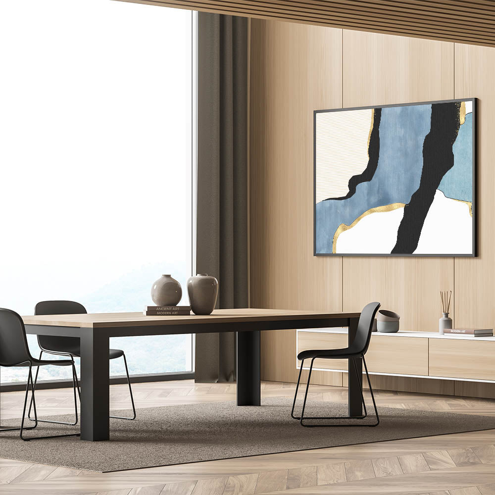 Transform your space with this contemporary canvas print, a stunning addition to the modern abstract art collection. Featuring a harmonious blend of geometric patterns in modern art, deep blue tones, and bold black accents, this artwork is elevated with metallic gold highlights for a luxurious touch. The dynamic flow of shapes and textures creates a captivating contrast, making this piece a perfect fit for minimalist and modern interiors.