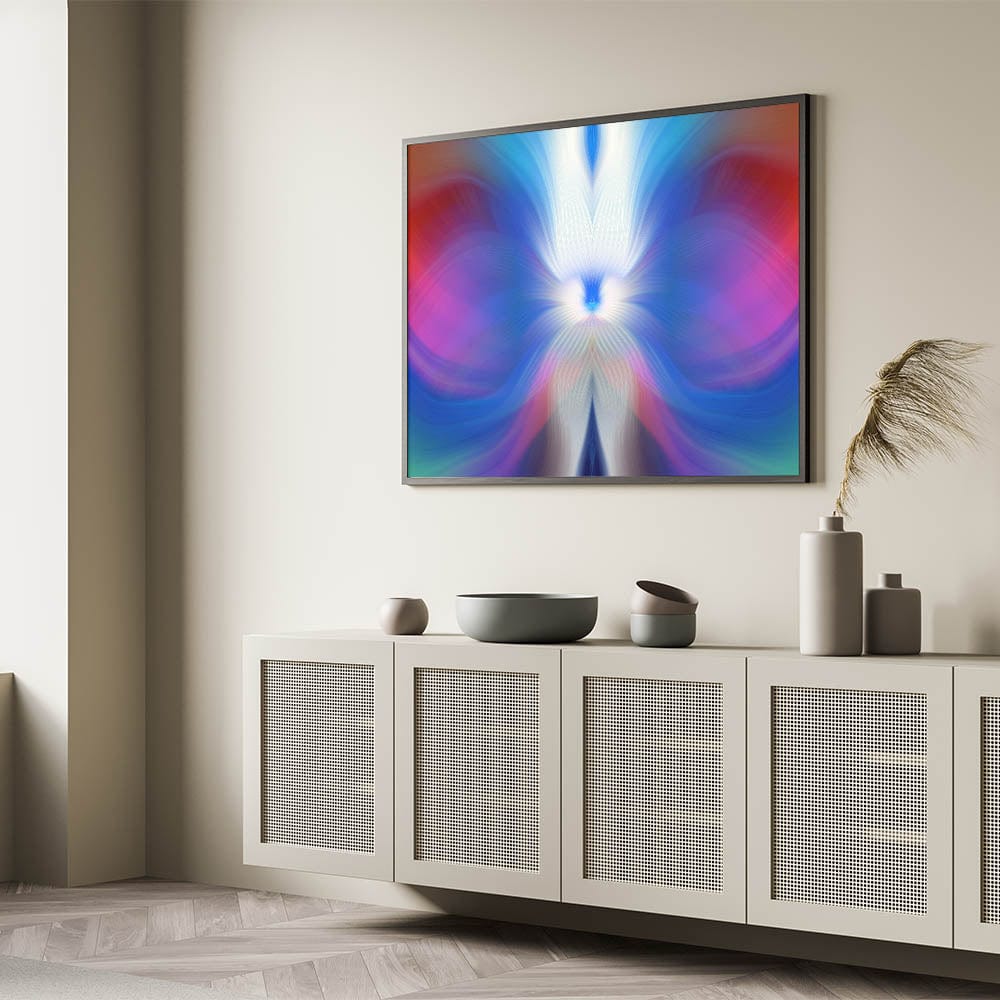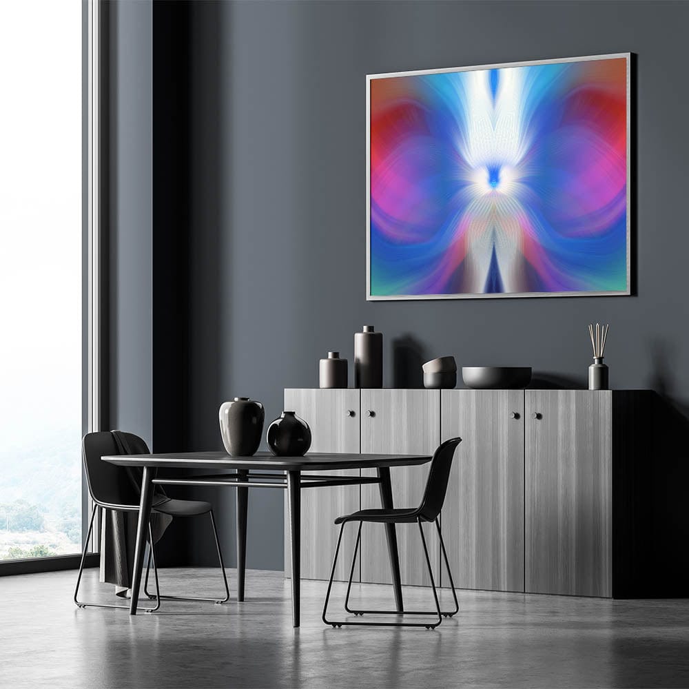 Illuminate your walls with the radiant energy of these Contemporary Fluid Art Pieces in electric blue, vibrant magenta, and glowing white. This piece from our Fluid Abstract Art Collection evokes movement and symmetry through sweeping gradients and radiant curves, blending color and light into a mesmerizing centerpiece.