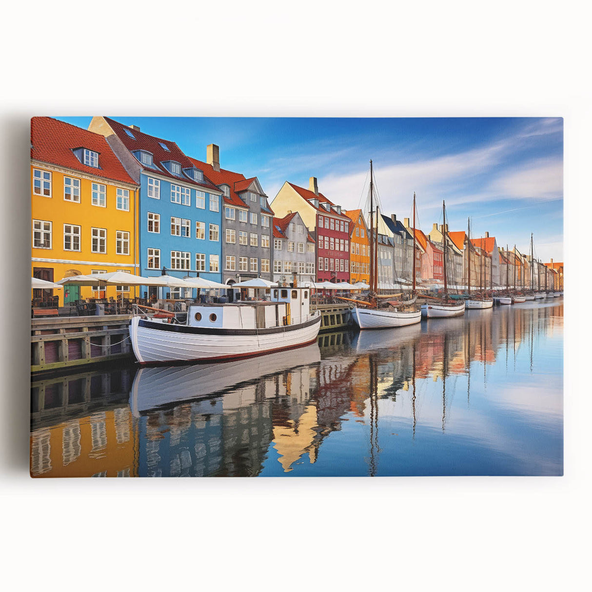 - High-quality print of Copenhagen’s colorful harbor and boats