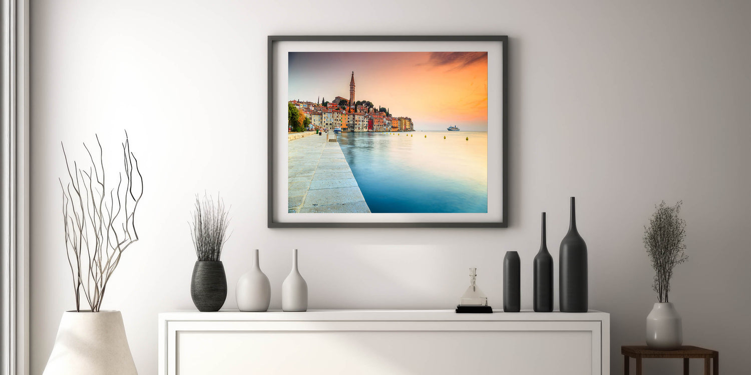 Introducing the "Croatian Landscape Art - Rovinj Waterfront Sunset Print," a breathtaking portrayal of Rovinj's vibrant waterfront as the sun sets, casting a warm glow over the historic town. This canvas print captures the essence of Croatian beauty and the tranquil ambiance of the Adriatic coast.