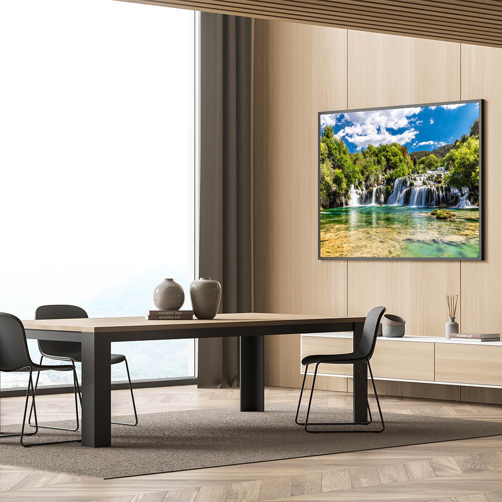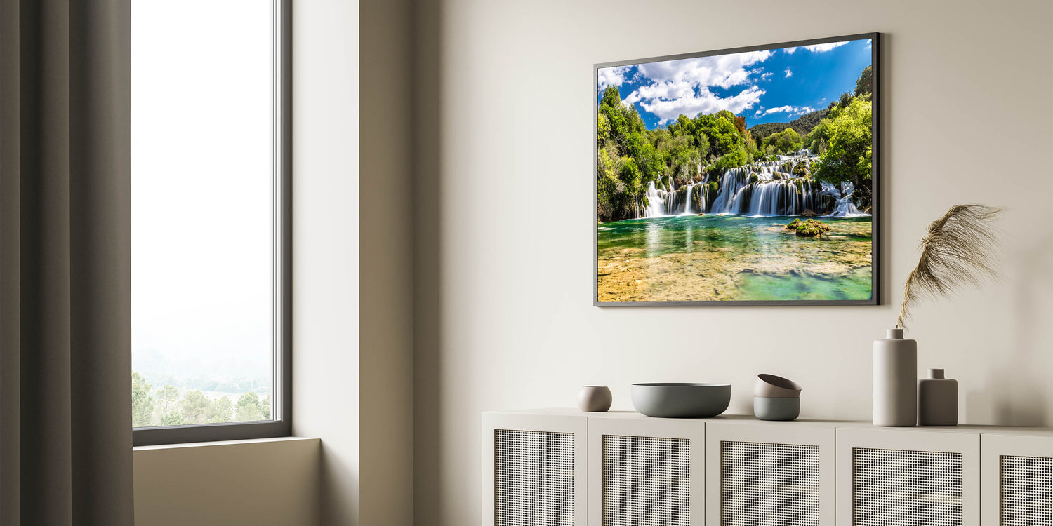 Introducing "Croatian Nature Art - Tranquil Waterfall Landscape Print," a stunning depiction of Croatia’s natural splendor. This canvas captures the serene beauty of one of Croatia's majestic waterfalls, nestled amidst lush greenery under a clear blue sky.