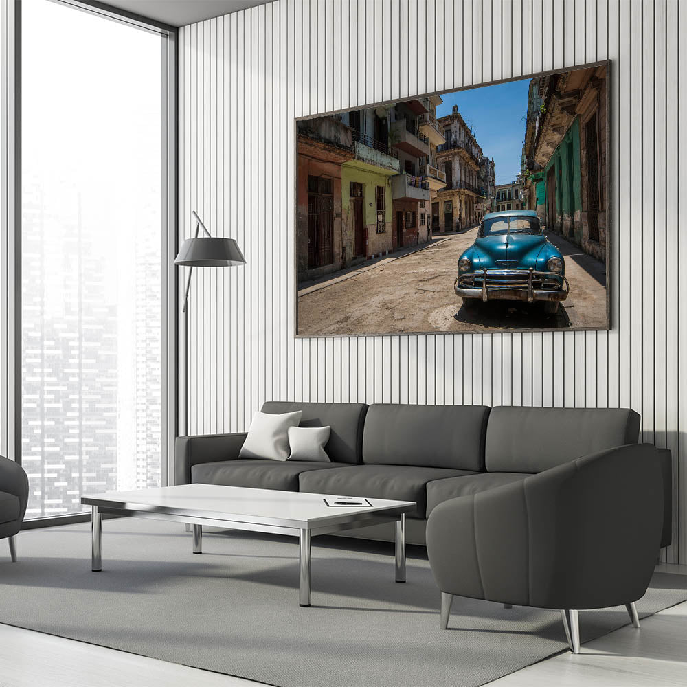 - Depicts a classic vintage car parked on a quiet Havana street, showcasing Cuban heritage wall decor.