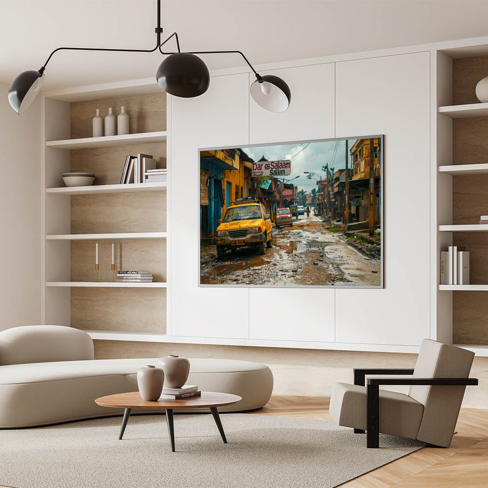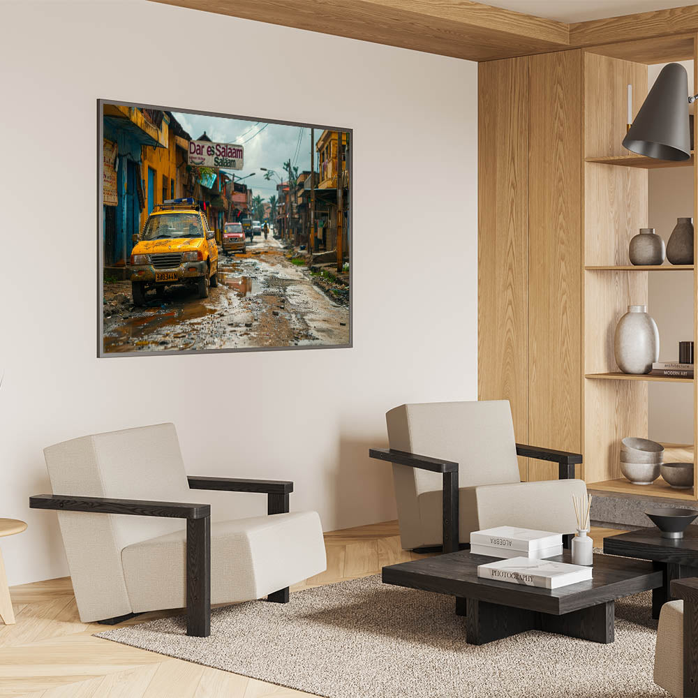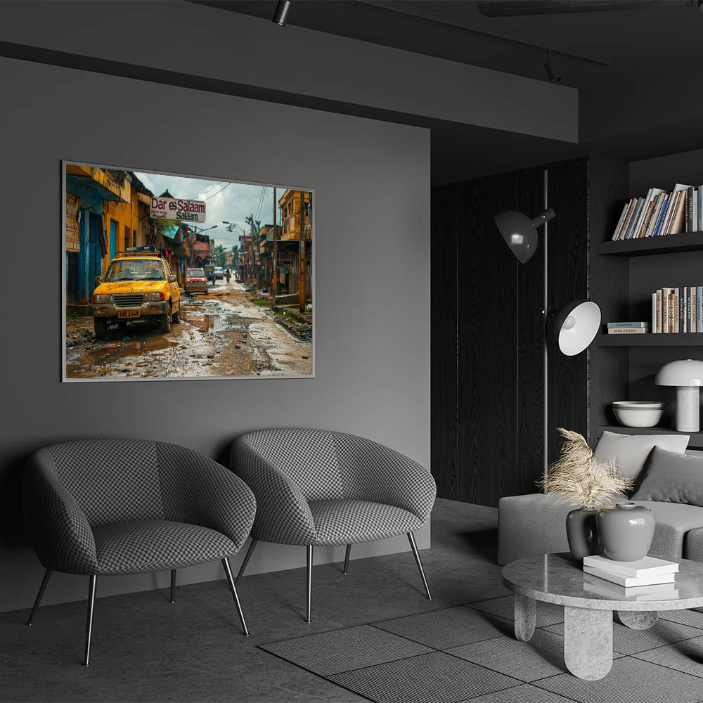 Capture the raw, vibrant energy of Tanzania’s largest city with this Dar es Salaam Street Scene Wall Art. This artwork features a bustling street, showcasing the everyday life of the city, from its colorful buildings to the muddy roads lined with cars. The detailed depiction of this urban landscape offers a unique glimpse into the heart of Dar es Salaam, making it perfect for lovers of travel, culture, and urban photography.