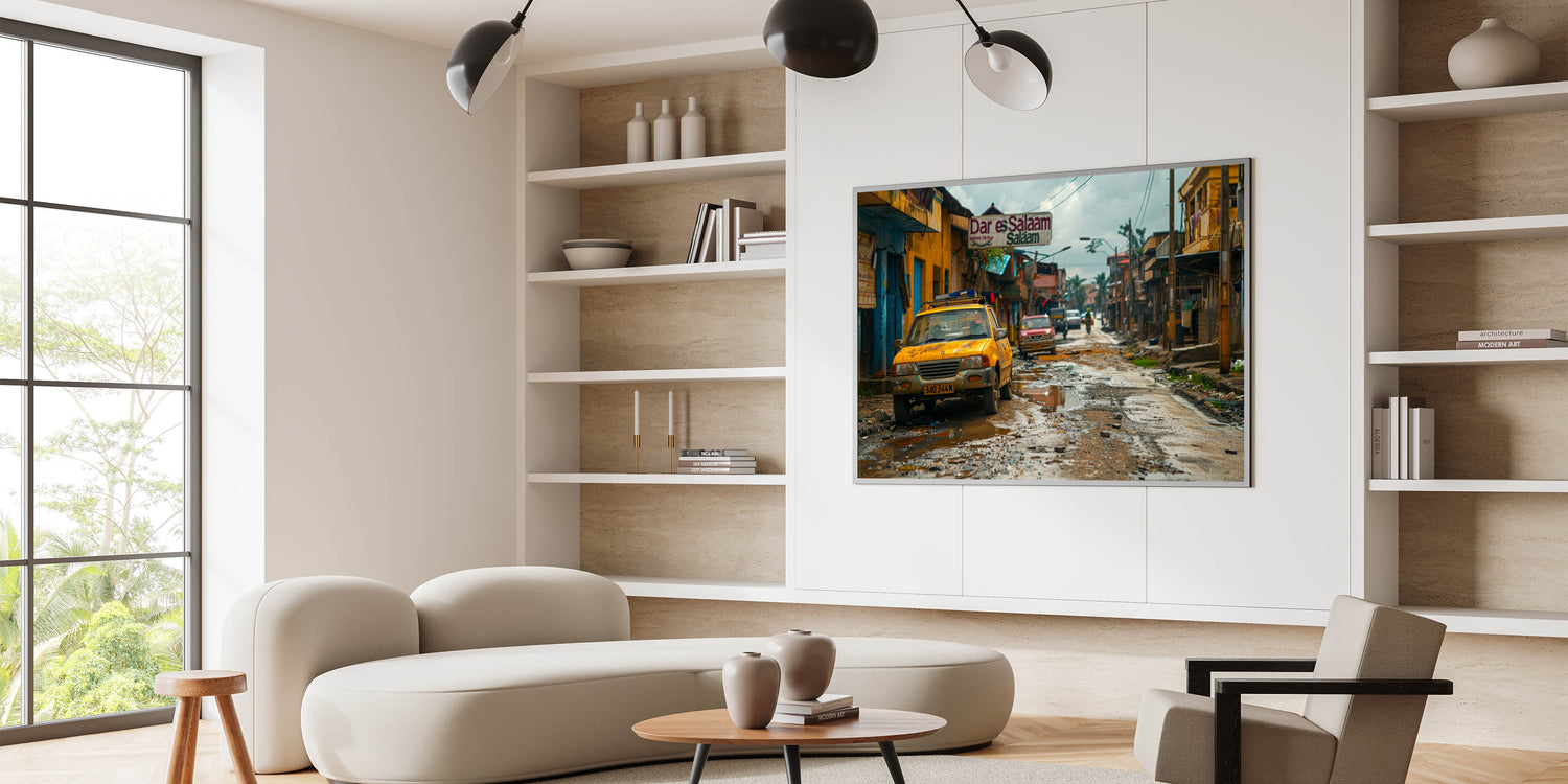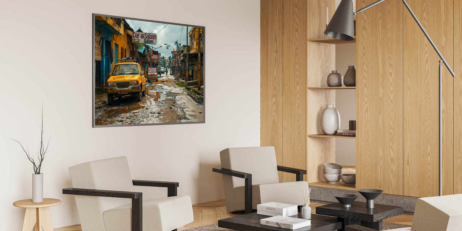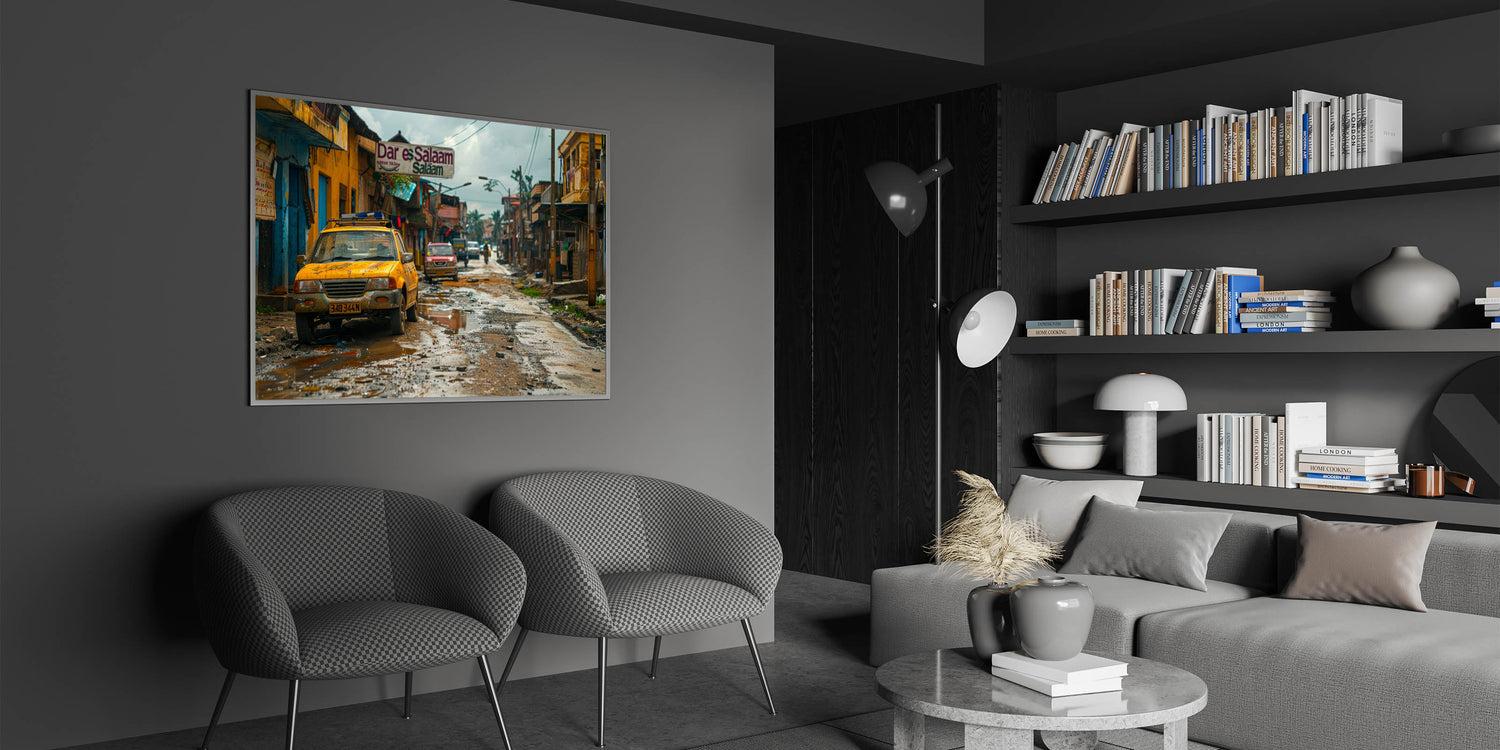 Capture the raw, vibrant energy of Tanzania’s largest city with this Dar es Salaam Street Scene Wall Art. This artwork features a bustling street, showcasing the everyday life of the city, from its colorful buildings to the muddy roads lined with cars. The detailed depiction of this urban landscape offers a unique glimpse into the heart of Dar es Salaam, making it perfect for lovers of travel, culture, and urban photography.