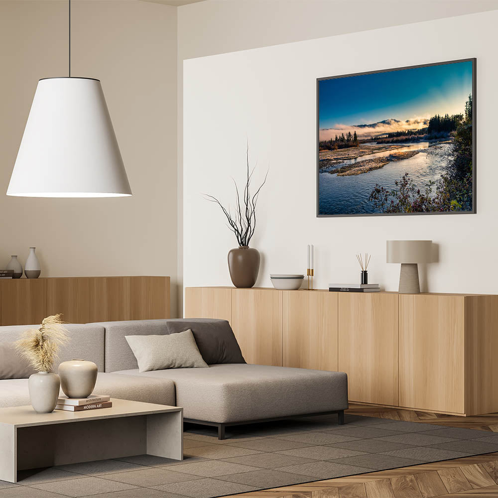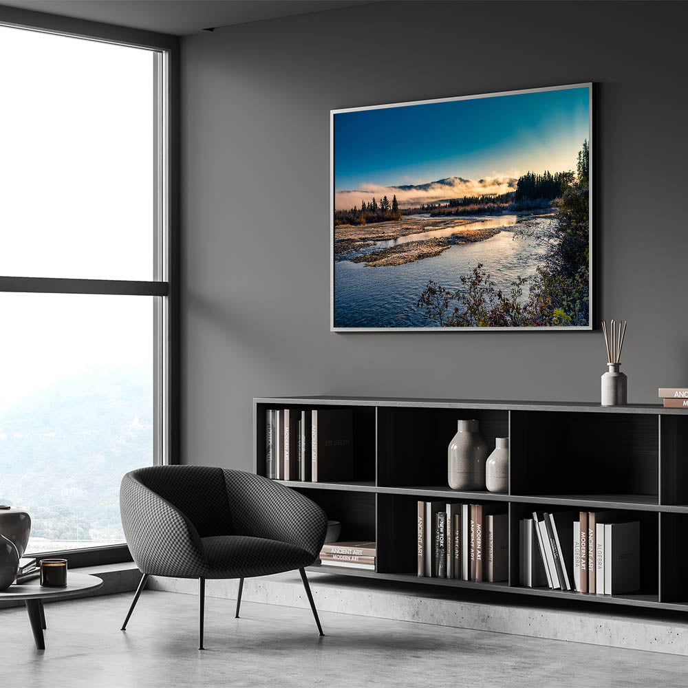 Awaken to the peaceful ambiance of the Yukon with our 'Dawn at Yukon River - Misty Morning Canvas'. This artwork captures the first light of dawn as it illuminates a gentle river, shrouded in morning mist, with distant mountains as a majestic backdrop.