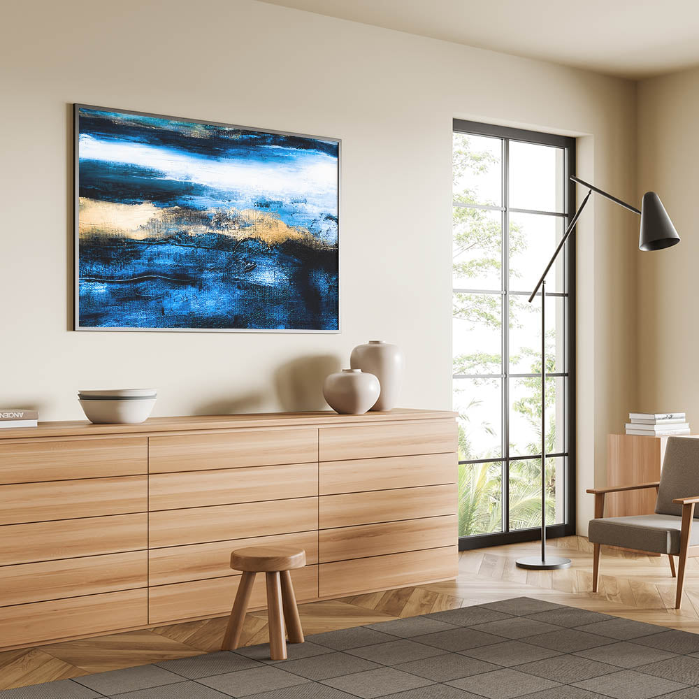 Add a touch of luxury and depth to your home or office with our Deep Blue and Gold Abstract Line Art Canvas. Order now and bring the beauty of high-quality abstract art into your space.