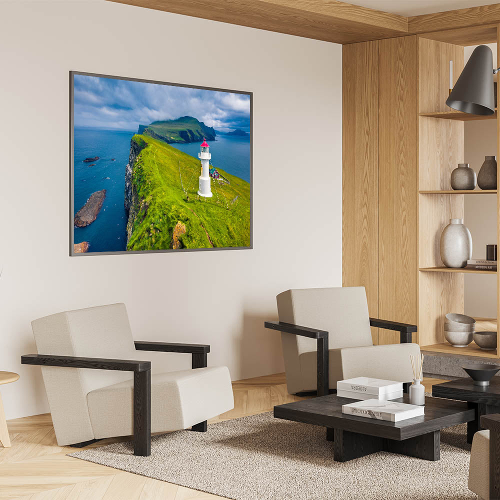 This breathtaking Denmark wall art captures the dramatic coastal scenery of Denmark, featuring a bright white lighthouse set against the vibrant green cliffs and deep blue waters. The sweeping landscape and striking colors make this a standout piece for any Nordic wall decor. Ideal for lovers of Danish landscape paintings and Scandinavian decor, this artwork brings the natural beauty of Denmark’s rugged coastline into your home.