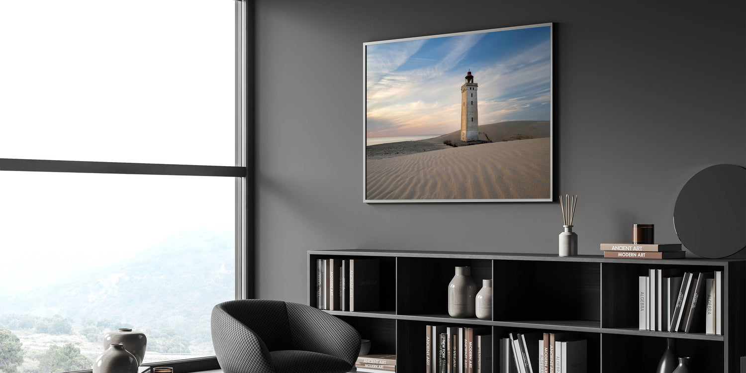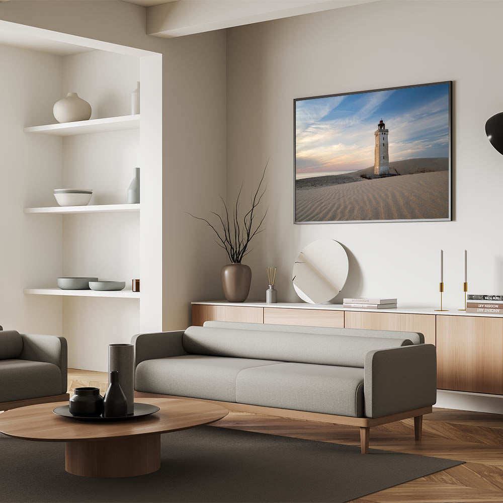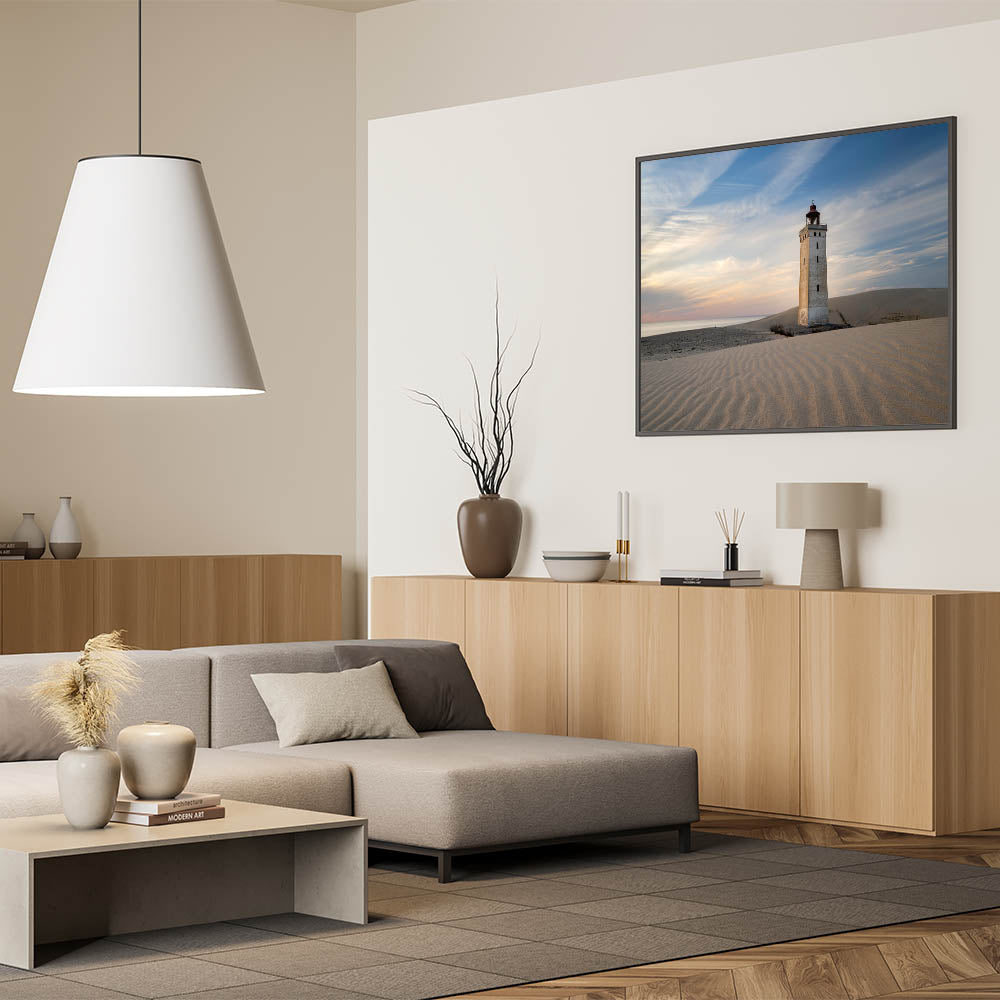 This striking Denmark wall art captures the peaceful solitude of a lighthouse standing tall on a windswept dune, bathed in the soft hues of a dusky sky. The smooth ripples of the sand and the tranquil horizon create a calming composition, perfect for enhancing any space with Scandinavian decor. This Denmark photography piece is a tribute to the quiet beauty of the Danish coastline, making it an ideal addition for those who love Nordic wall decor or coastal-inspired interiors.