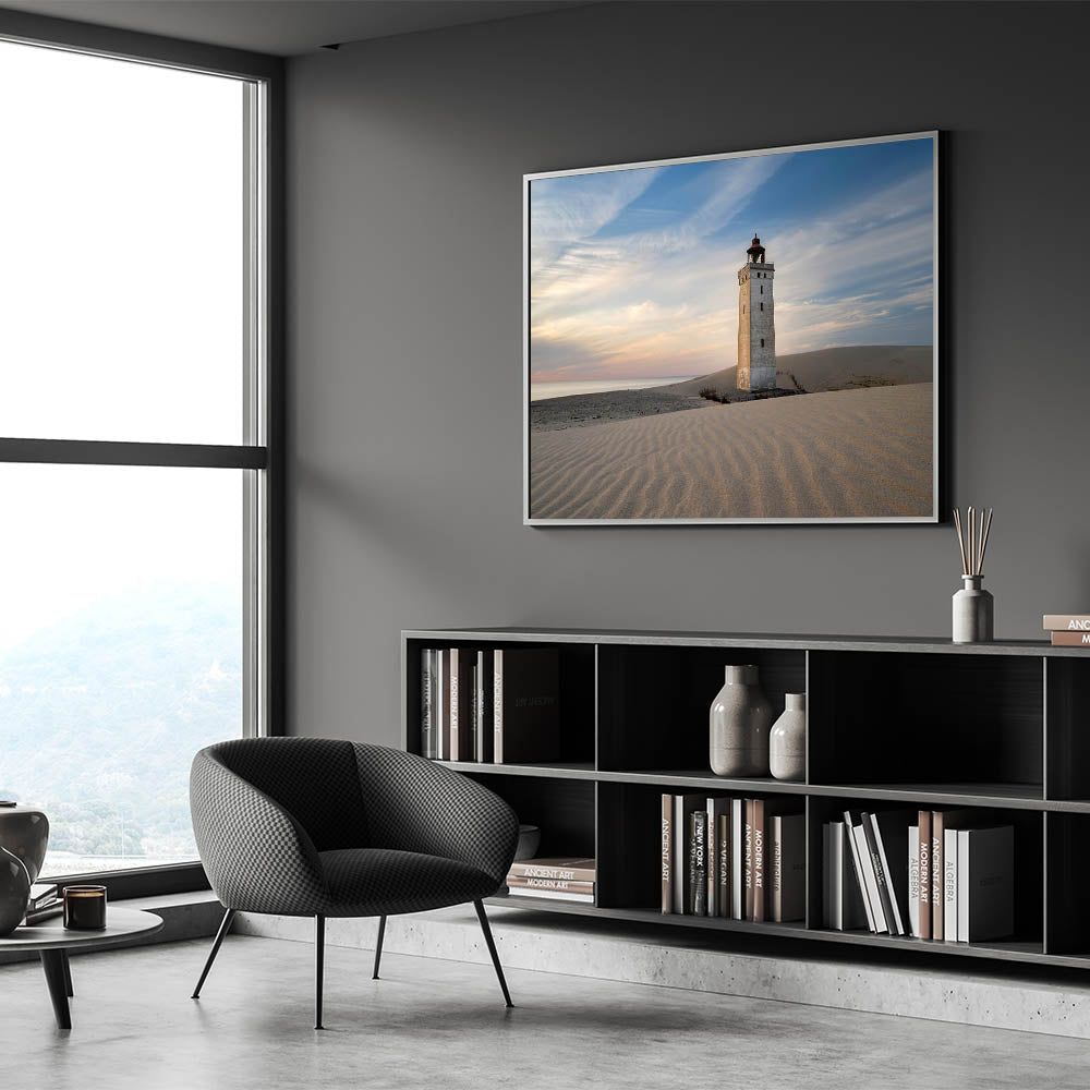 - High-quality print of a Danish lighthouse on coastal sand dunes