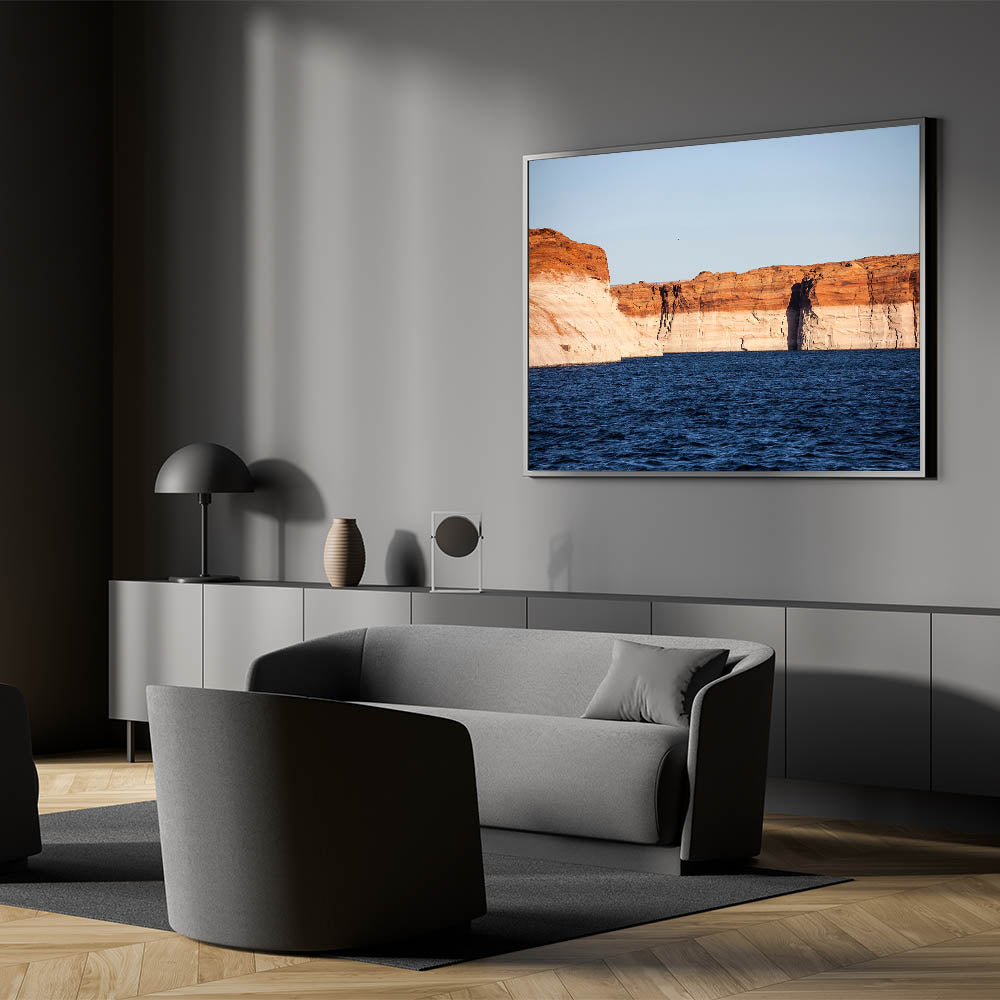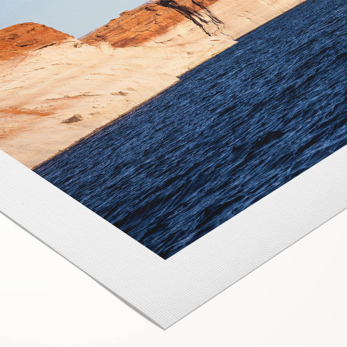 Capture the rugged beauty of Lake Powell's stunning landscapes with this dramatic wall art, featuring the striking red and white cliffs reflected against the deep blue waters. This Lake Powell canvas art is perfect for adding a bold statement to your decor, while also evoking the serene atmosphere of one of Arizona’s most breathtaking natural wonders. Whether you’re looking to decorate your home, office, or gallery space, this piece brings the stunning Lake Powell views to life.
