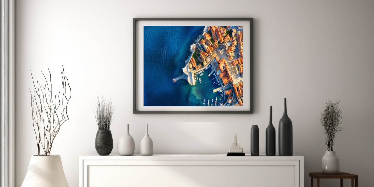 Explore the timeless beauty of Dubrovnik with our "Historic Adriatic Harbor View," a standout piece in our Croatian Landscape Art collection. This aerial photograph captures the majestic essence of Dubrovnik’s old town, surrounded by the stunning azure waters of the Adriatic Sea, illustrating a harmonious blend of history and nature.