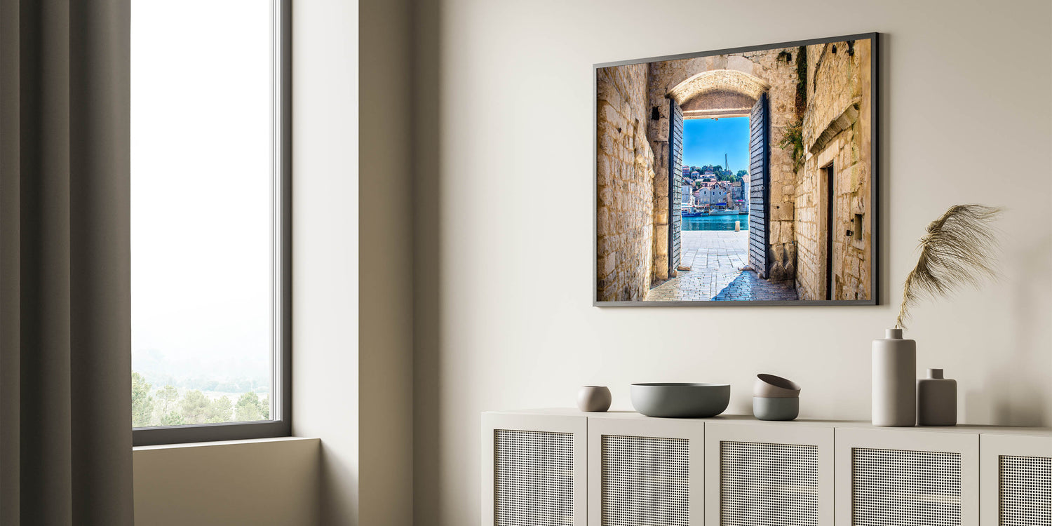 Unveil the beauty of Dubrovnik through our "Historic Harbor Archway View Print," a stunning depiction that frames the vibrant harbor through an ancient stone arch, capturing the essence of this iconic Croatian city.