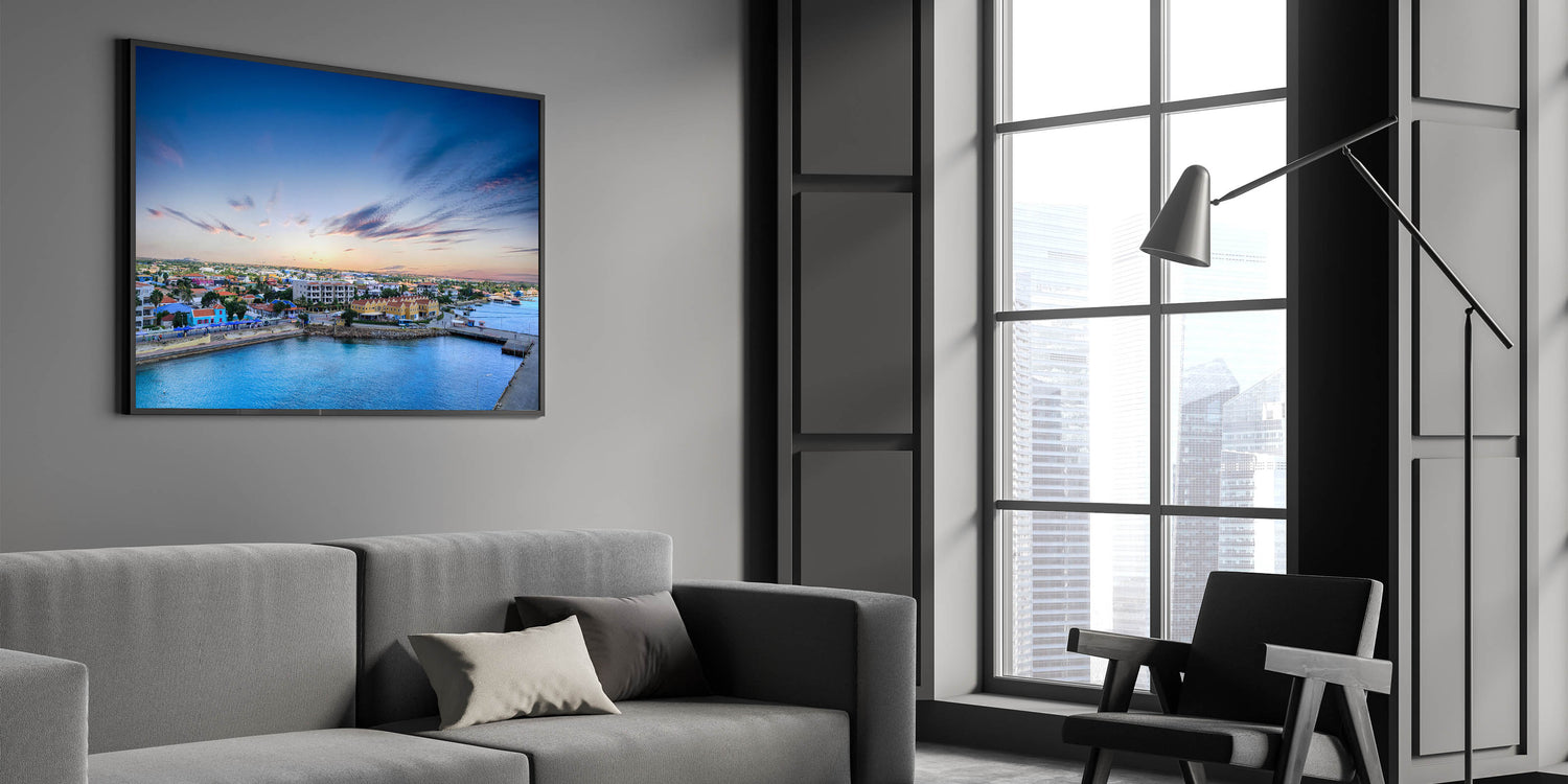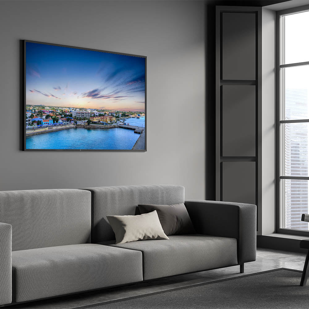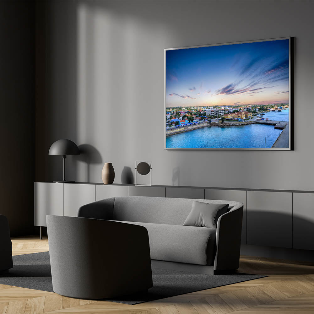 This vibrant aerial view of Aruba’s coastal town captures the essence of the island's lively and colorful architecture. Set against the backdrop of a serene ocean and a soft, pastel sky, this piece brings the charm of the Dutch Caribbean straight into your home. The colorful houses, peaceful harbor, and gently streaked clouds in the sky evoke a sense of warmth and tranquility, making this artwork a perfect addition to any room in need of a cheerful, island-inspired atmosphere.