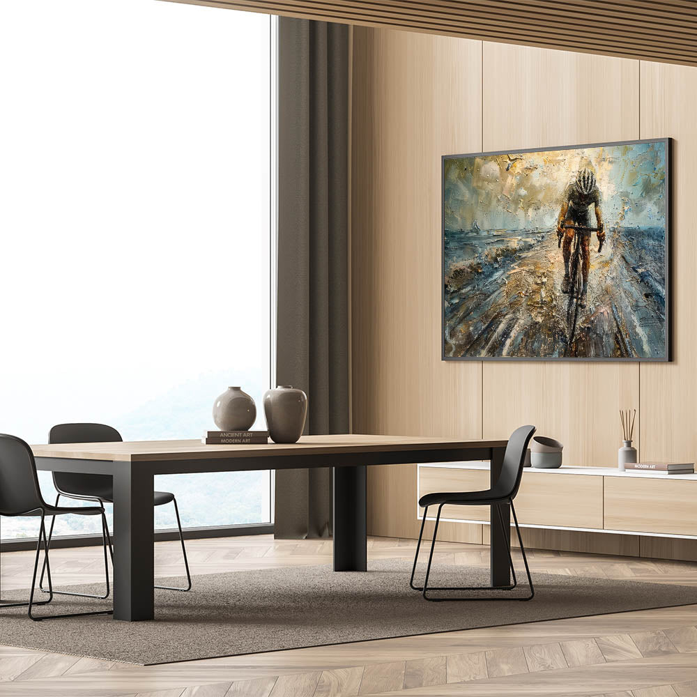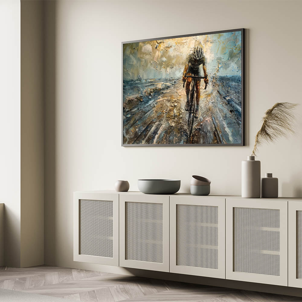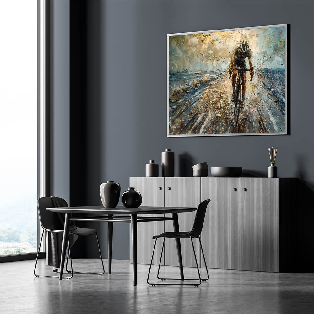 Unleash the power and intensity of cycling with this dynamic cyclist wall art. This striking piece features a powerful depiction of a cyclist in motion, rendered in an abstract style that captures the speed, energy, and determination of the sport. The textured brushstrokes and bold color contrasts create a sense of movement, making this cycling-themed art perfect for those who love the thrill of the race and the beauty of athleticism.