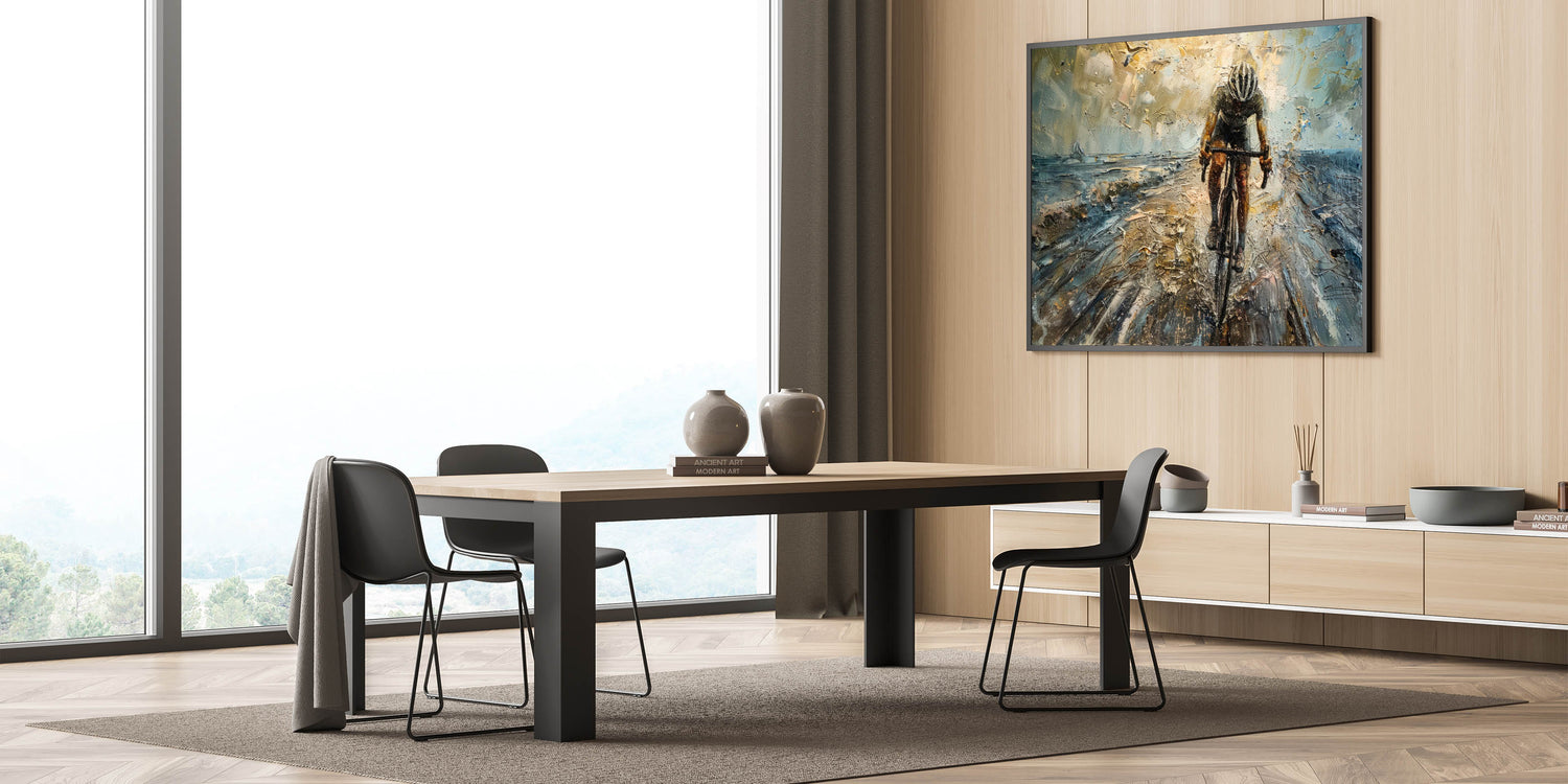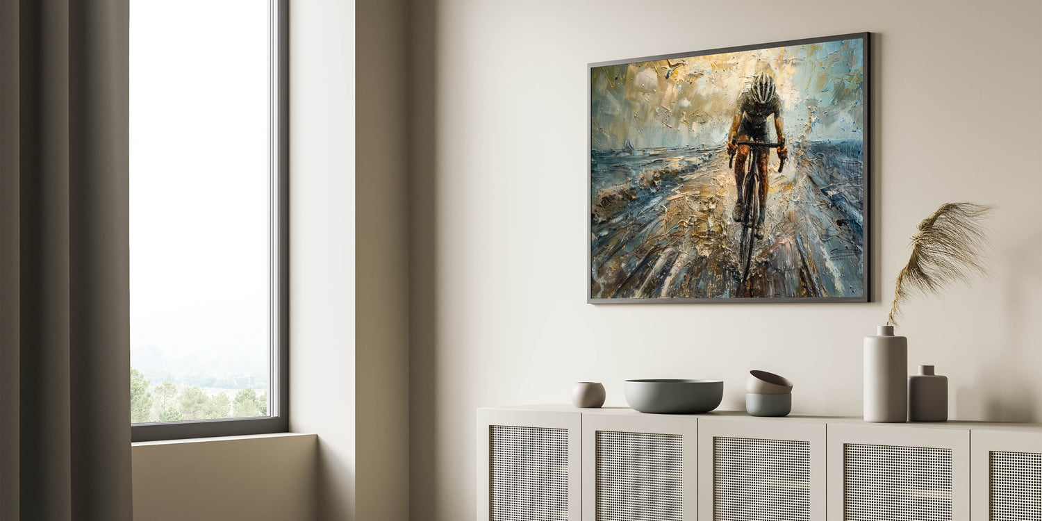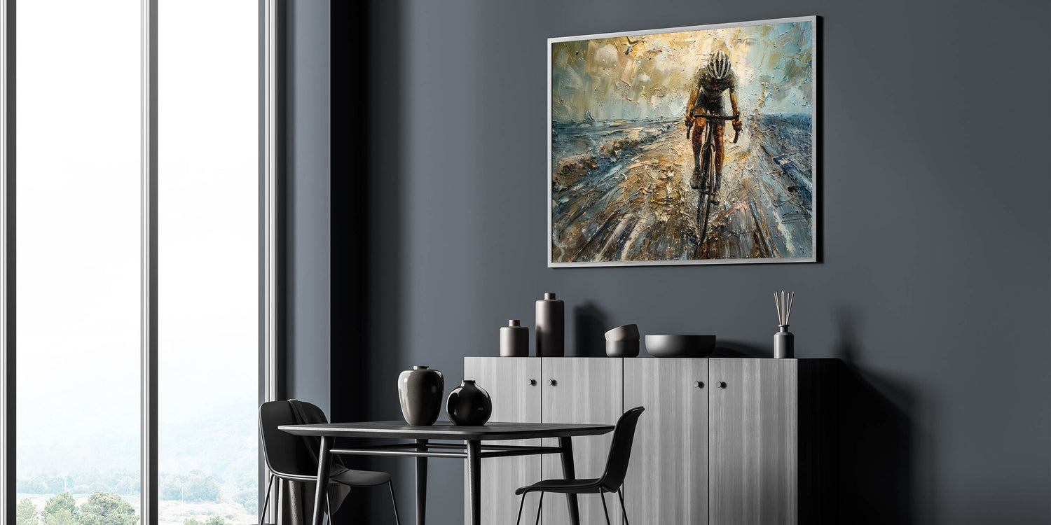 Unleash the power and intensity of cycling with this dynamic cyclist wall art. This striking piece features a powerful depiction of a cyclist in motion, rendered in an abstract style that captures the speed, energy, and determination of the sport. The textured brushstrokes and bold color contrasts create a sense of movement, making this cycling-themed art perfect for those who love the thrill of the race and the beauty of athleticism.