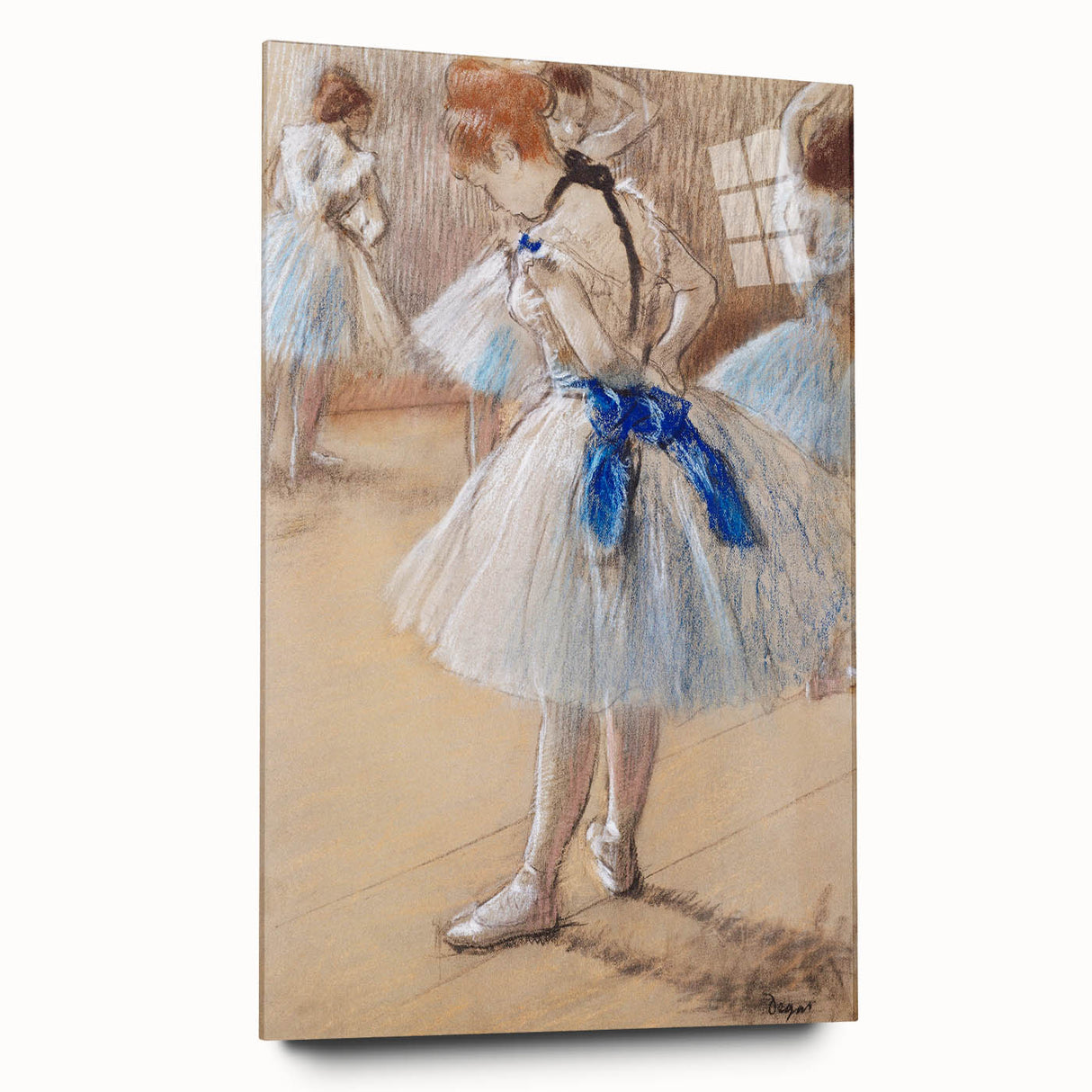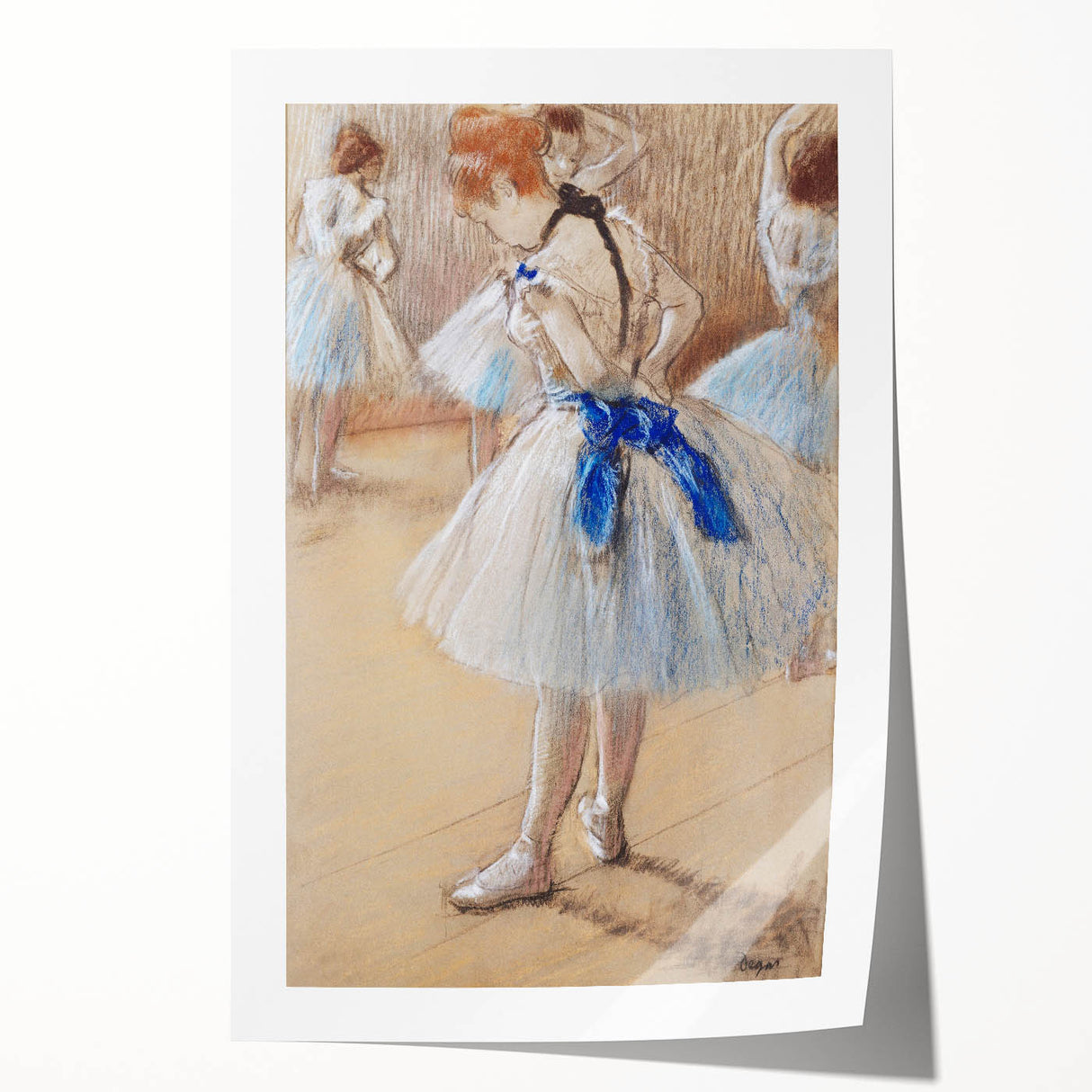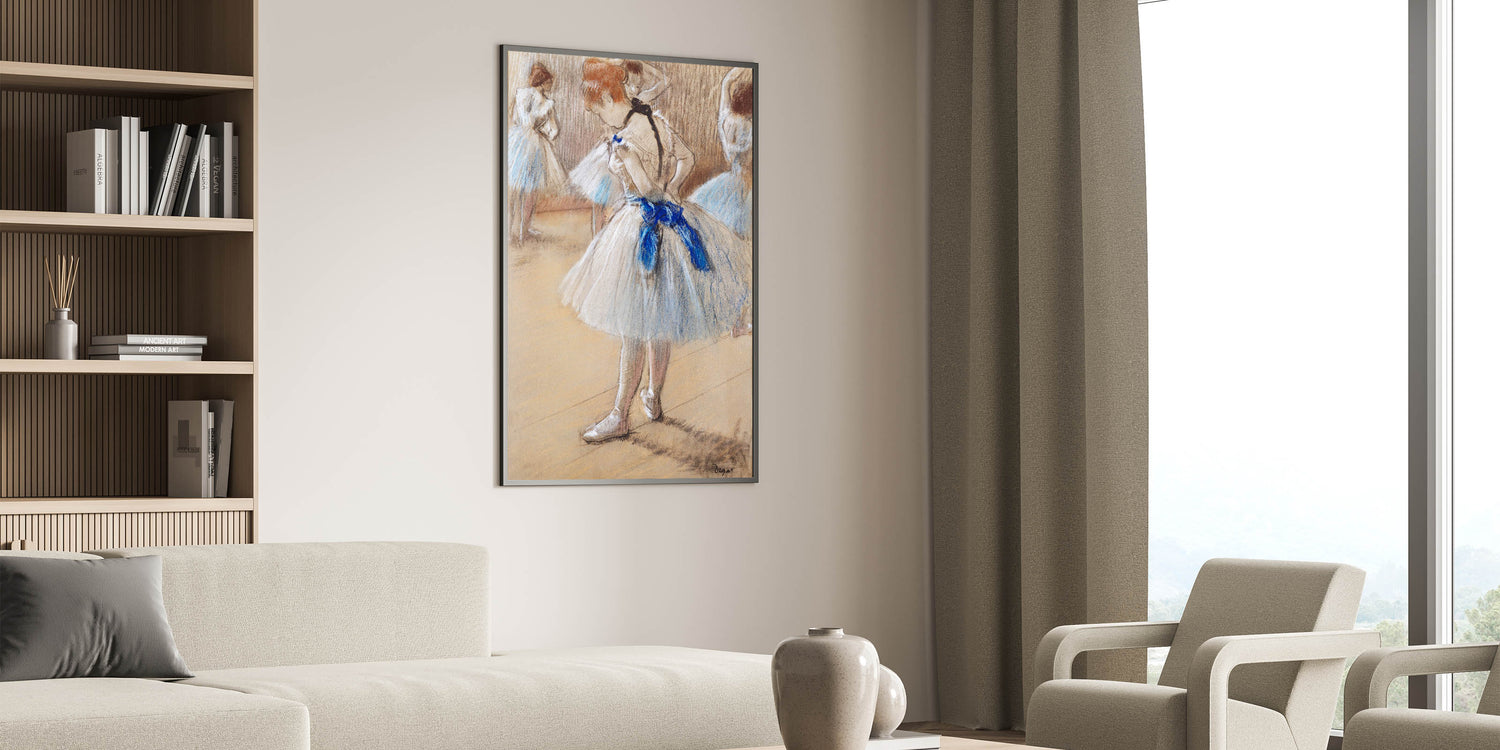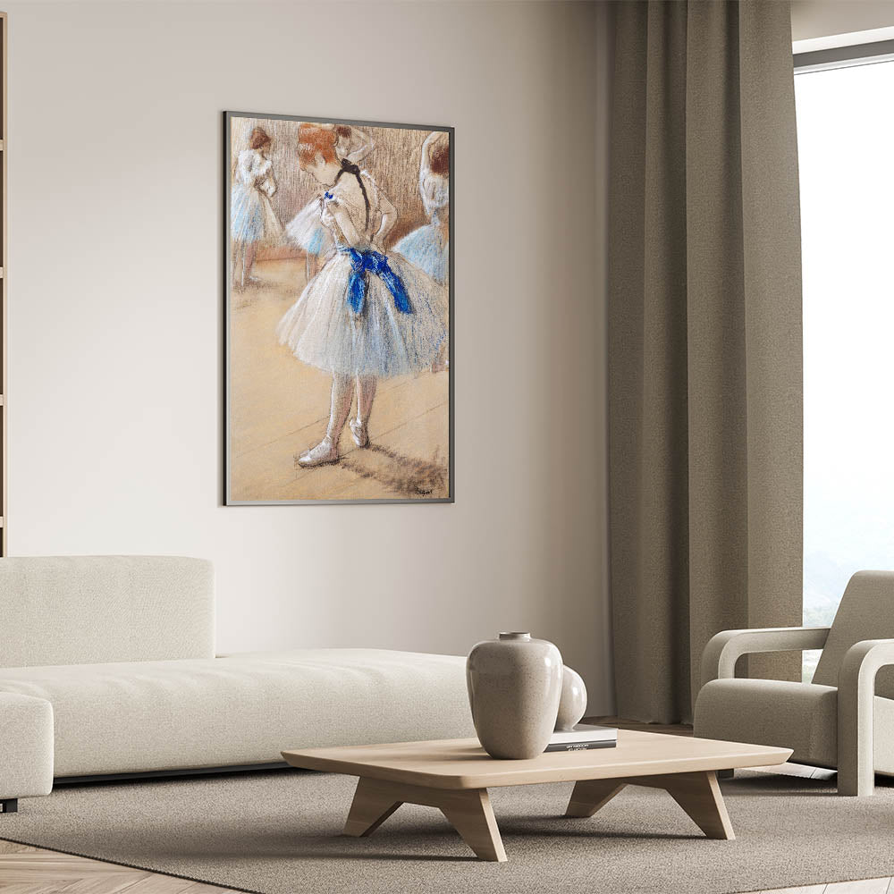 This famous Edgar Degas painting captures a beautifully intimate moment in the life of a ballet dancer, highlighting the poise and grace of the art form. The soft, delicate pastel tones evoke the quiet focus of dancers preparing behind the scenes. As part of our Impressionist art collection, this reproduction showcases Degas' mastery in portraying movement, elegance, and the subtle beauty of everyday ballet life.