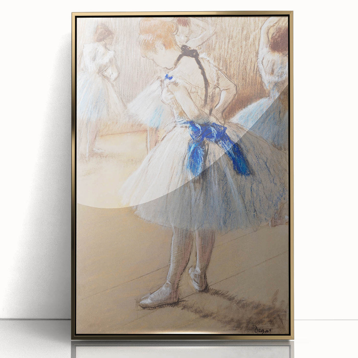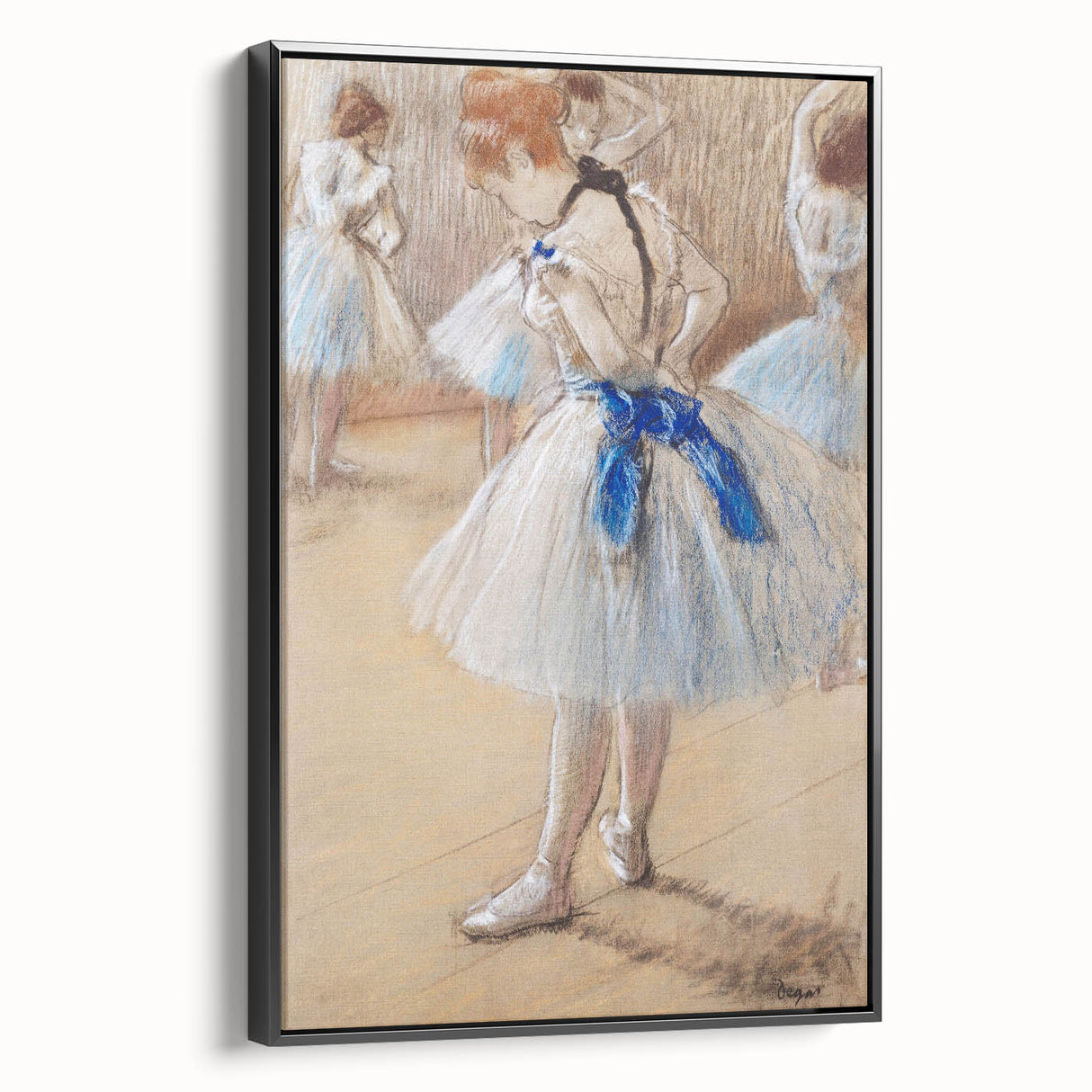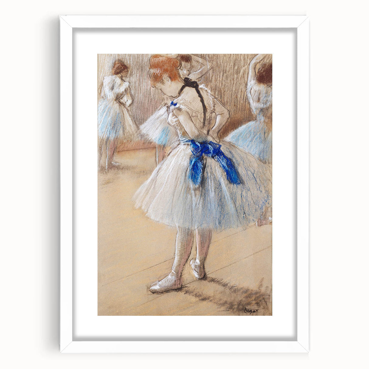 This famous Edgar Degas painting captures a beautifully intimate moment in the life of a ballet dancer, highlighting the poise and grace of the art form. The soft, delicate pastel tones evoke the quiet focus of dancers preparing behind the scenes. As part of our Impressionist art collection, this reproduction showcases Degas' mastery in portraying movement, elegance, and the subtle beauty of everyday ballet life.
