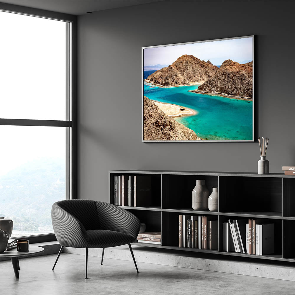 Escape to the tranquil shores of the Red Sea with this stunning wall art, featuring a breathtaking coastal landscape of turquoise waters and rugged mountains. This artwork captures the serene beauty of Egypt's coastal regions, where the vibrant blue of the sea contrasts with the earthy tones of the rocky terrain. Perfect for those who love nature and seascapes, this piece brings the calming presence of the ocean into any space.