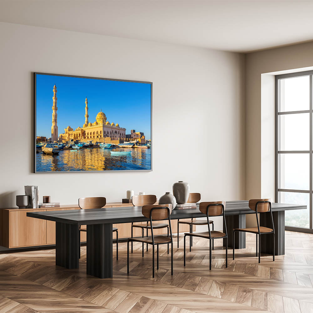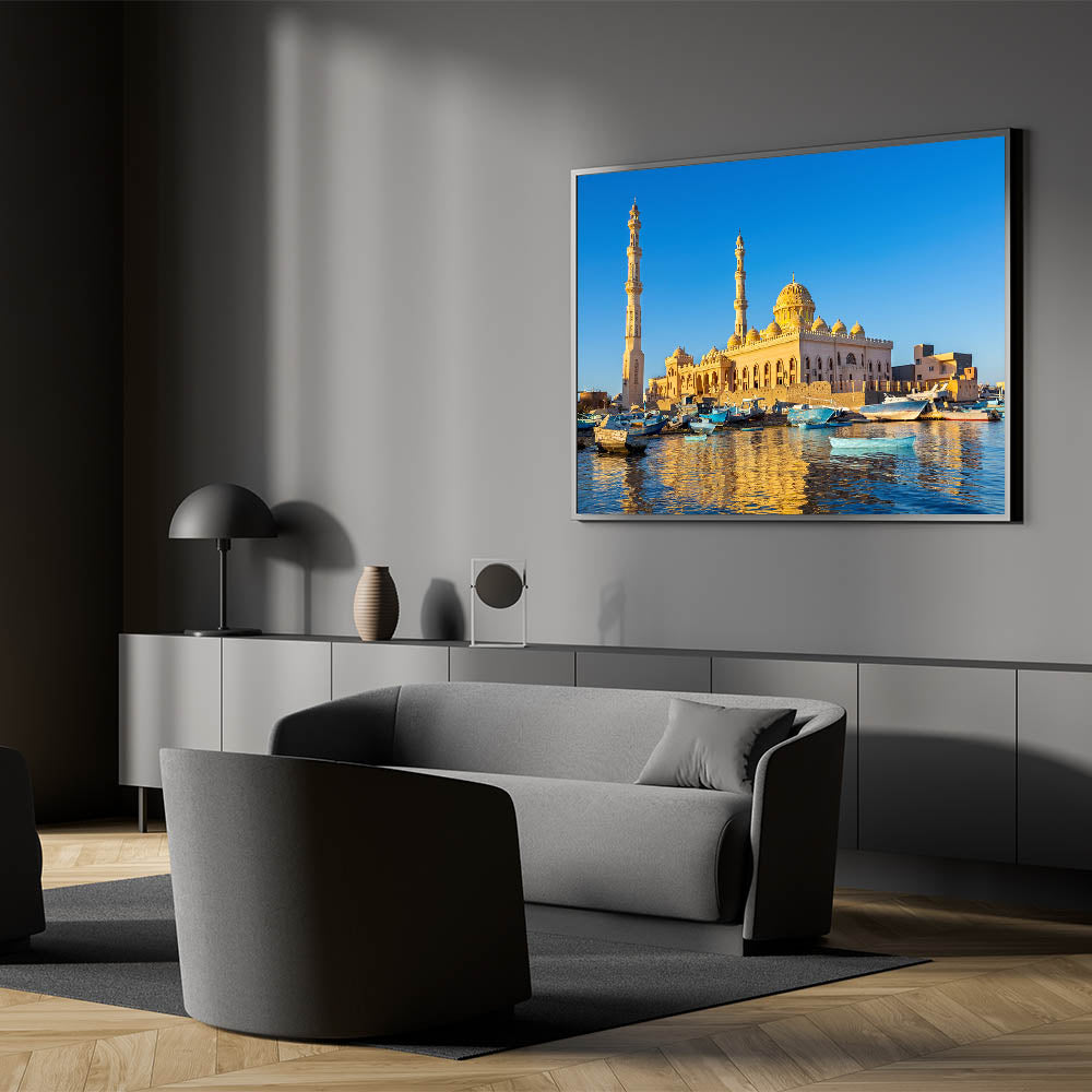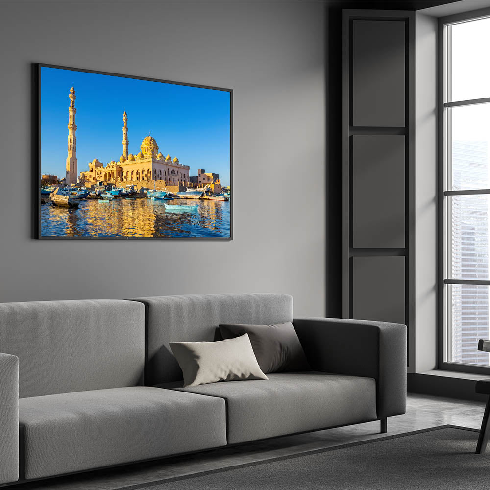 Capture the serene beauty of Egypt with this stunning wall art featuring a picturesque mosque bathed in the golden light of sunset, reflected in the tranquil waters below. The charming boats anchored by the shore add a touch of life and movement to the scene, creating a harmonious blend of architecture and nature. This artwork is perfect for those who appreciate the cultural richness and natural beauty of Egypt, bringing a sense of peace and elegance into any space.