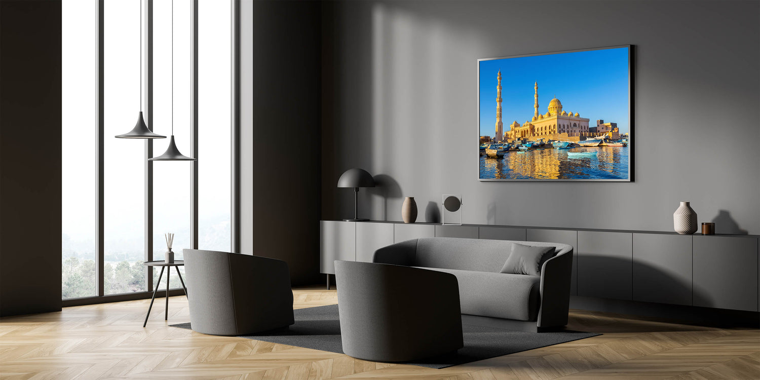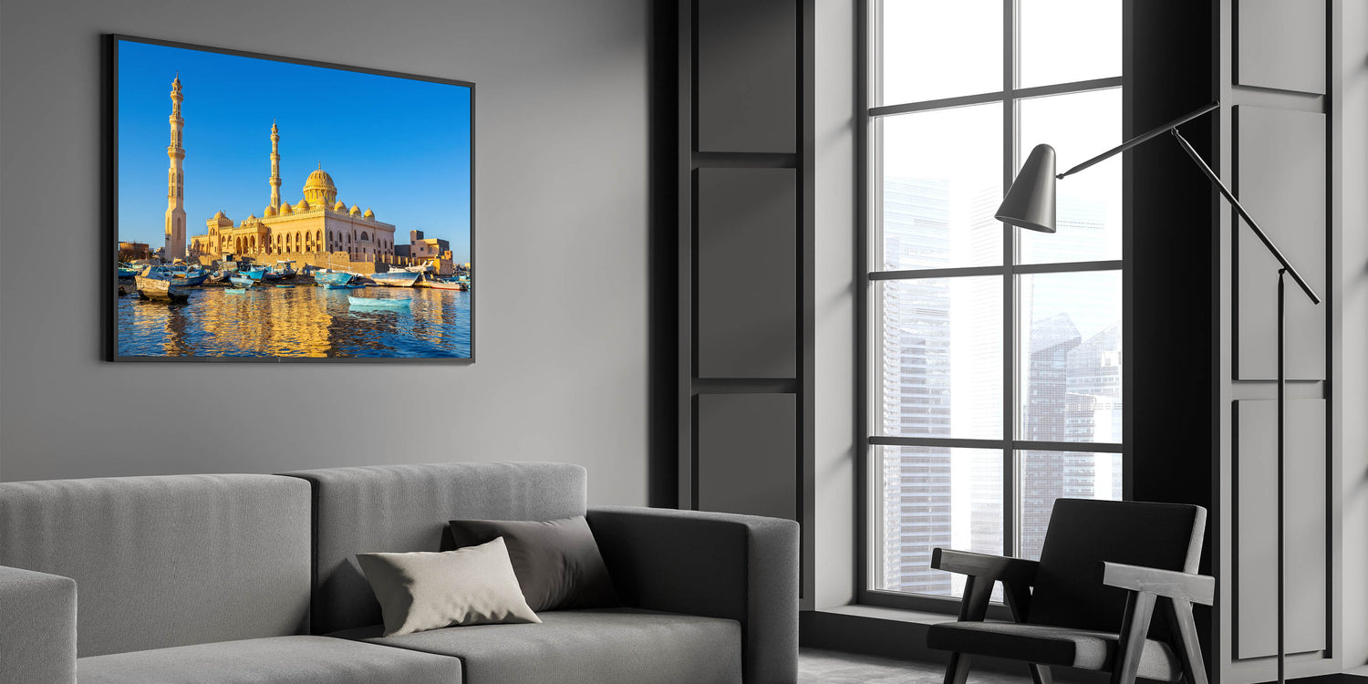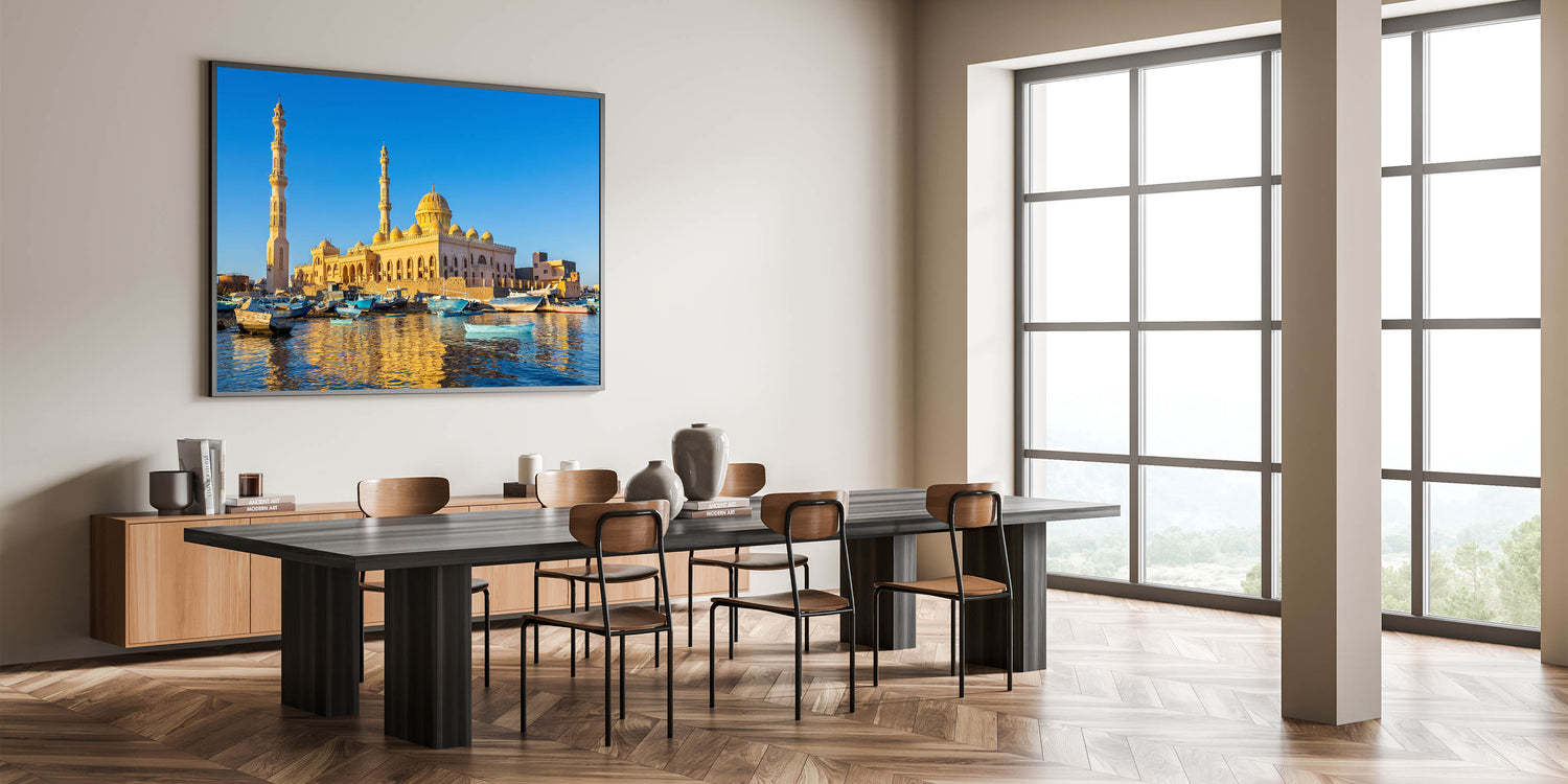 Capture the serene beauty of Egypt with this stunning wall art featuring a picturesque mosque bathed in the golden light of sunset, reflected in the tranquil waters below. The charming boats anchored by the shore add a touch of life and movement to the scene, creating a harmonious blend of architecture and nature. This artwork is perfect for those who appreciate the cultural richness and natural beauty of Egypt, bringing a sense of peace and elegance into any space.
