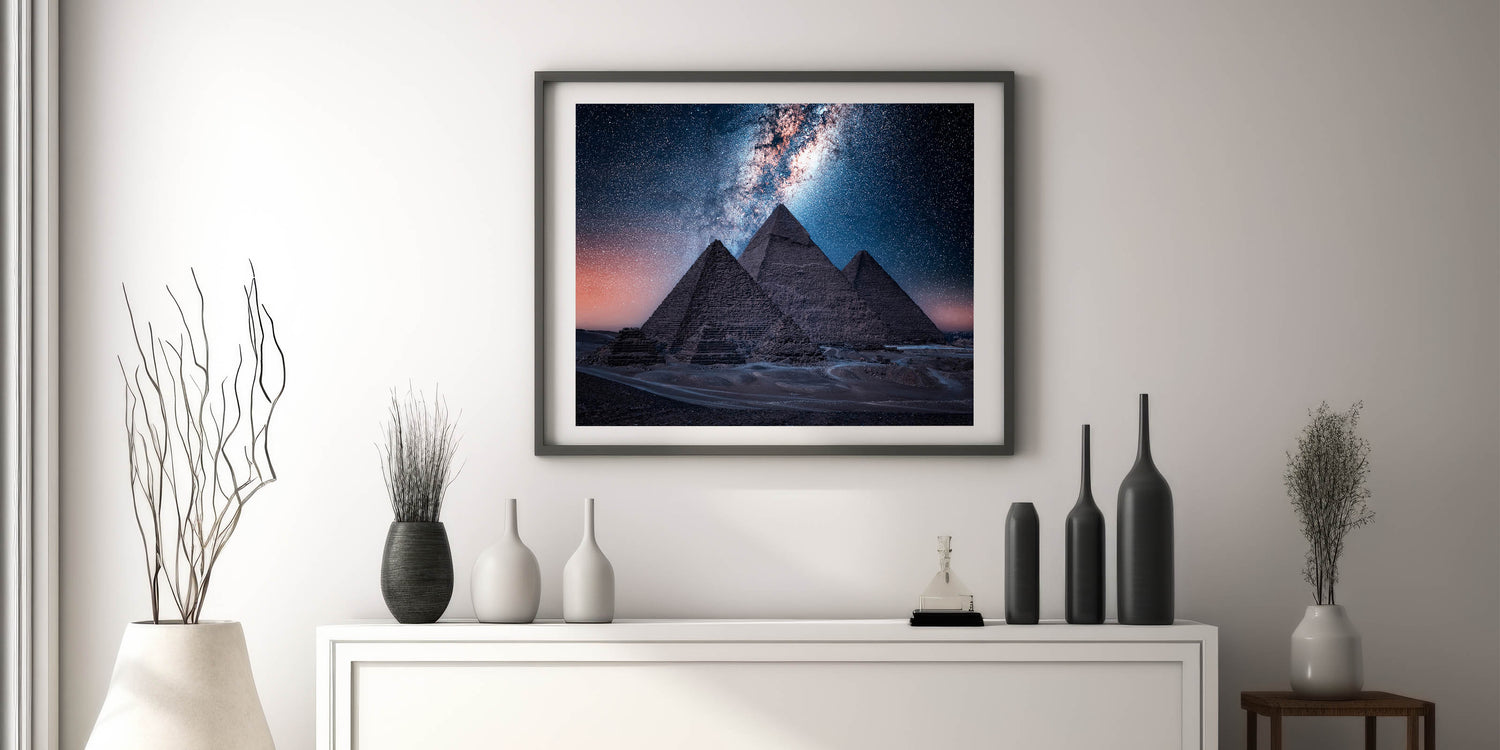 Experience the mystical beauty of Egypt with this breathtaking wall art featuring the iconic pyramids under the luminous Milky Way. This captivating image captures the grandeur of the ancient pyramids set against a dazzling night sky, creating a mesmerizing blend of earthly history and cosmic wonder. Perfect for those who are fascinated by the mysteries of the universe and the timelessness of Egypt.