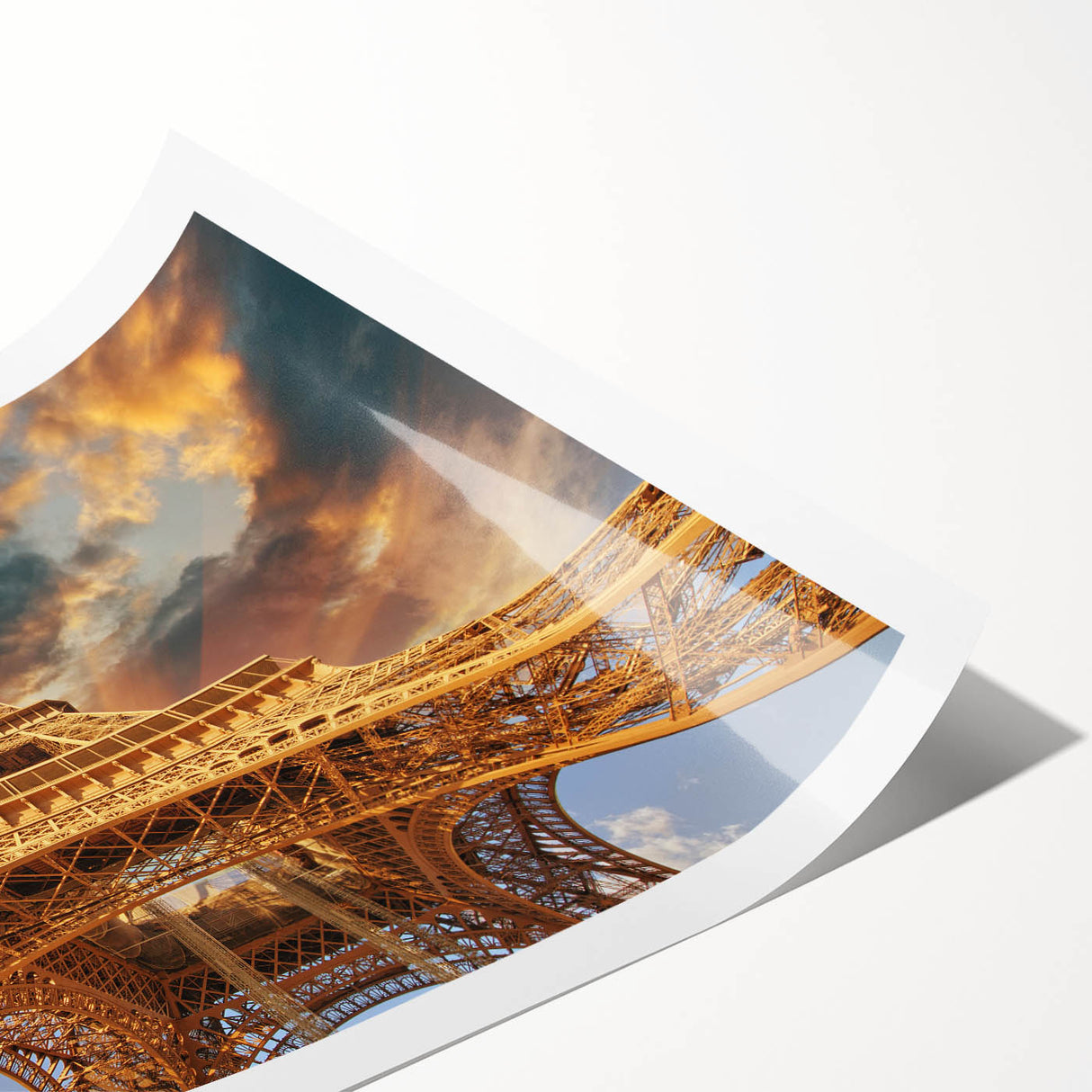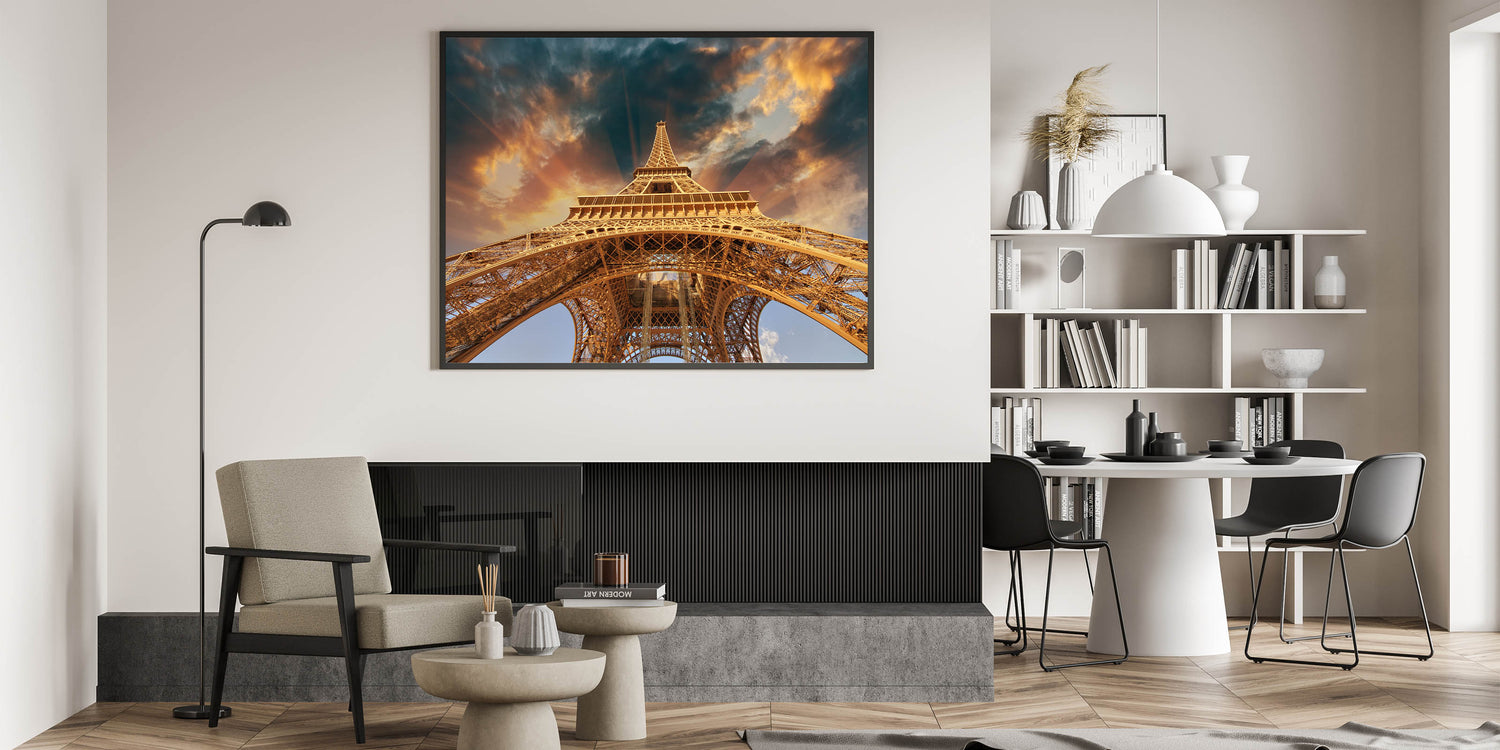 Bring the grandeur of the Eiffel Tower into your home with this stunning Paris wall art. This dramatic upward view of the Eiffel Tower, framed by a breathtaking sky, showcases the architectural marvel in all its glory. The warm golden hues of the structure contrast beautifully with the dramatic clouds, making this Paris cityscape artwork a true statement piece. Whether you're looking for high-quality Paris prints or a bold addition to your collection of romantic Paris art, this canvas delivers both elegance and impact.