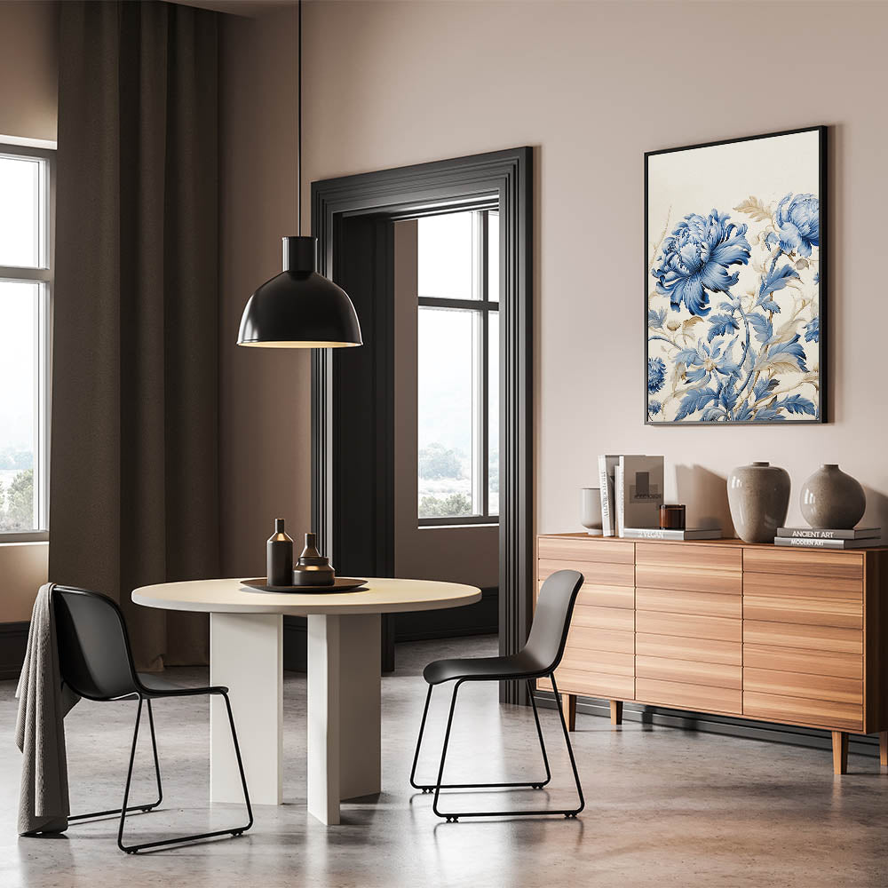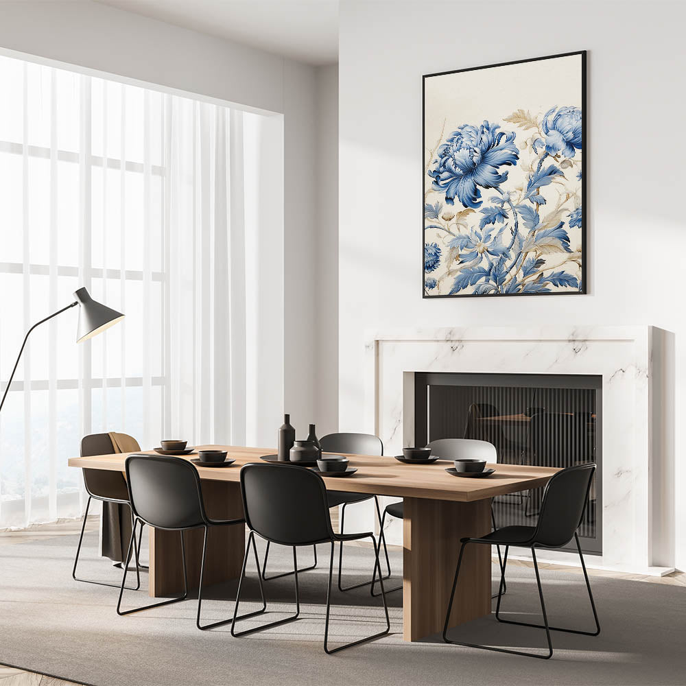 The blue botanical design offers a classic yet modern look, suitable for those who appreciate refined floral art. It brings a refreshing touch of nature to any setting, serving as a focal point or complementing existing decor with its sophisticated color palette.