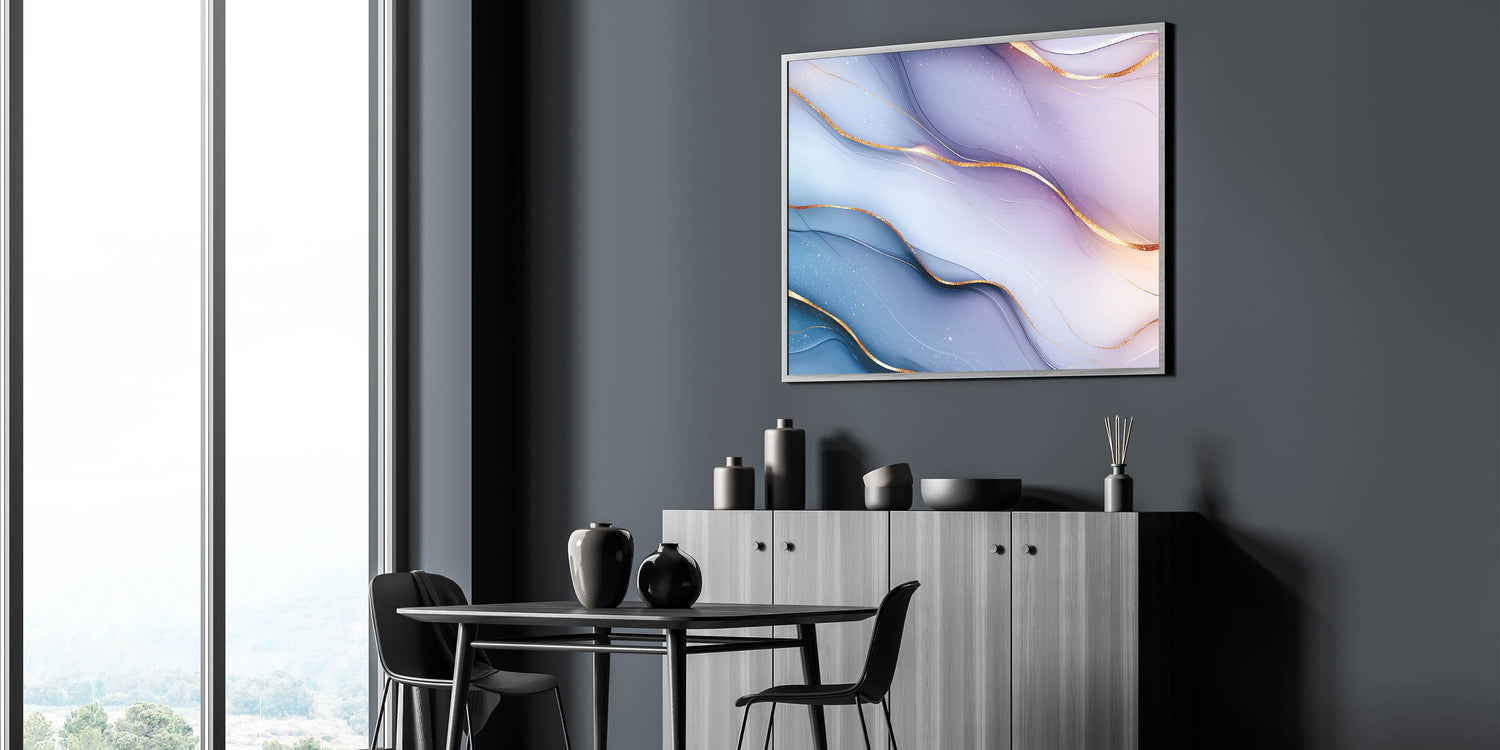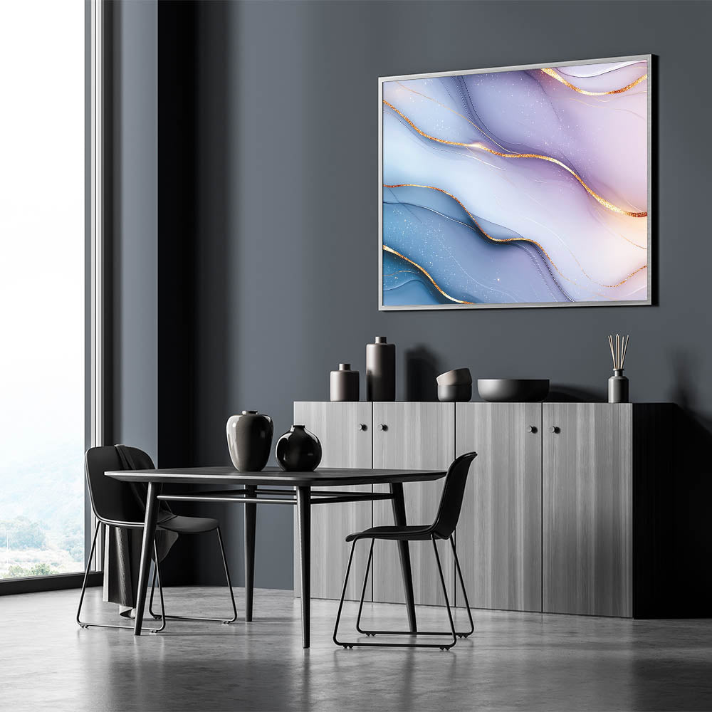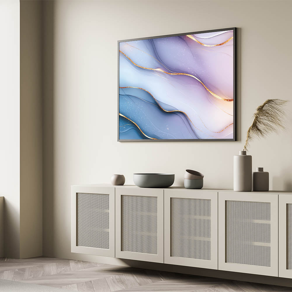 Immerse yourself in the soft elegance of this elegant abstract wall art, featuring delicate light blue and lilac hues accented with shimmering gold. The flowing gradients and intricate metallic details create a calming yet sophisticated aesthetic, making this premium abstract art piece for sophisticated interiors an ideal choice for contemporary decor.
