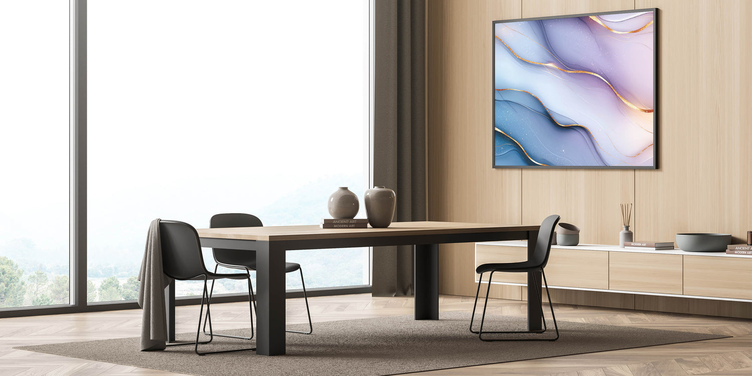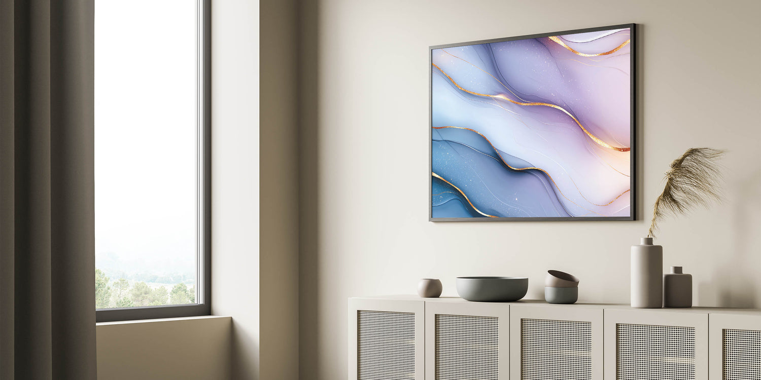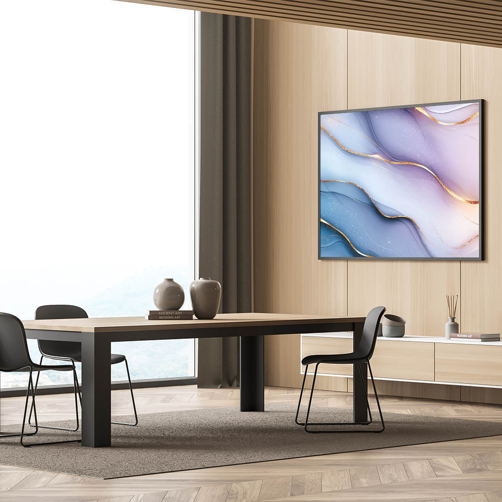 Immerse yourself in the soft elegance of this elegant abstract wall art, featuring delicate light blue and lilac hues accented with shimmering gold. The flowing gradients and intricate metallic details create a calming yet sophisticated aesthetic, making this premium abstract art piece for sophisticated interiors an ideal choice for contemporary decor.
