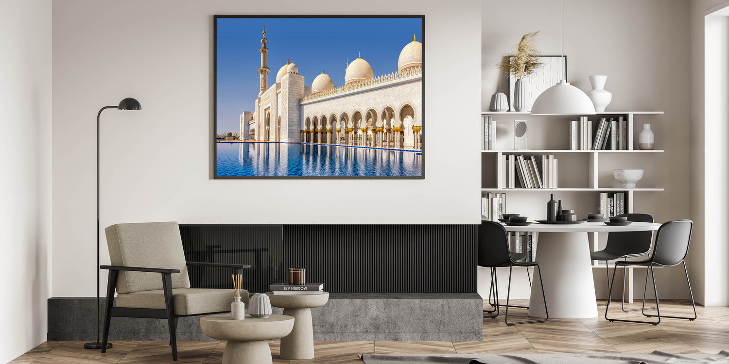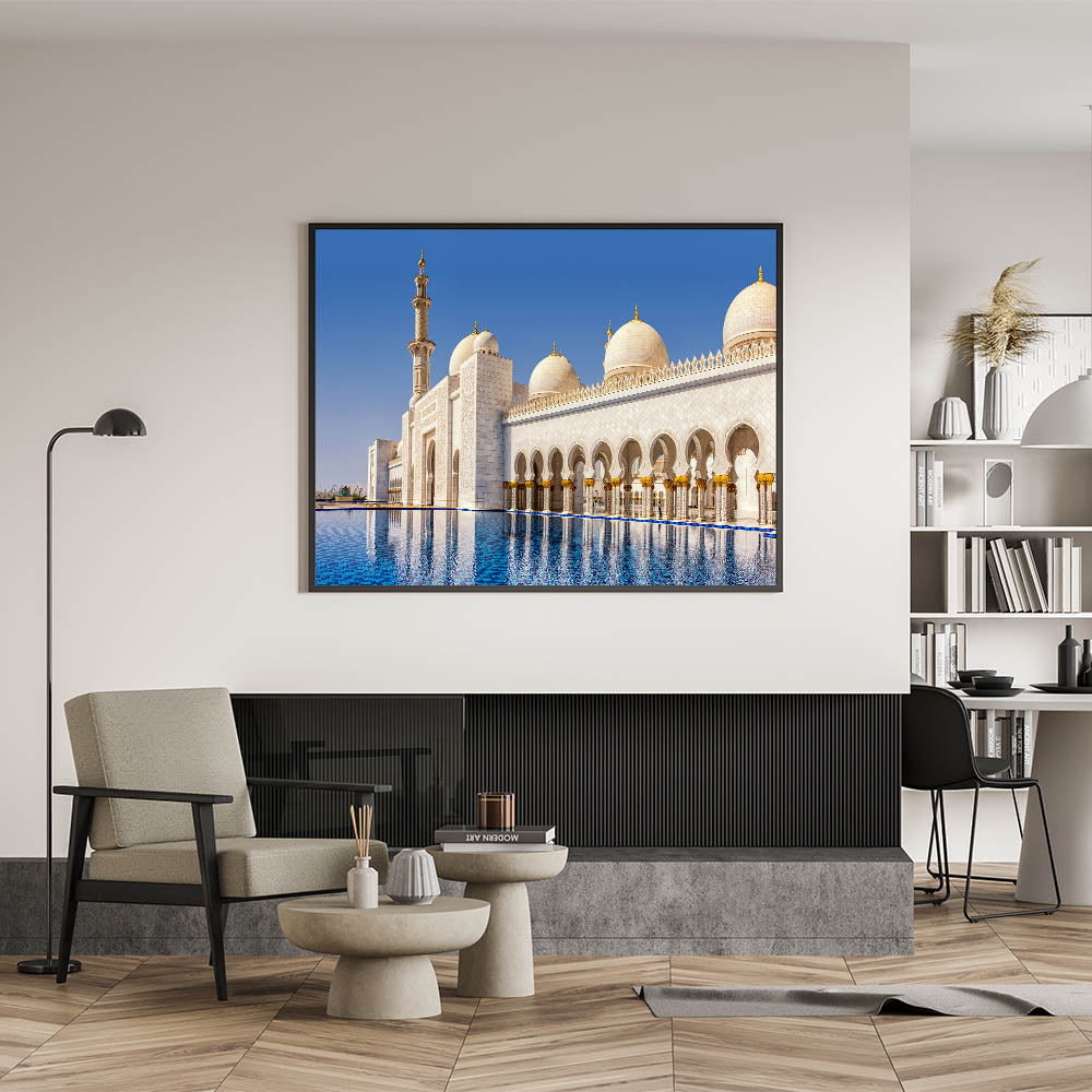 - High-quality art print showcasing the Sheikh Zayed Mosque with its peaceful reflections