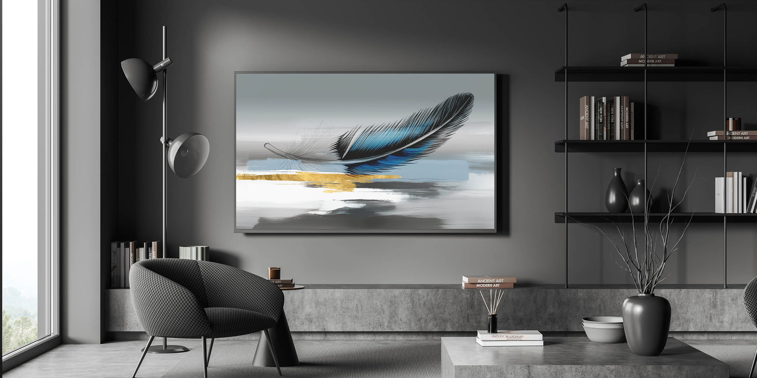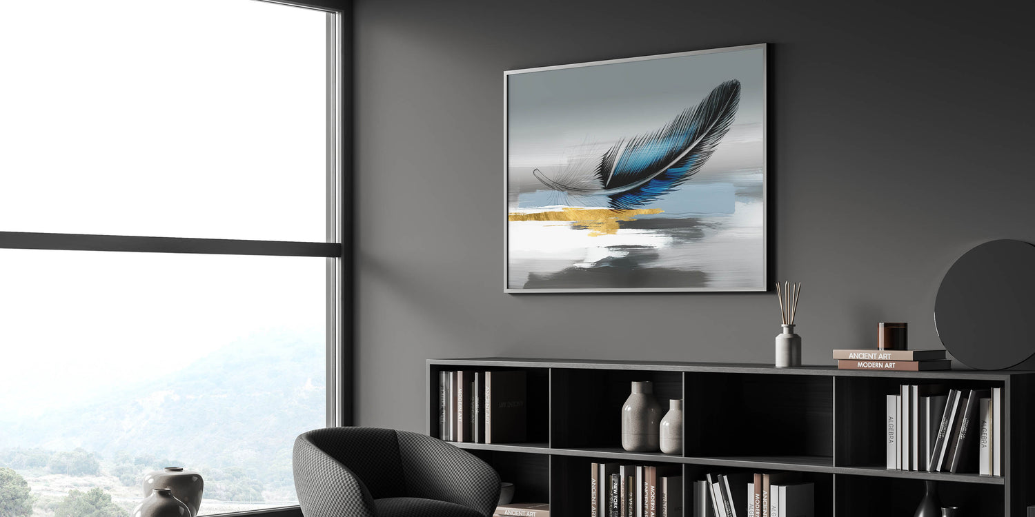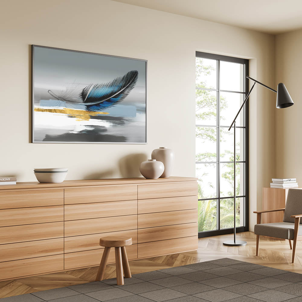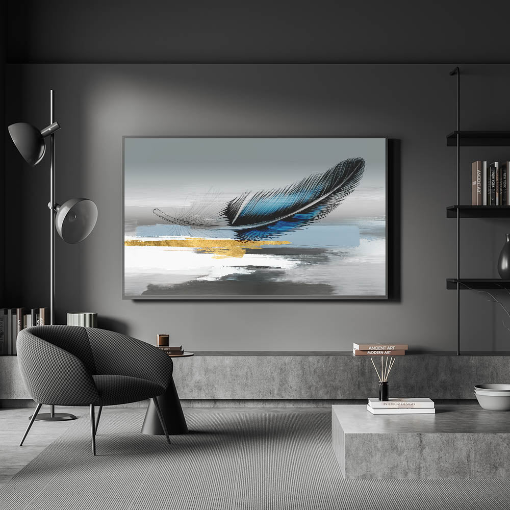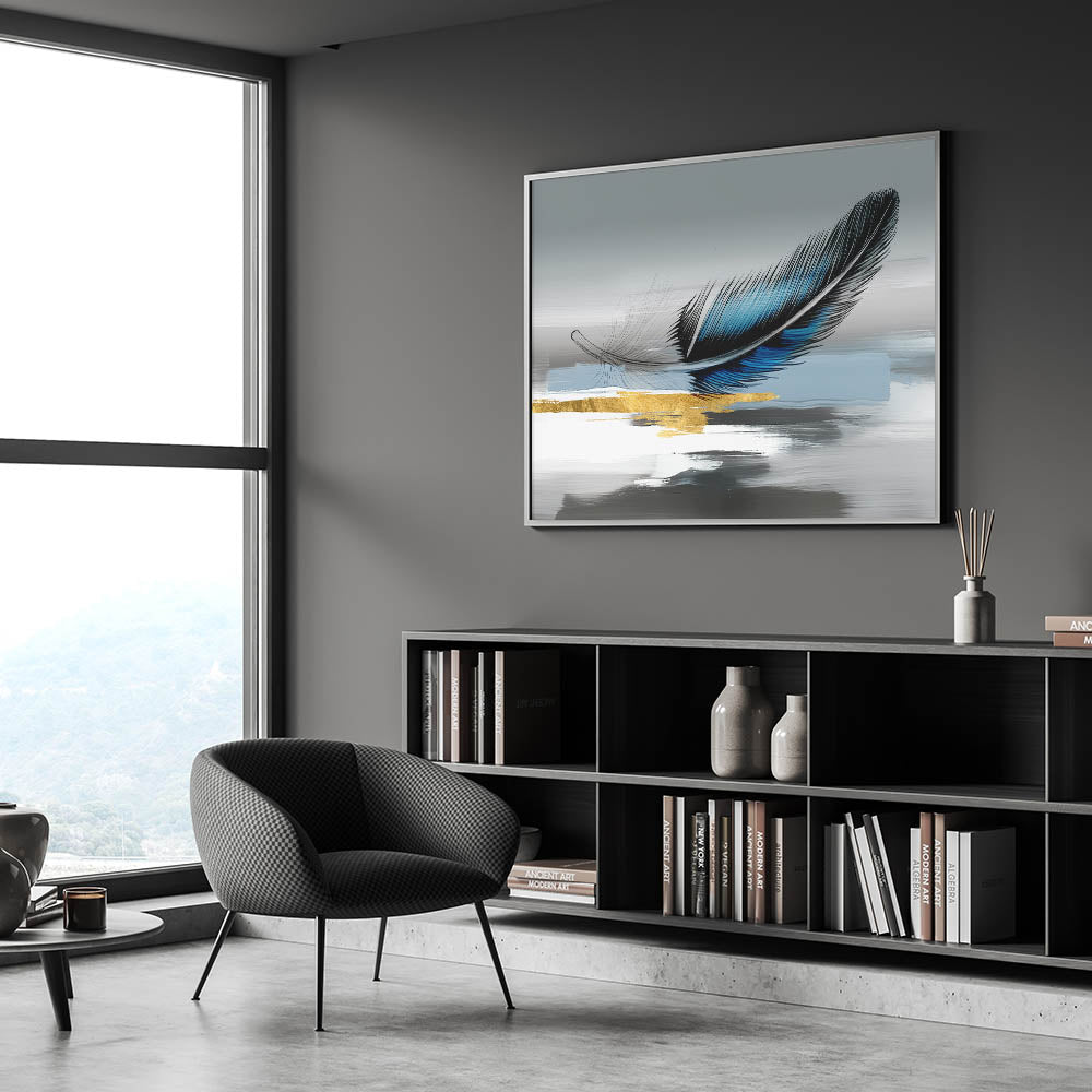 Introduce a touch of elegance and serenity to your space with this stunning abstract feather art. The artwork showcases a beautifully detailed feather in shades of black and blue, delicately resting on a background of soft grey and white strokes, accented with touches of gold. The combination of colors and textures creates a harmonious balance, making this piece perfect for adding a sense of calm and sophistication to any room.