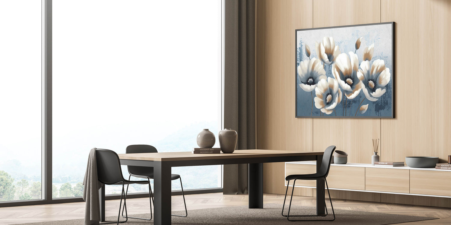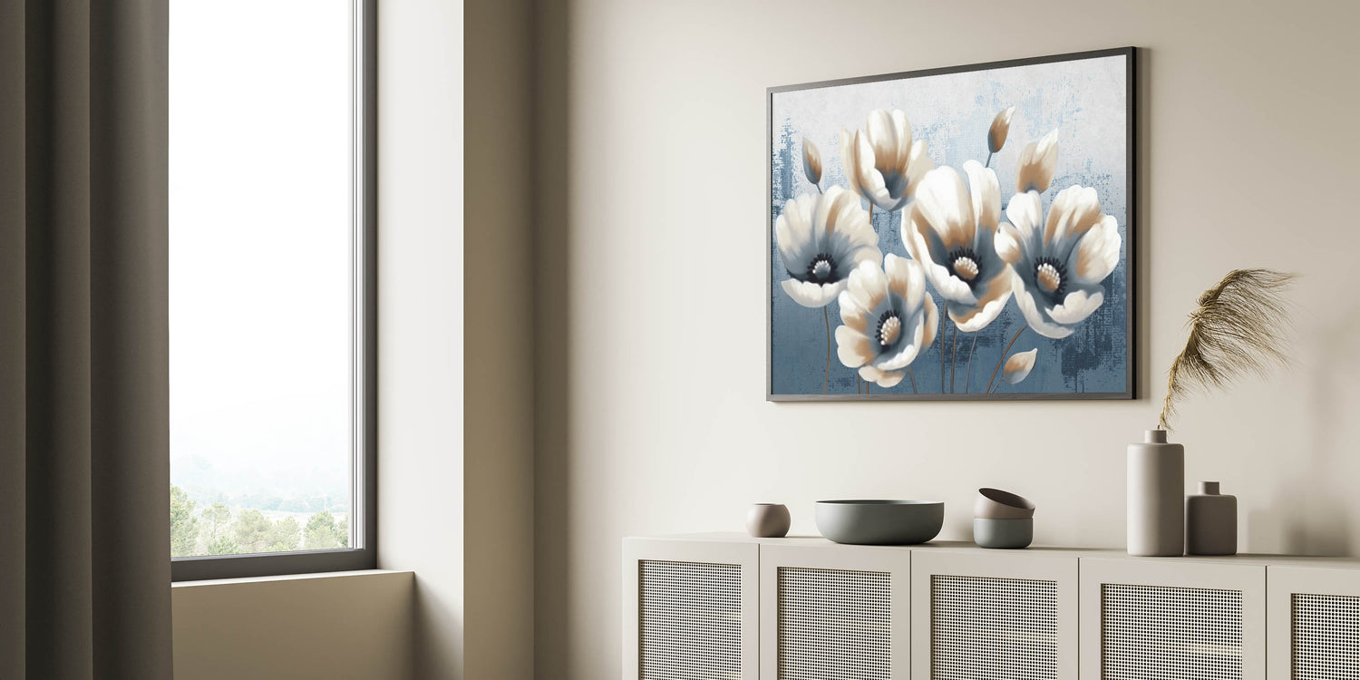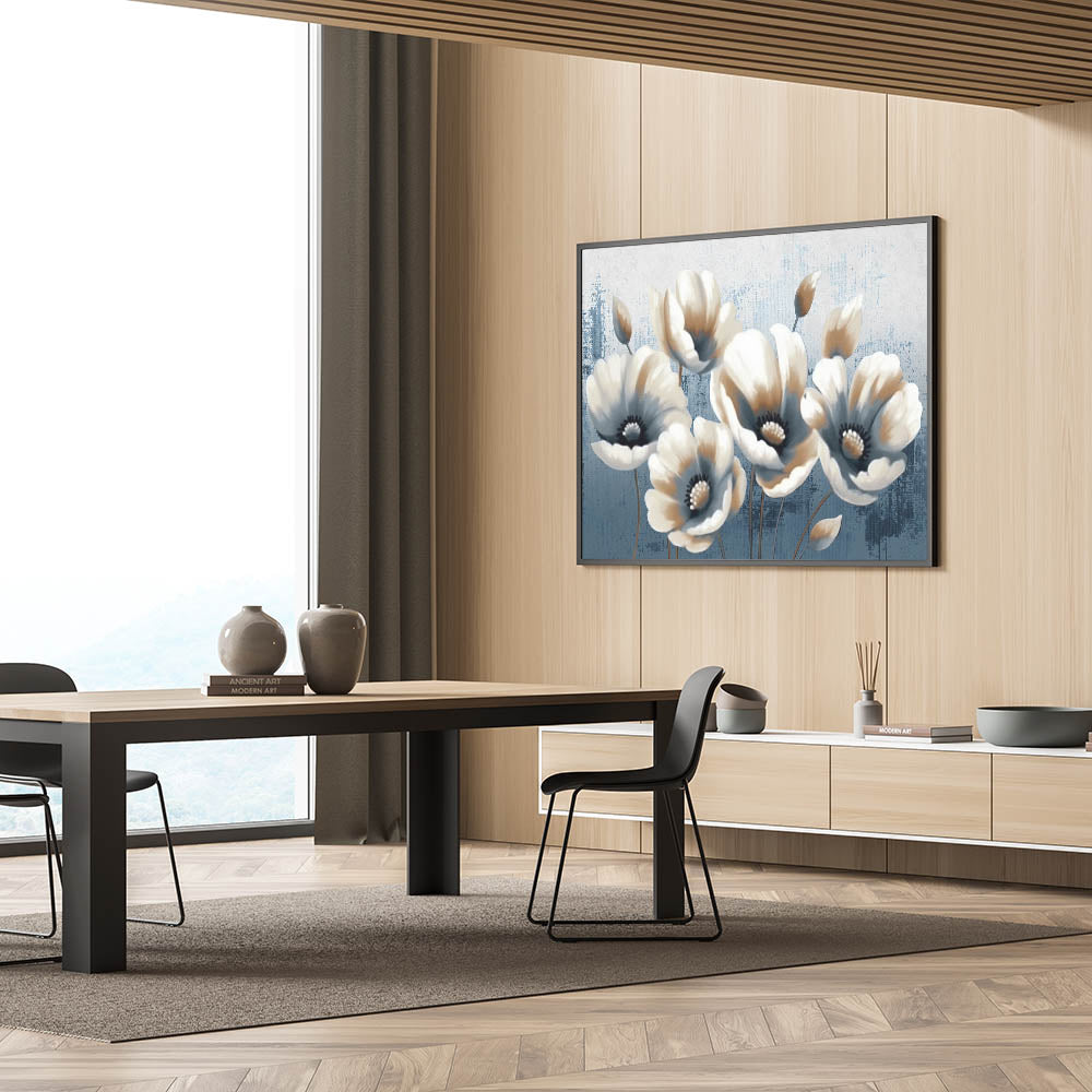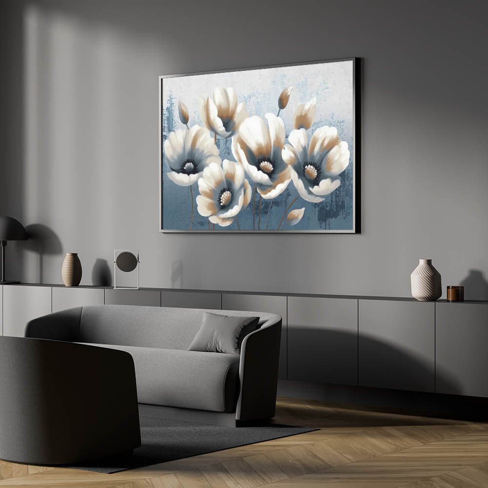 Enhance your living space with this elegant floral abstract artwork, where delicate blossoms are beautifully rendered in soft neutral and blue tones. The design features a cluster of blooming flowers with intricate detailing, set against a textured background that adds depth and dimension to the piece. This artwork is perfect for bringing a touch of sophistication and tranquility to any room.