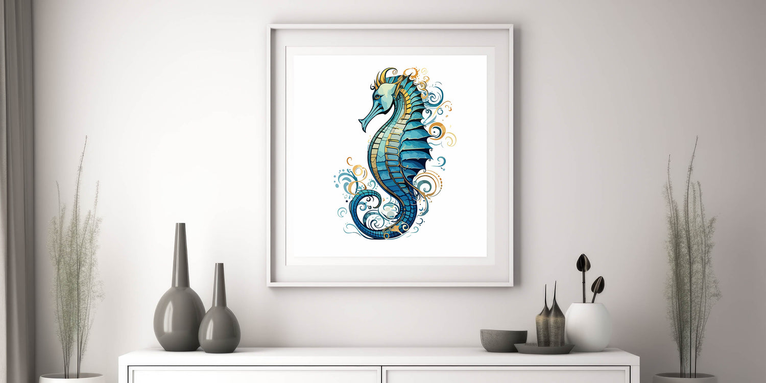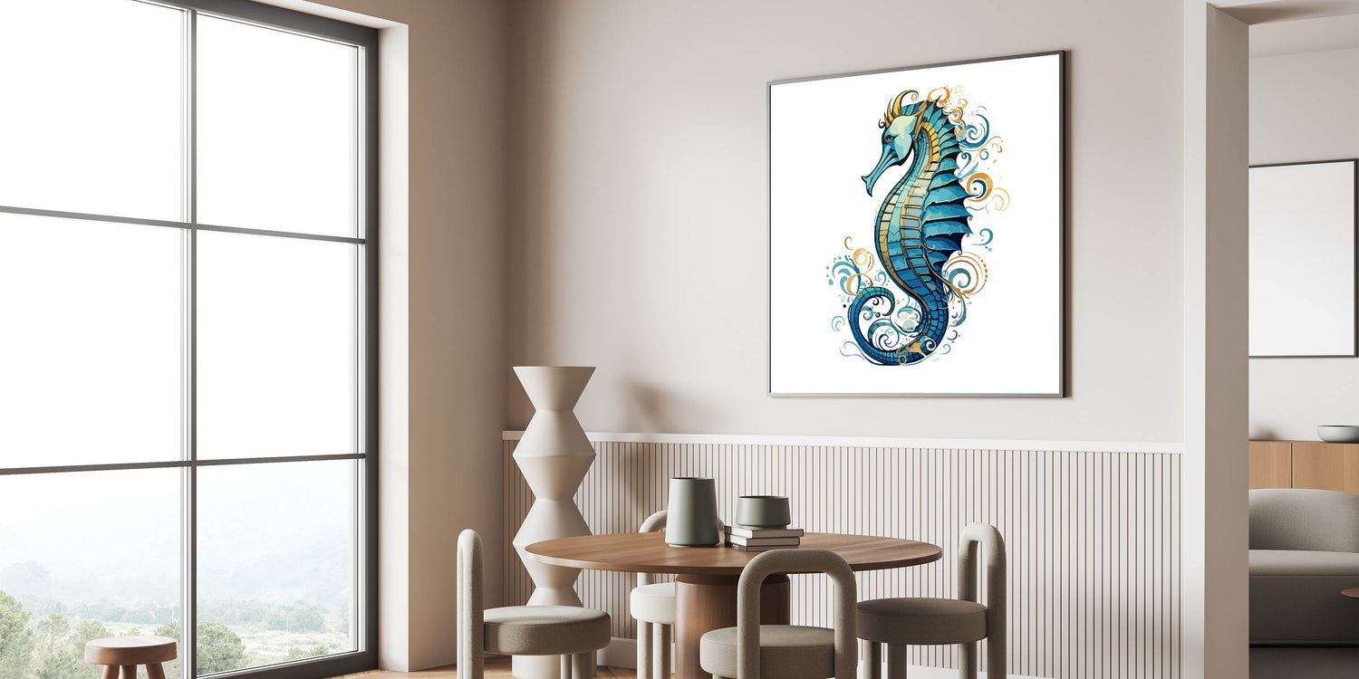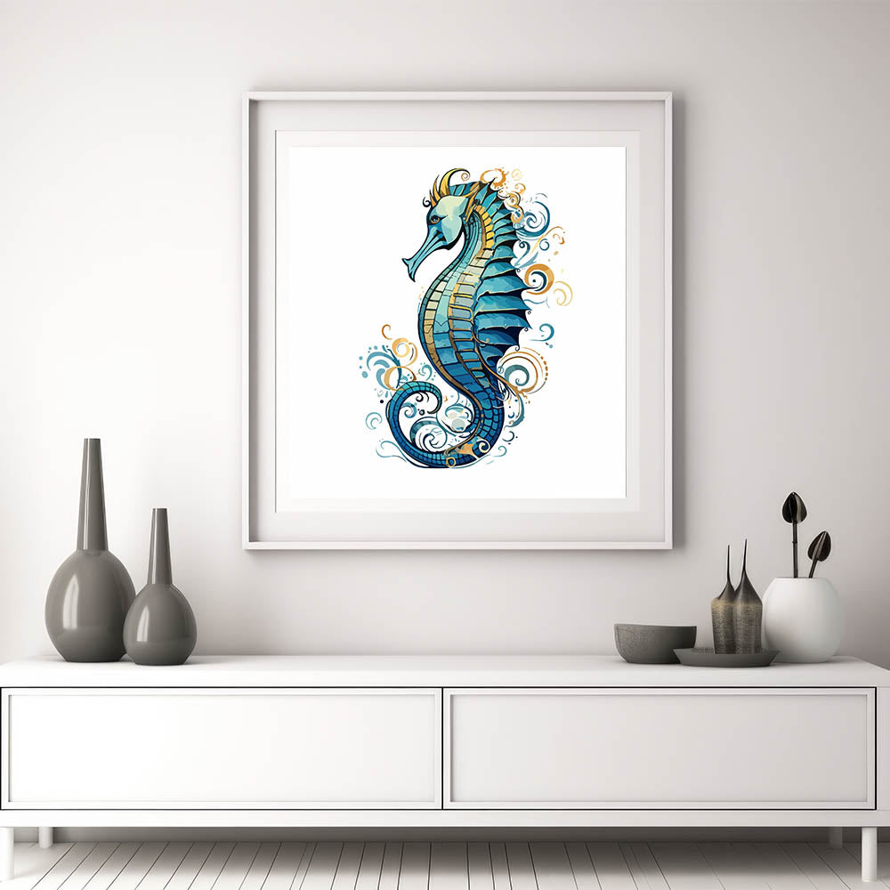 Bring the serene beauty of the ocean into your home with this elegant seahorse wall art. Perfect for marine life enthusiasts, this artwork captures the intricate details and graceful form of the seahorse, a symbol of patience and contentment. The vibrant blues and sandy hues create a stunning contrast, making it an eye-catching piece for any room.