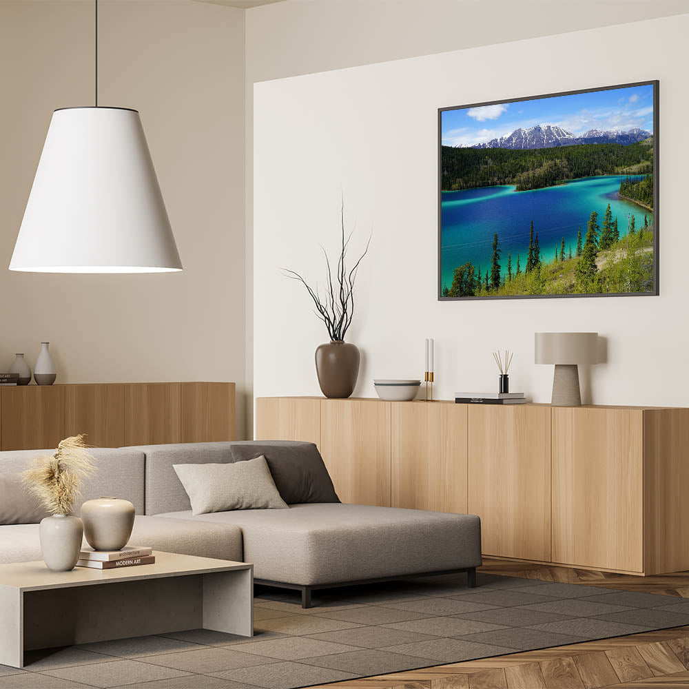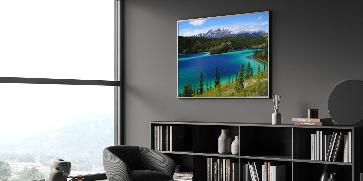 Discover the pristine beauty of Yukon's Emerald Waters with our canvas print, showcasing the vivid turquoise hues of a secluded lake encircled by lush green forests and majestic snow-capped mountains.