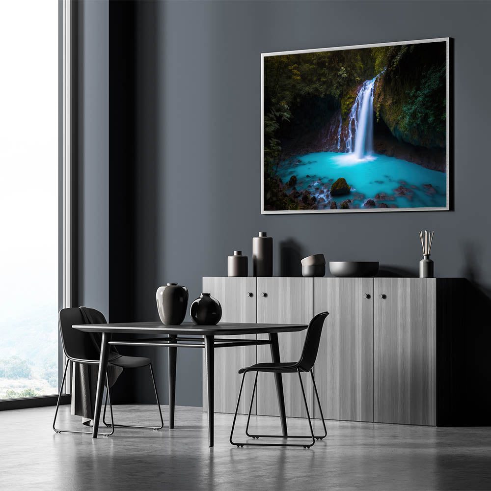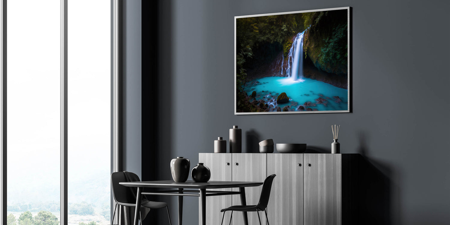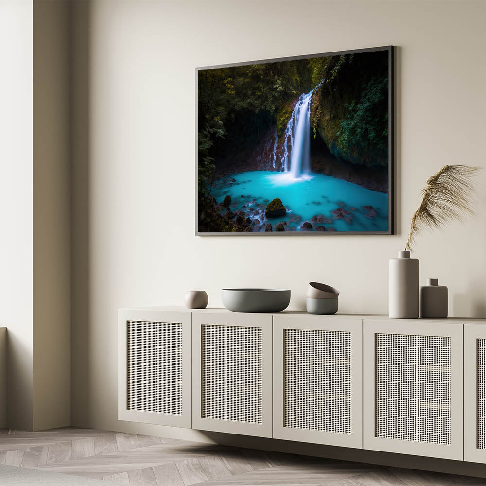 Immerse yourself in the serene beauty of Costa Rica with our Enchanted Costa Rican Waterfall Canvas. This artwork vividly captures a hidden waterfall cascading into a crystal-clear turquoise pool, framed by rich, green foliage, creating a peaceful retreat in any room.