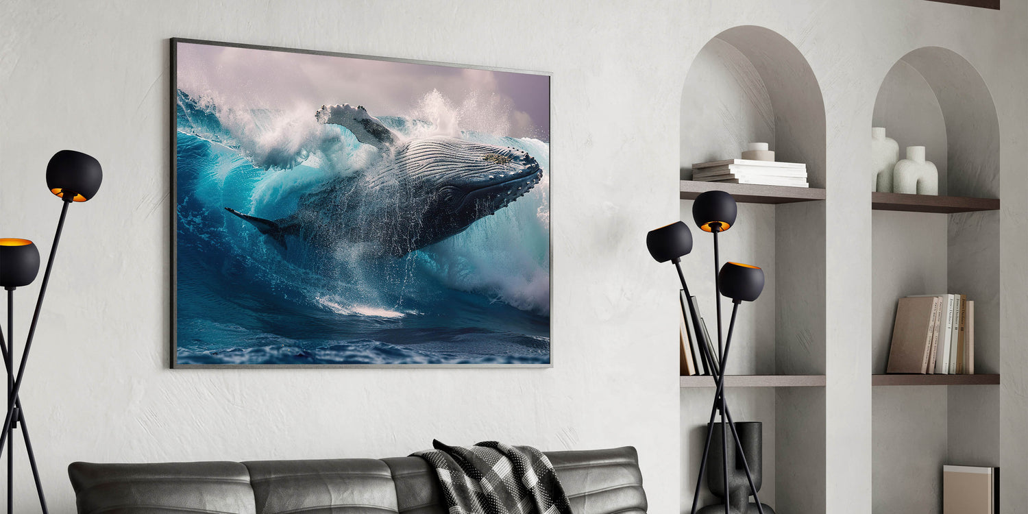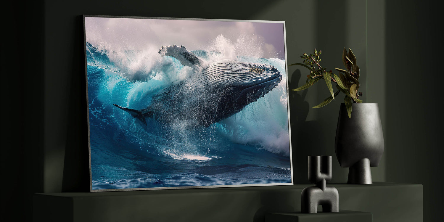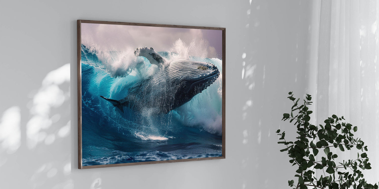 Bring the raw energy and beauty of the ocean into your home with this stunning whale artwork. Perfect for those who love marine life and want to make a bold statement in their decor. Explore more from our collection to find complementary pieces that capture the essence of the sea.