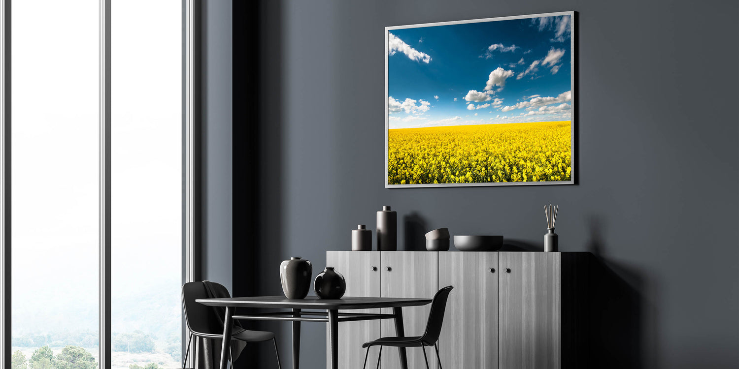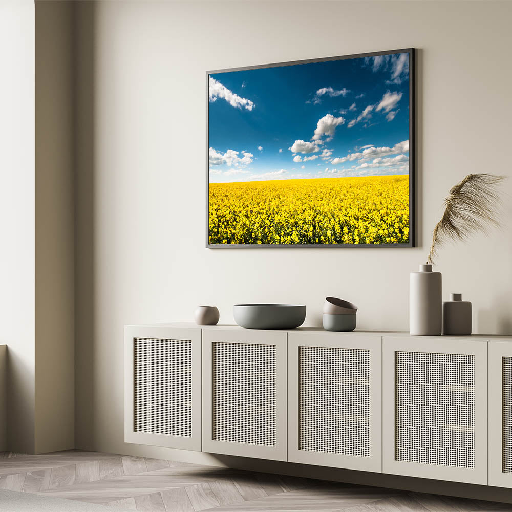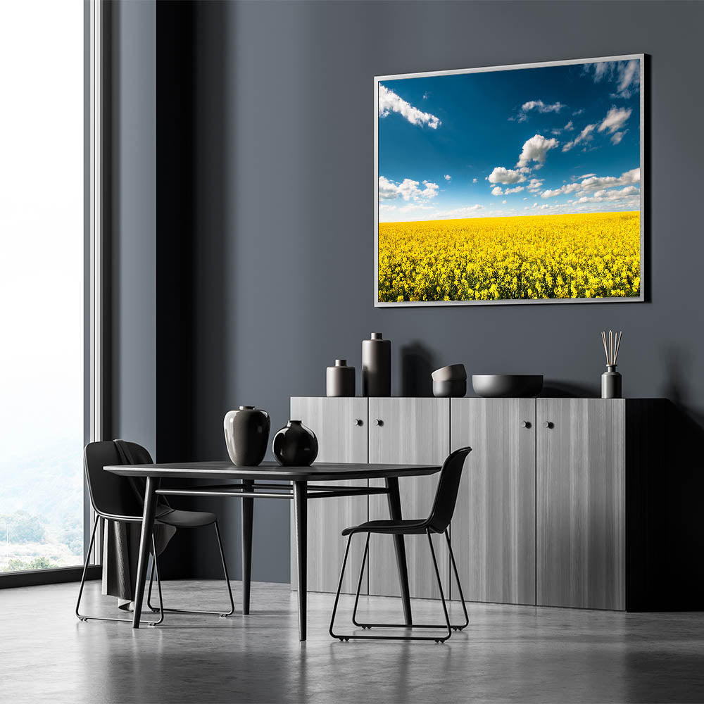 This golden yellow field print brings the refreshing energy of a sunny day into your home, creating a joyful and lively environment that is sure to enhance any room.