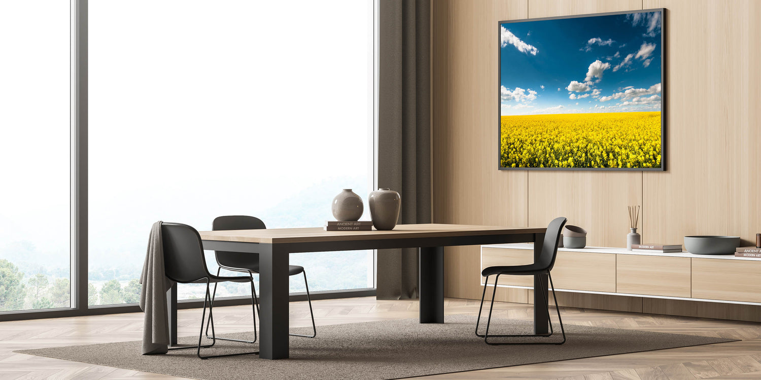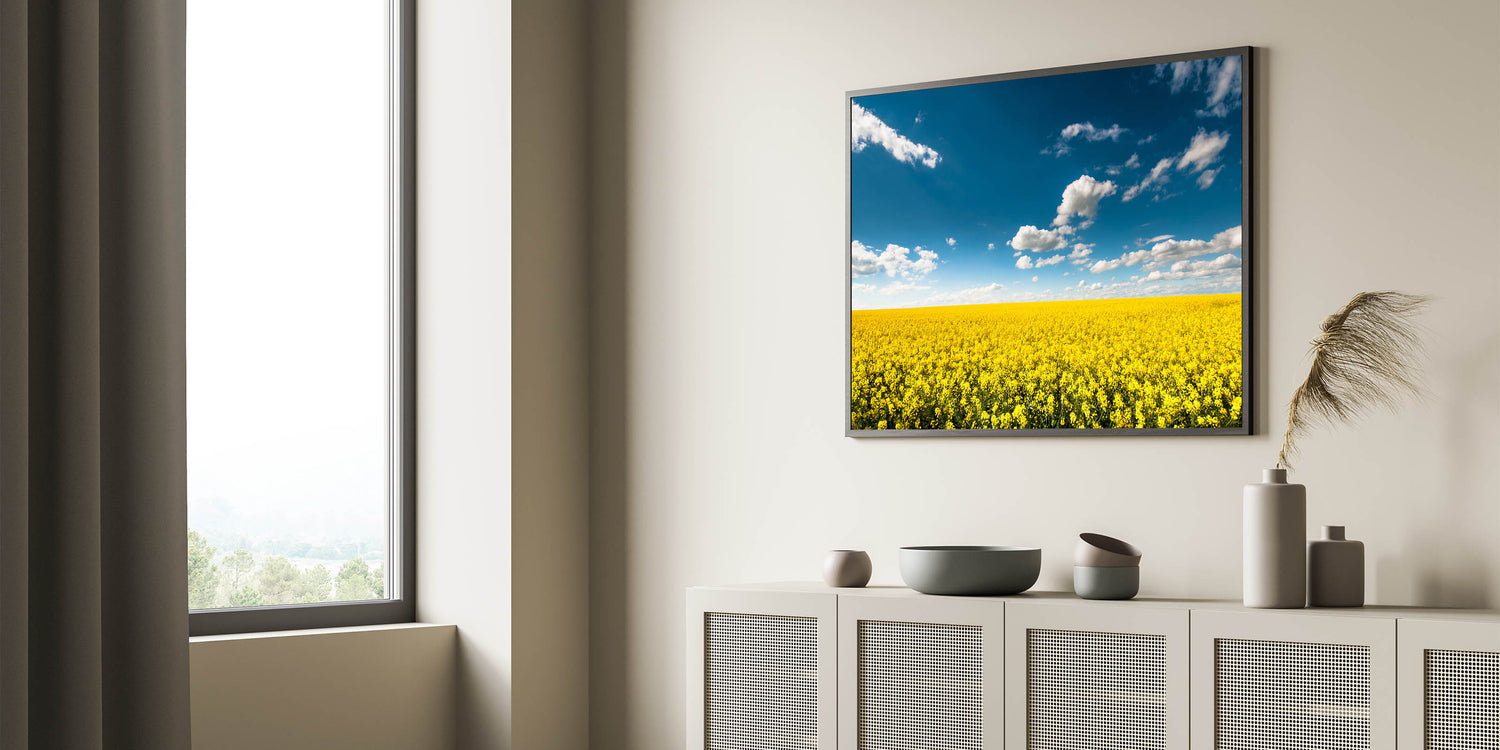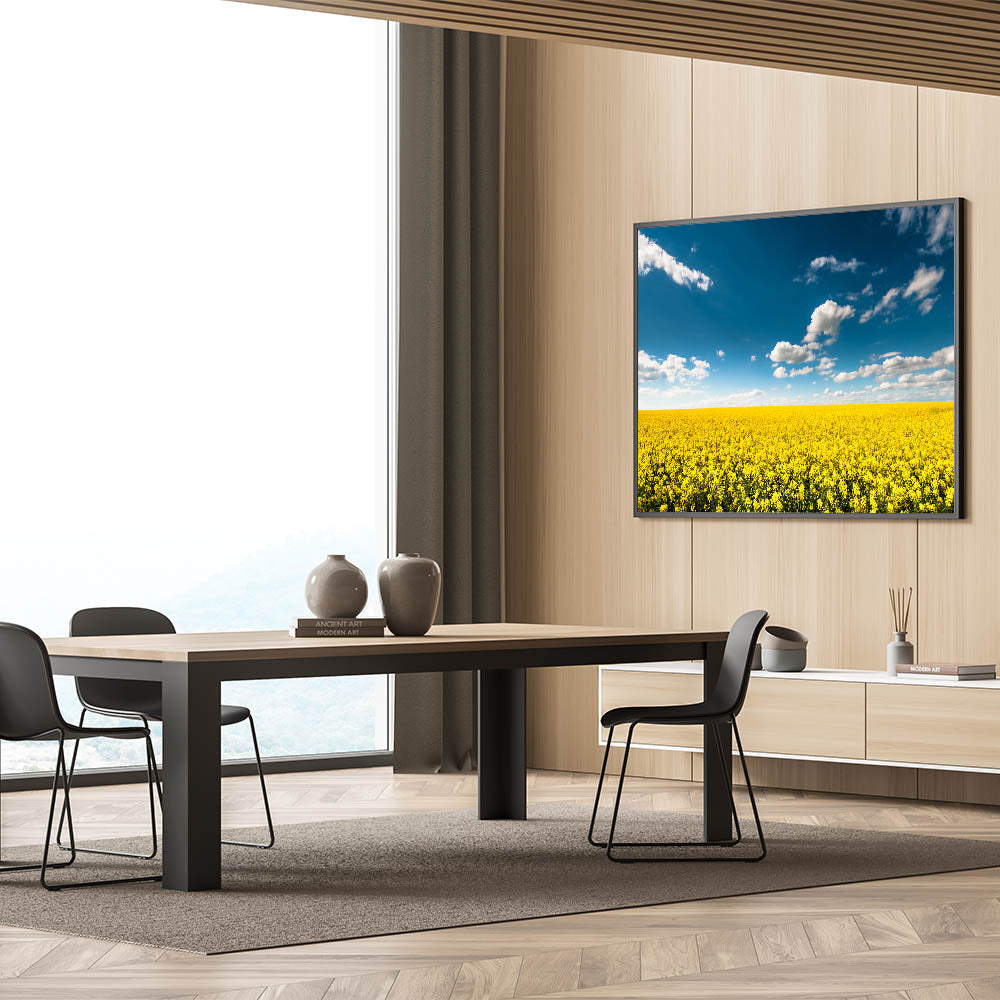 This golden yellow field print brings the refreshing energy of a sunny day into your home, creating a joyful and lively environment that is sure to enhance any room.