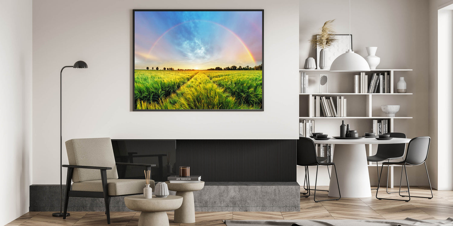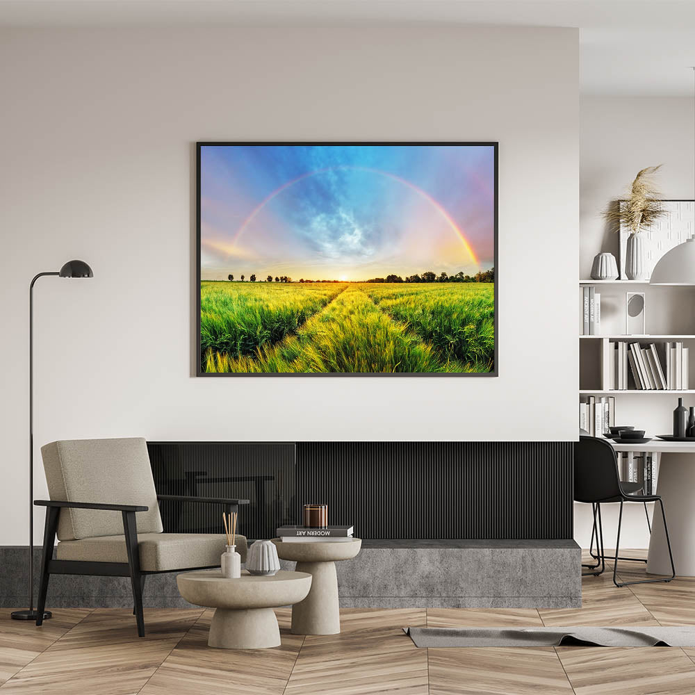Transform your space with the vibrant beauty of nature captured in this Fields Panorama Wall Decor. This stunning artwork showcases a lush green field stretching into the horizon, with a vivid rainbow arching across a dramatic sky. The combination of vibrant colors and serene landscape creates a harmonious and uplifting atmosphere, perfect for bringing a touch of the outdoors into your home.