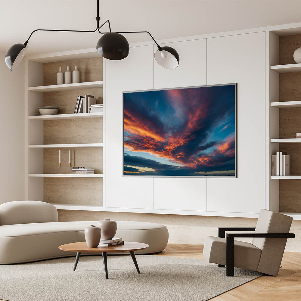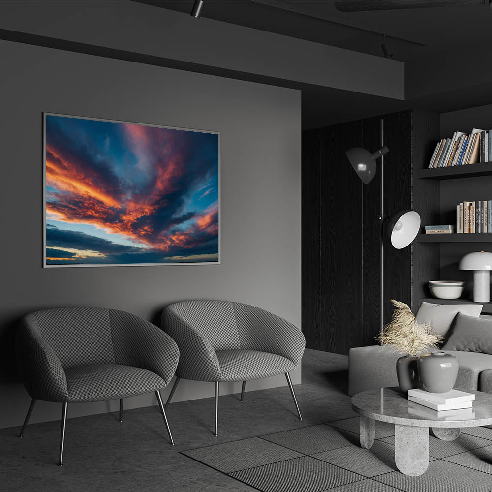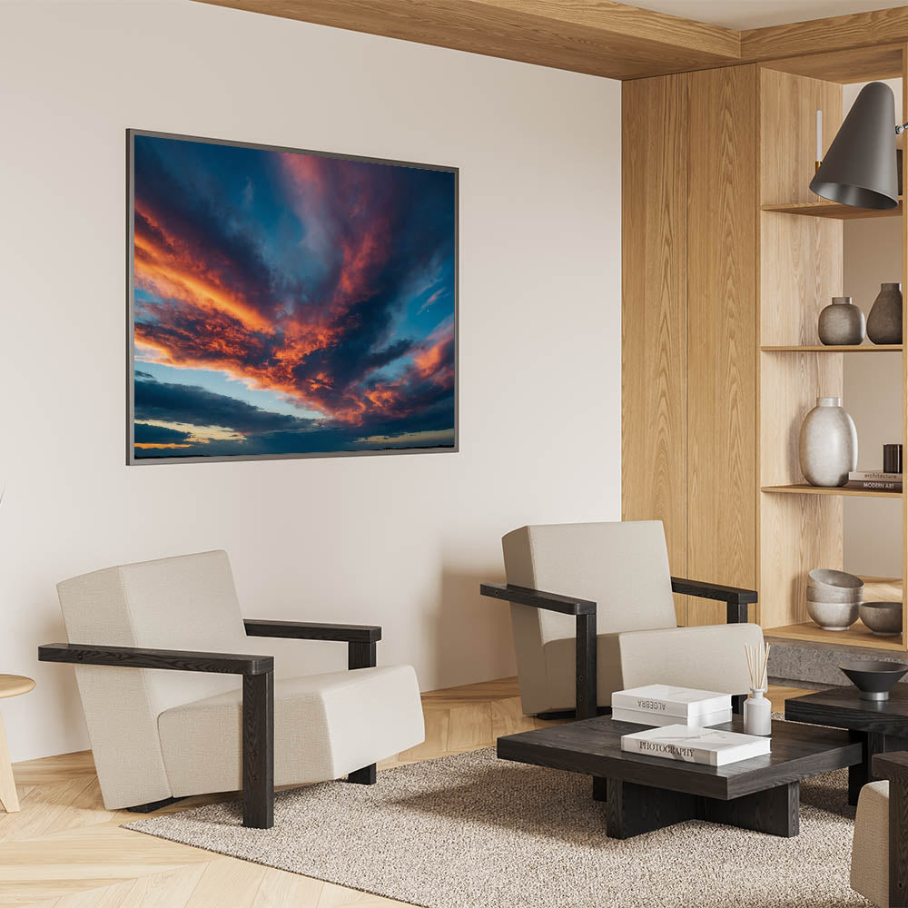 Transform your space with this fiery sunset skyscape, perfect for those who appreciate the beauty of a dramatic evening sky. Explore our collection to find the perfect piece that speaks to your style.