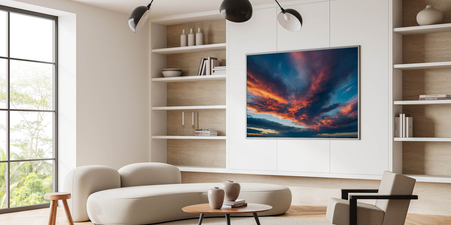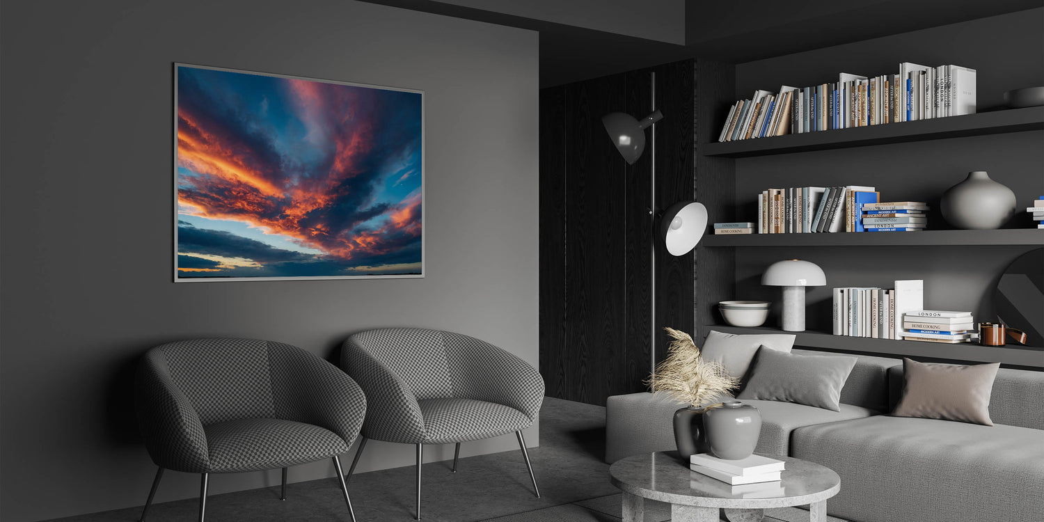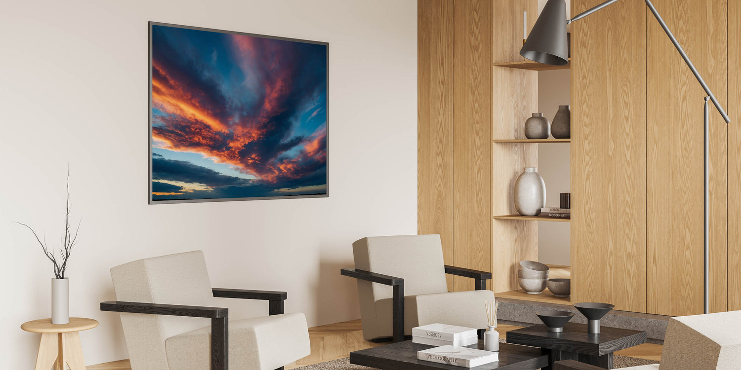 Transform your space with this fiery sunset skyscape, perfect for those who appreciate the beauty of a dramatic evening sky. Explore our collection to find the perfect piece that speaks to your style.