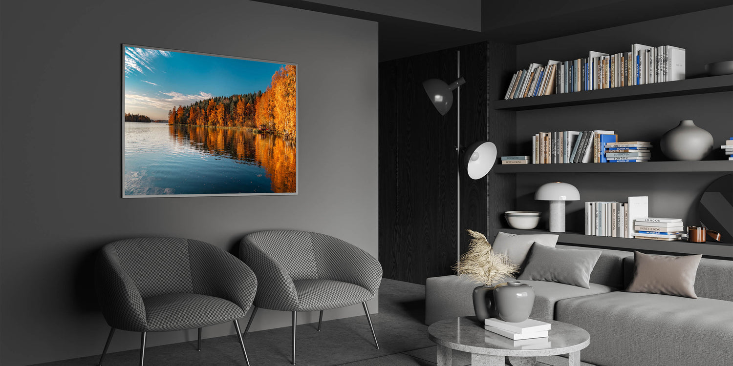 This scenic Finland art print showcases the peaceful beauty of Nordic nature during autumn, offering a calming view of Finland’s natural splendor. With high-quality printing on your chosen material, this artwork will elevate your home’s décor and provide a touch of seasonal charm.