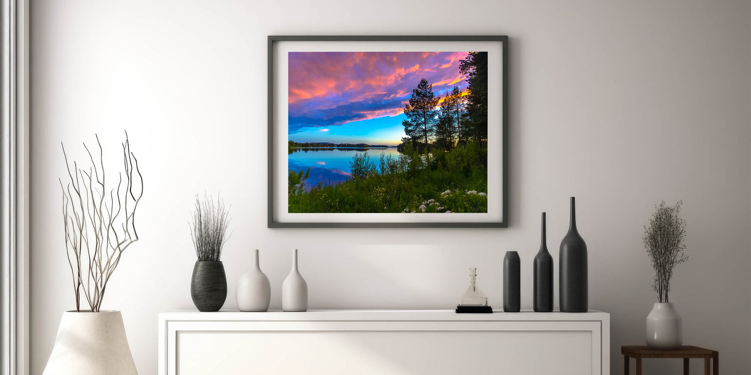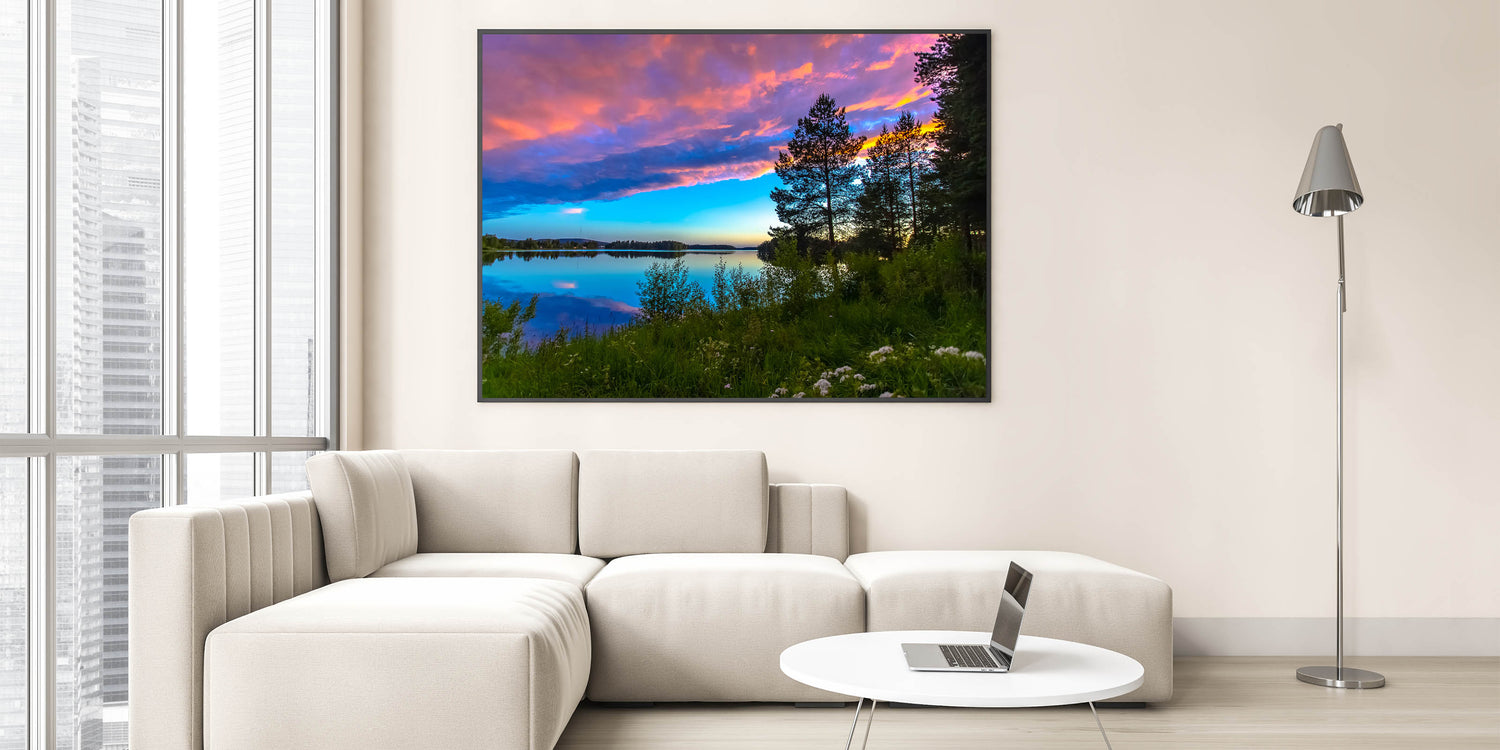 Transform your space with the vibrant beauty of Finland’s natural landscapes through this stunning wall art. This artwork captures the magic of a colorful sunset over a calm lake, with the sky bathed in rich hues of pink, purple, and blue. The peaceful lake reflects the stunning colors, while the trees and greenery along the shore add a touch of tranquility. This scenic piece is perfect for nature lovers and anyone seeking a bold, colorful focal point for their home or office.