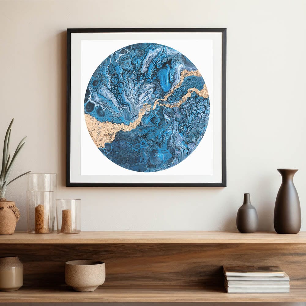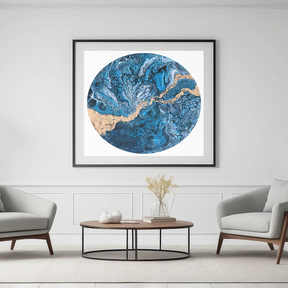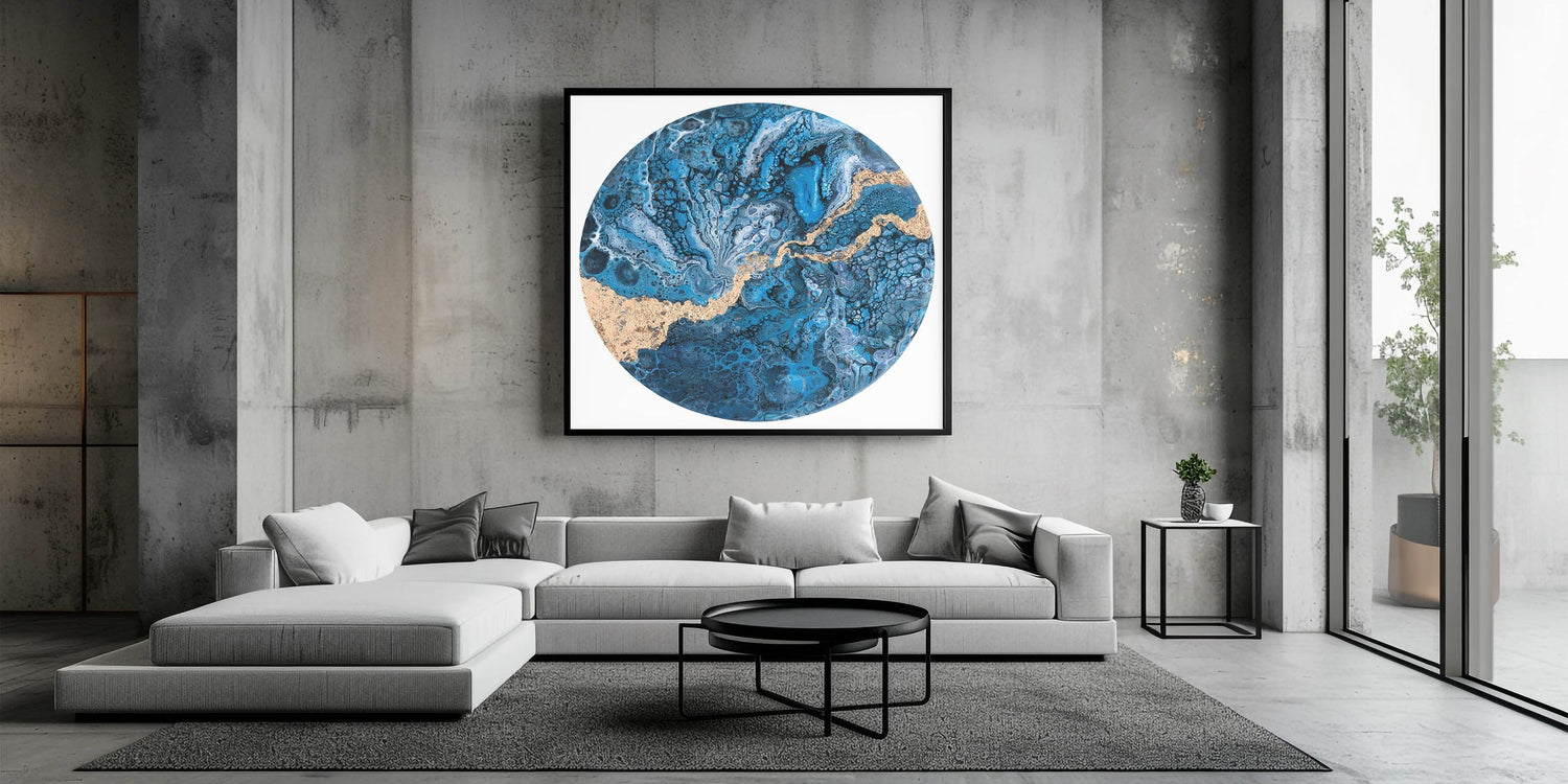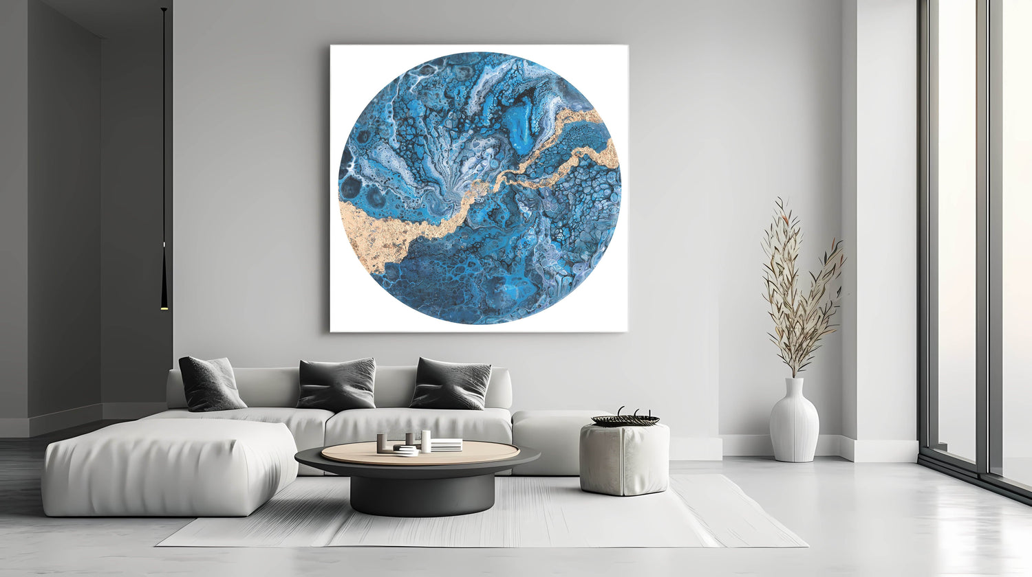 Add an elegant burst of color and sophistication to your space with this breathtaking fluid acrylic wall decor piece. Part of our exclusive fluid abstract art collection, this modern masterpiece features mesmerizing blue and metallic gold patterns, resembling an aerial view of a luxurious coastal landscape.