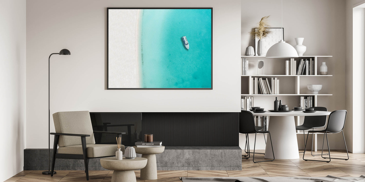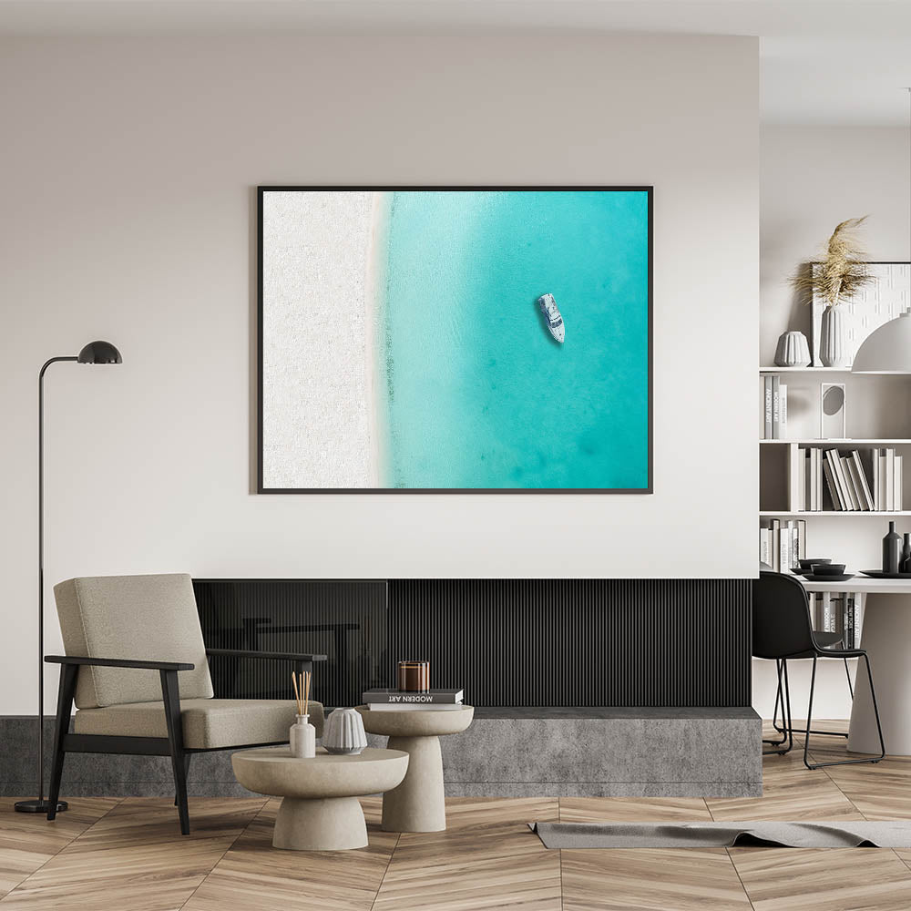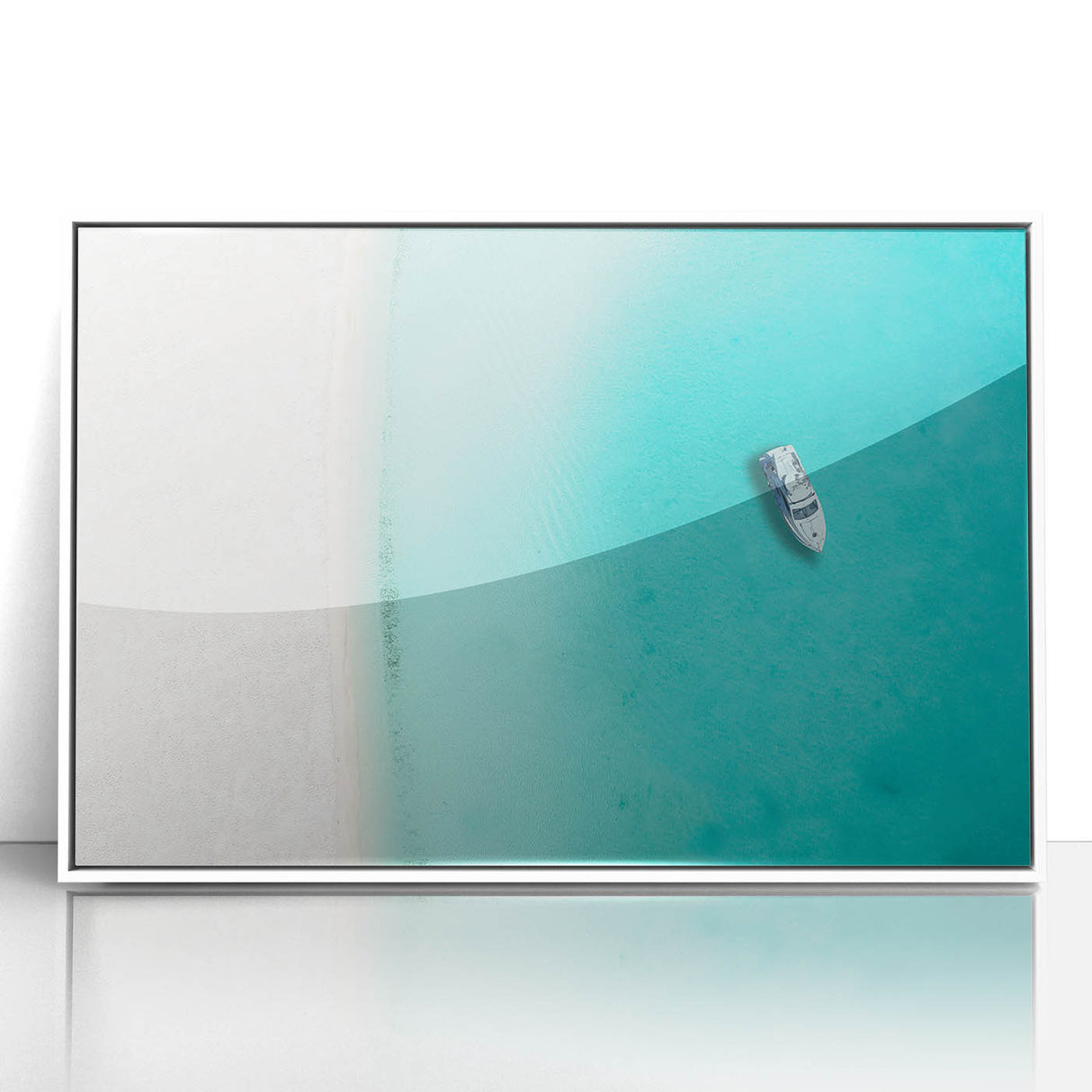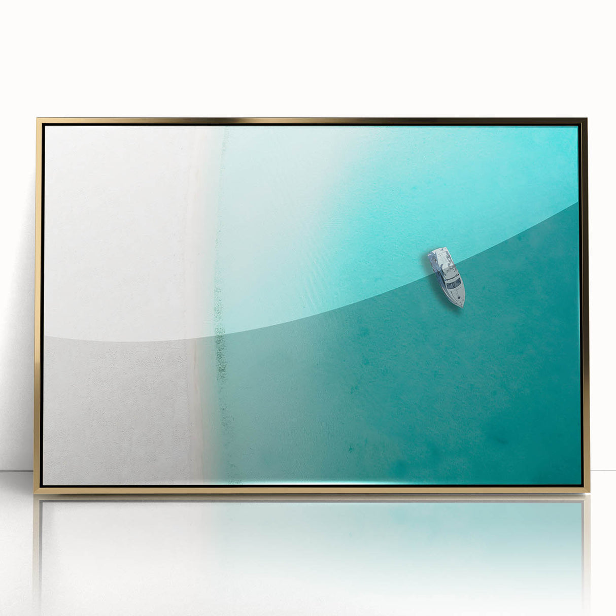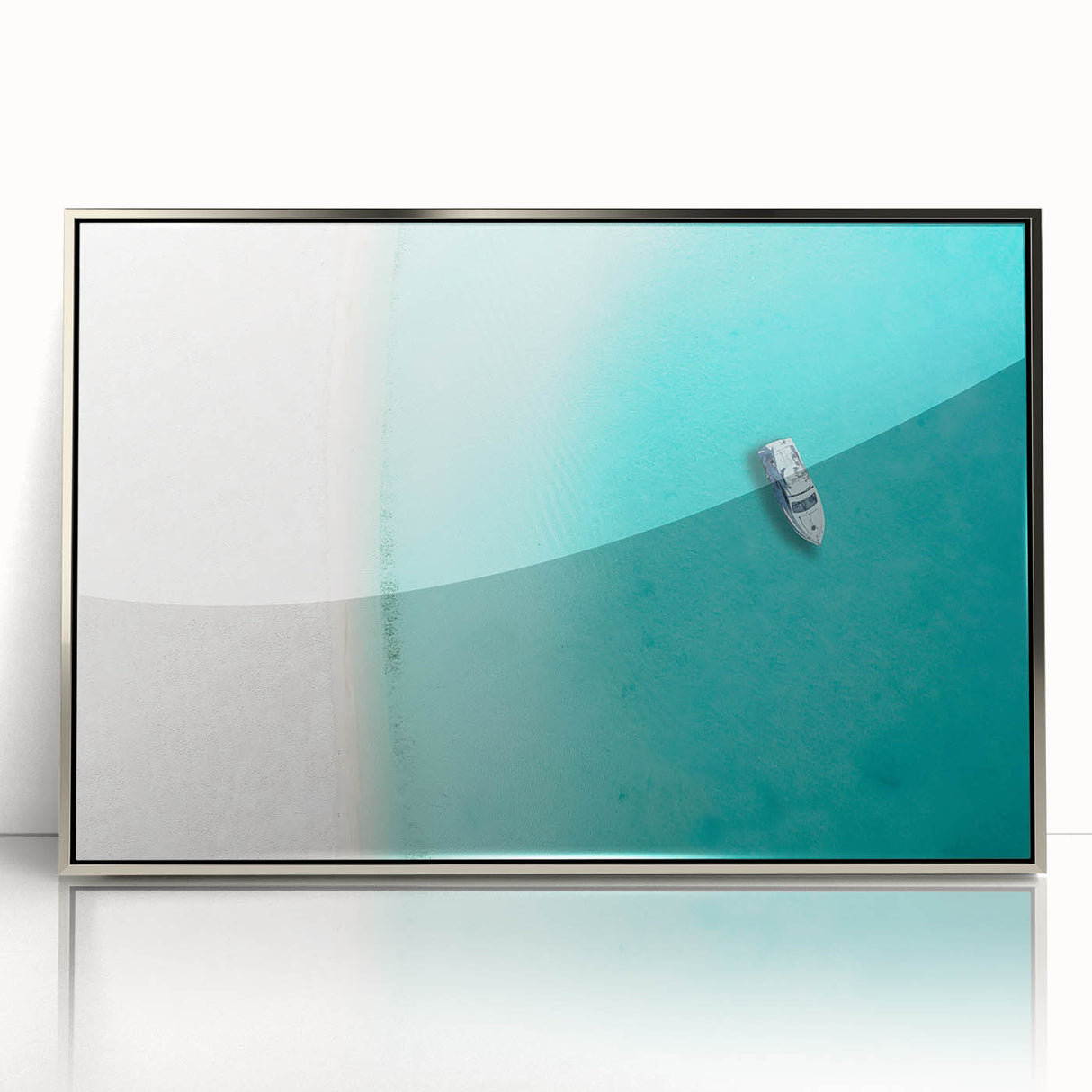 Embark on a visual journey with our "Solitary Boat Bliss" wall art, part of the Turks and Caicos Scenery By Region Collection. This piece captures an aerial view of a lone boat floating on the tranquil turquoise waters of the Caribbean, symbolizing peace and solitude. It’s a splendid addition to any space that seeks to evoke the serene essence of island life.