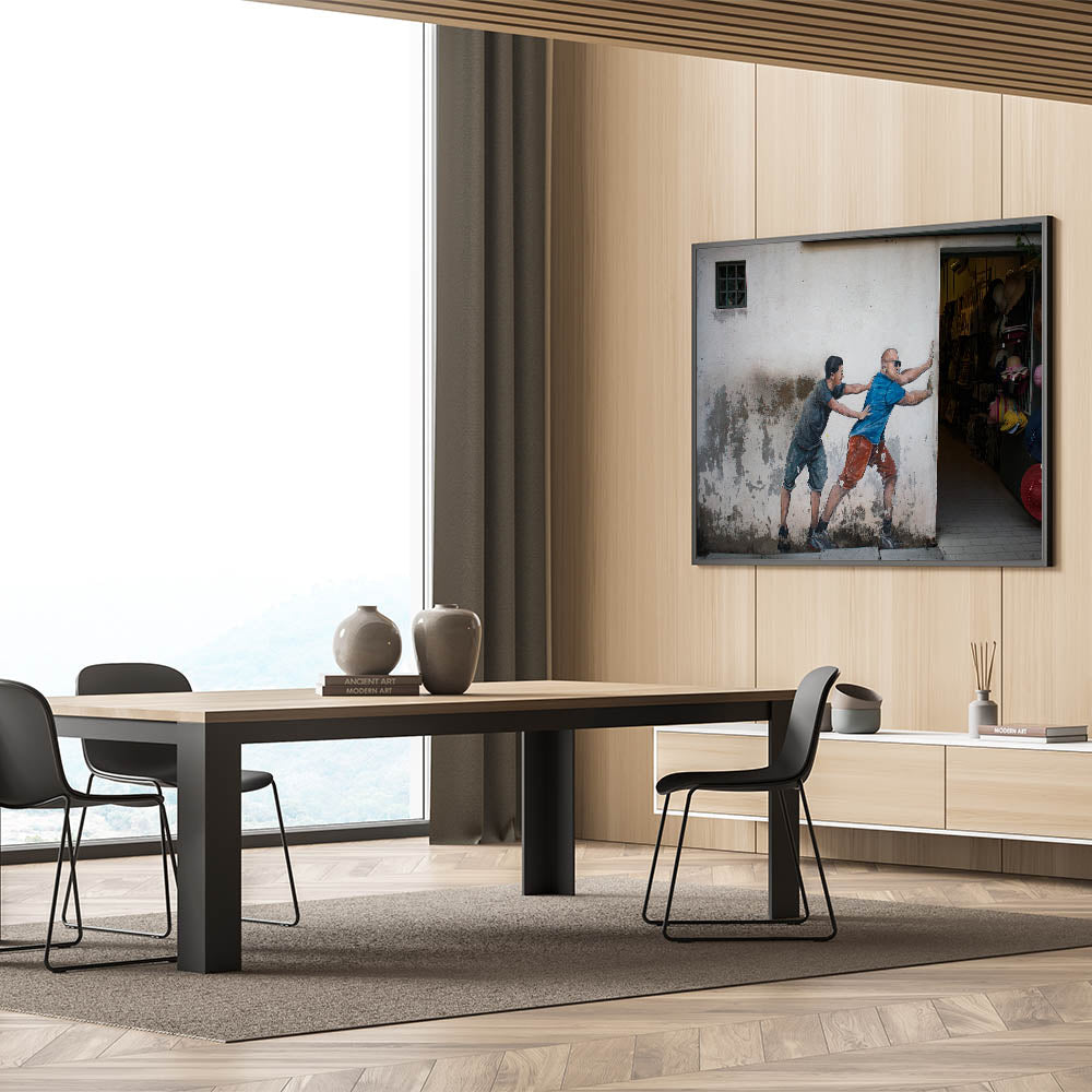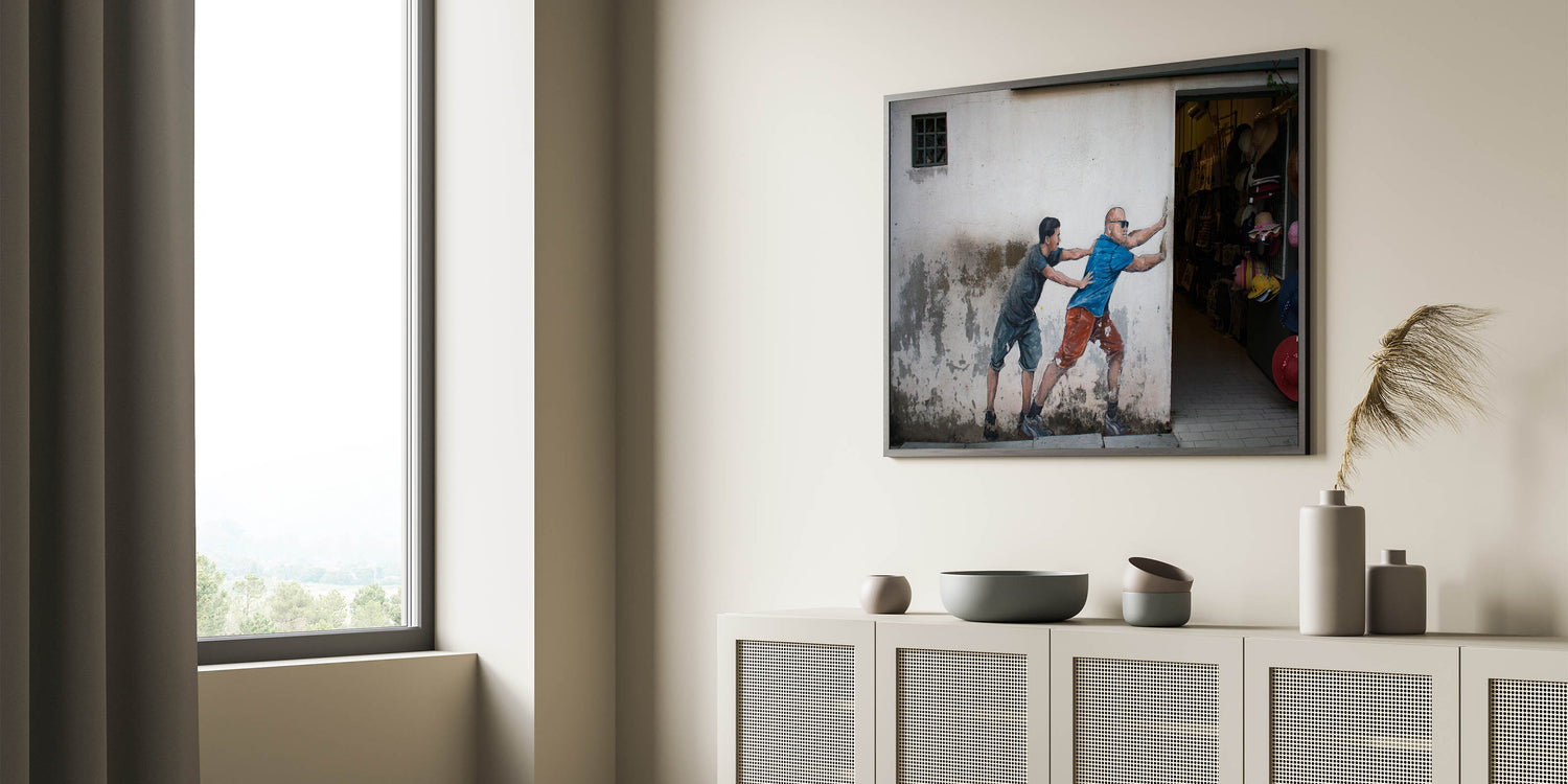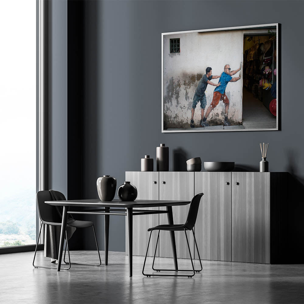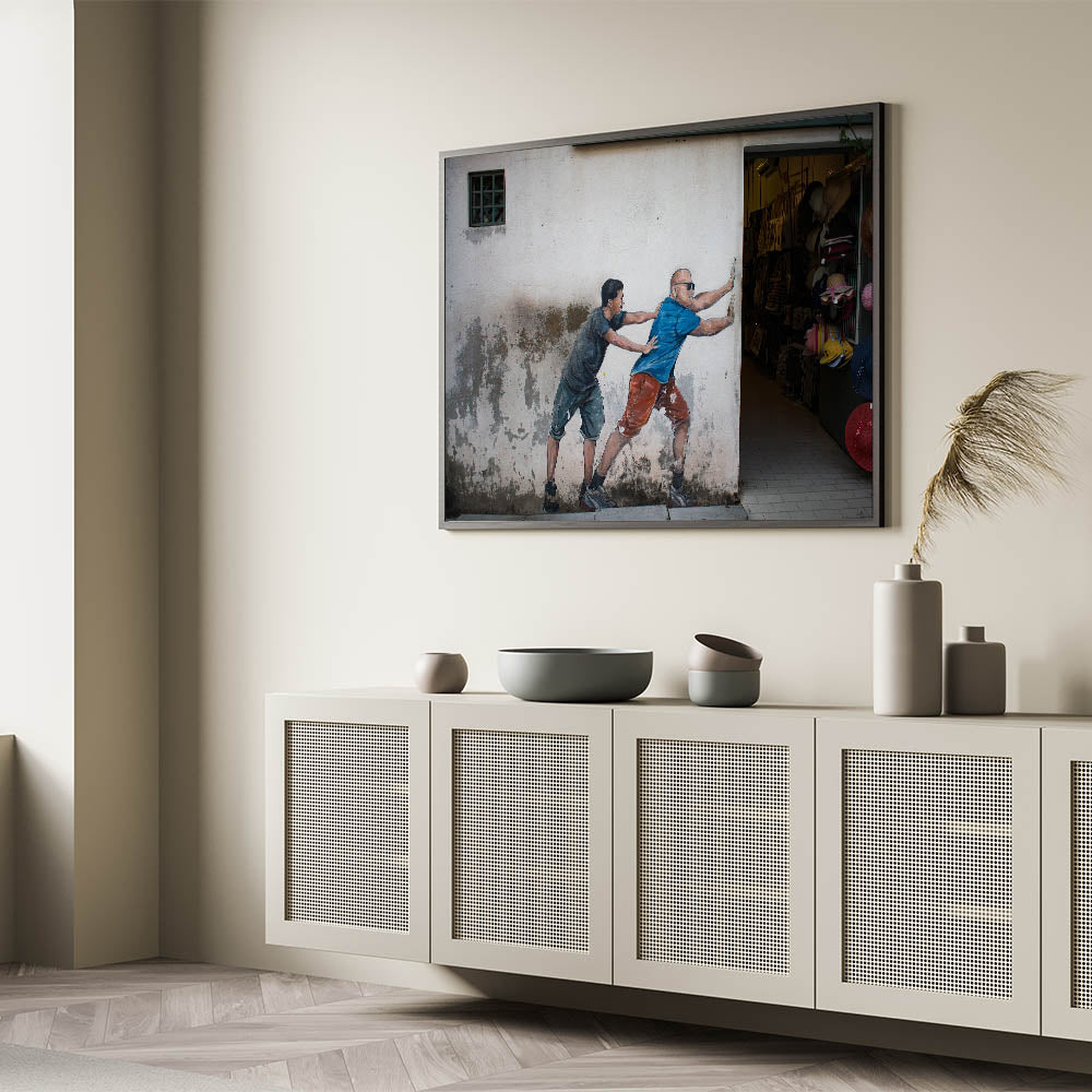 Add a touch of fun and creativity to your space with this Framed Malaysia Art, featuring a playful and interactive street mural. The mural depicts two realistic characters, seemingly pushing against the wall, blending the line between reality and art. This creative piece from Malaysia’s vibrant street art scene brings a whimsical and lighthearted vibe, making it an excellent choice for modern and eclectic decor.