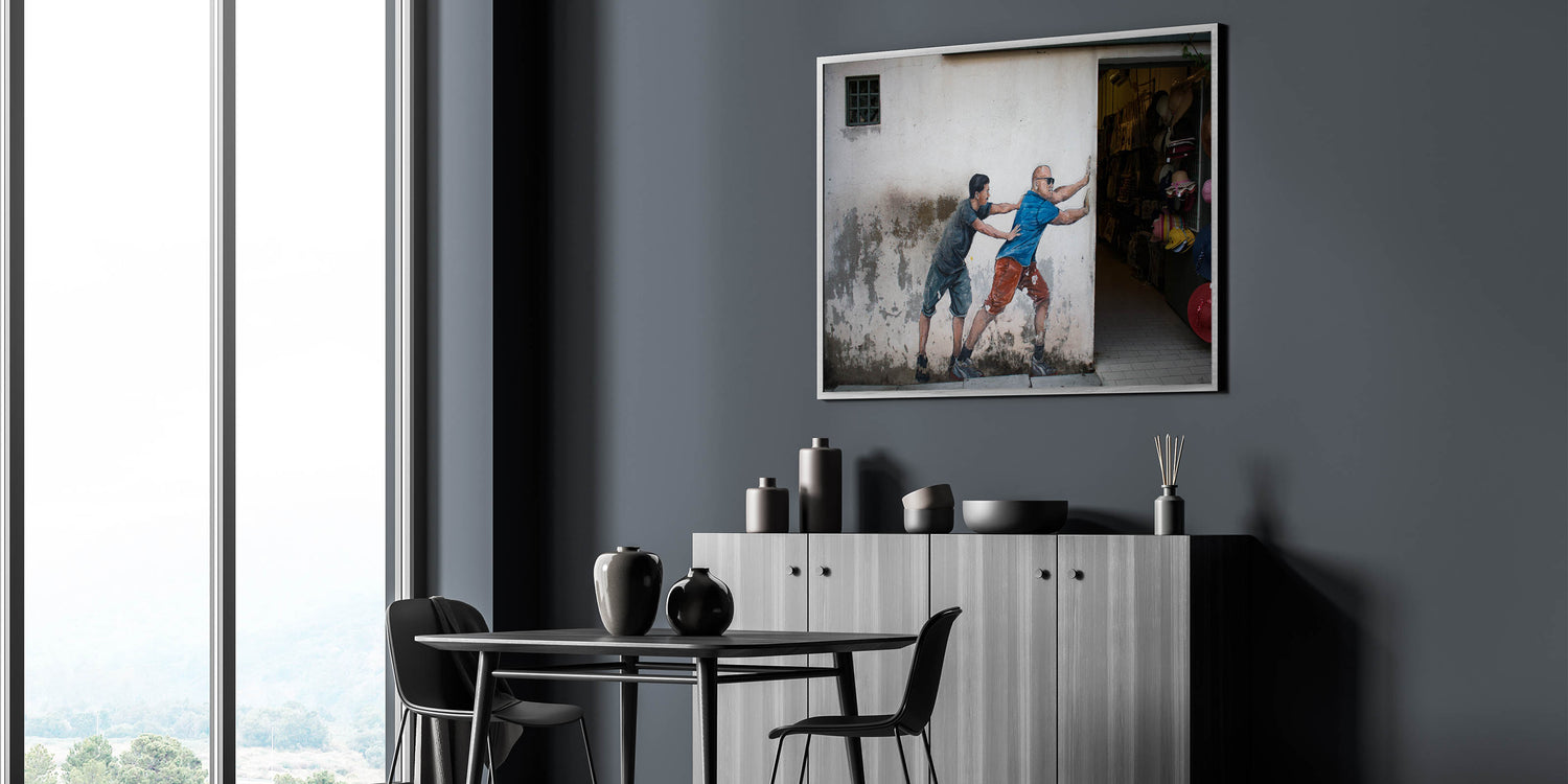 Perfect for adding a playful and artistic touch to your living room, bedroom, or creative workspace, this Malaysia street art print will inspire conversation and add a unique element to your decor. The interactive nature of the mural brings a fun and contemporary energy into any space.