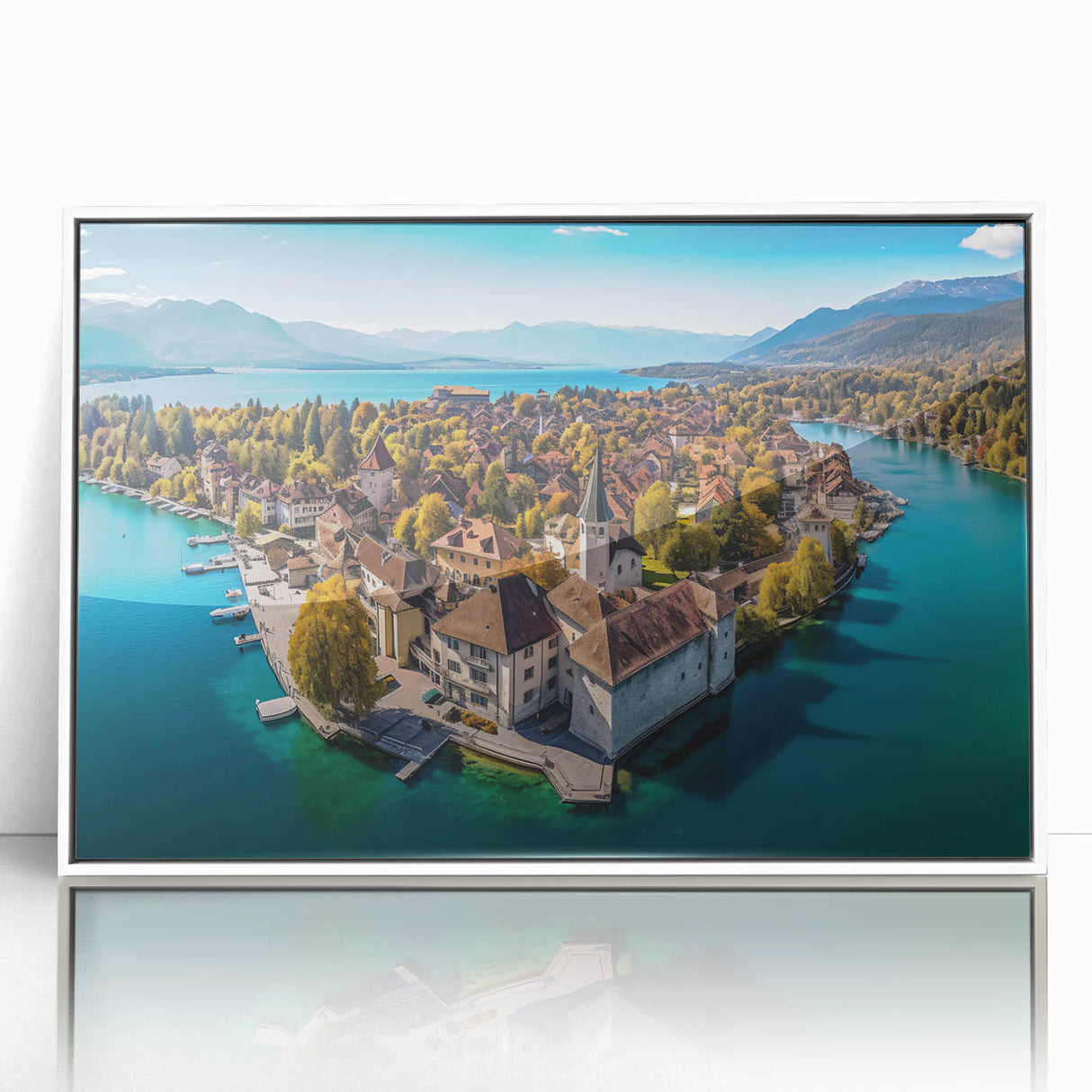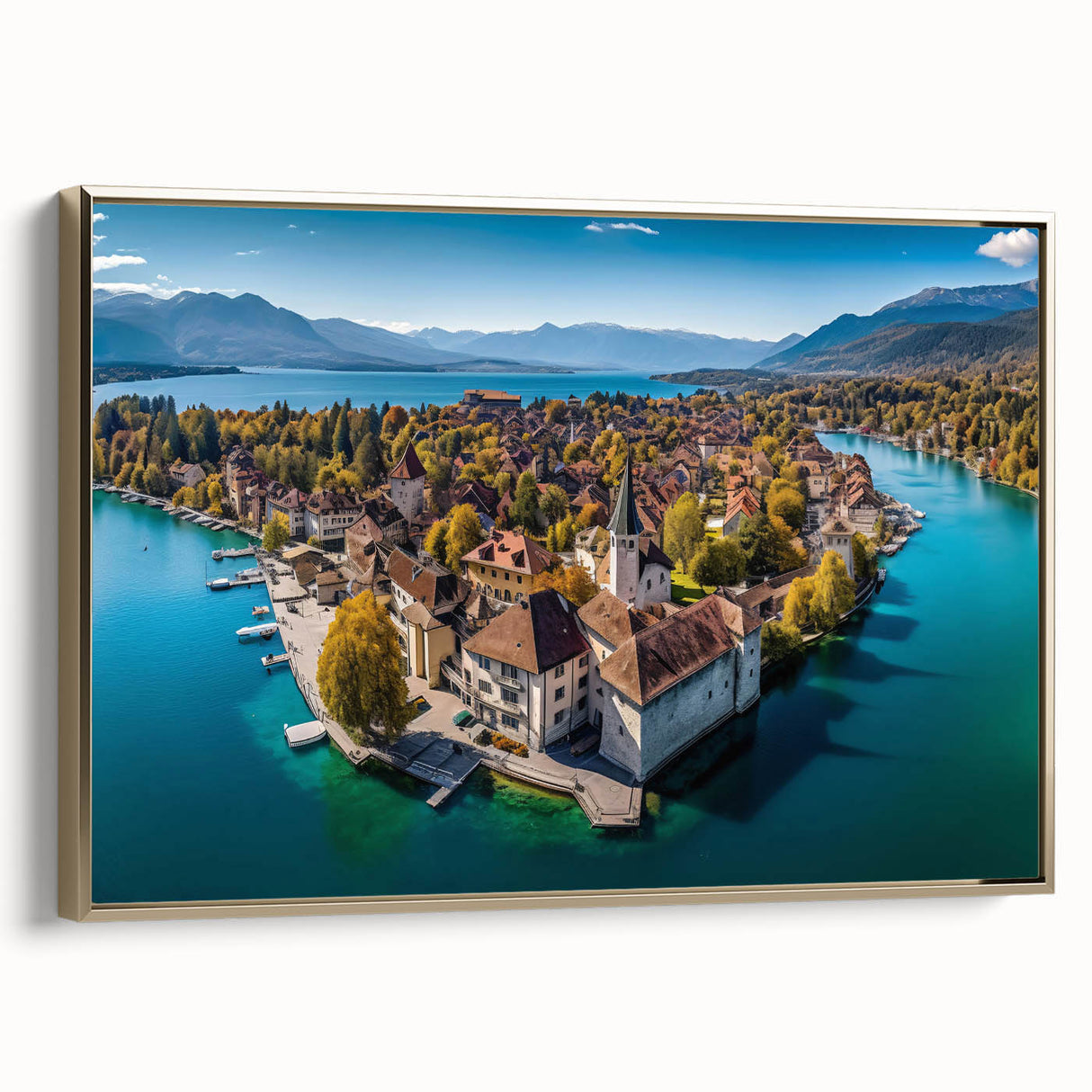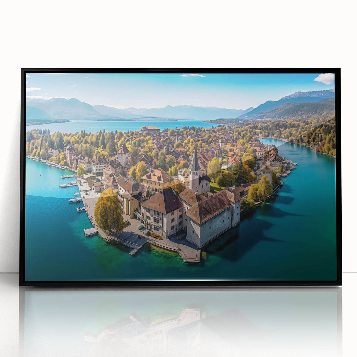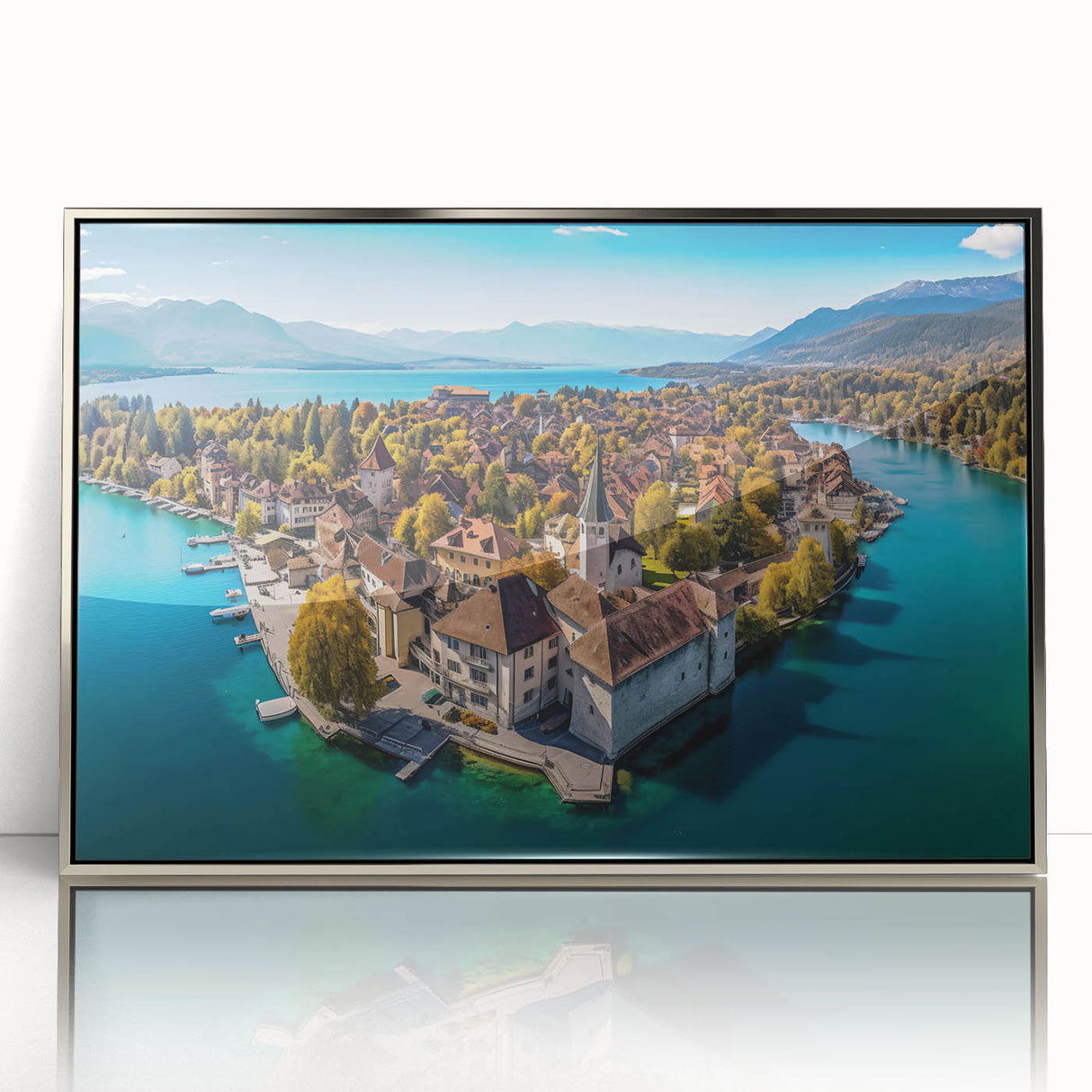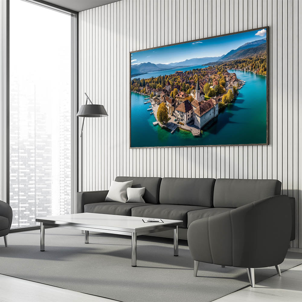 Capture the breathtaking beauty of the French Alps with this serene wall art, featuring a picturesque village nestled on the shores of a tranquil lake. Surrounded by golden autumn foliage, this scenic landscape blends the charm of French alpine life with the peacefulness of nature. The crystal-clear water reflects the vibrant colors of the trees and rooftops, creating a harmonious and calming view that will elevate any space in your home.