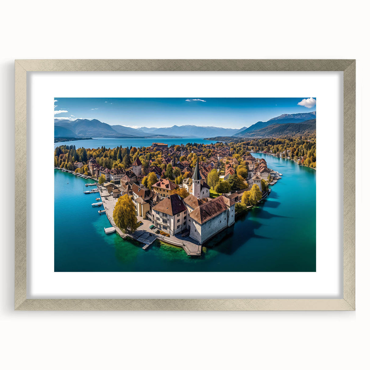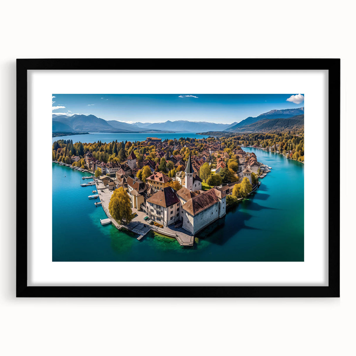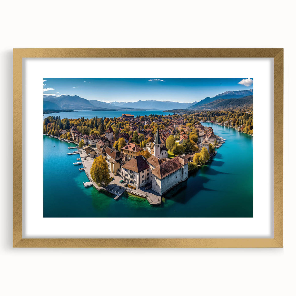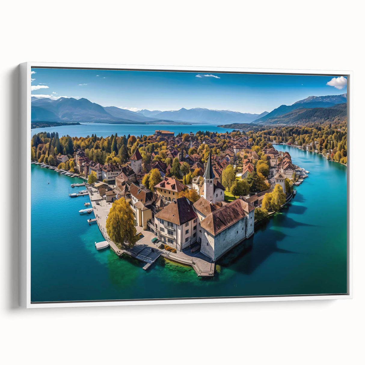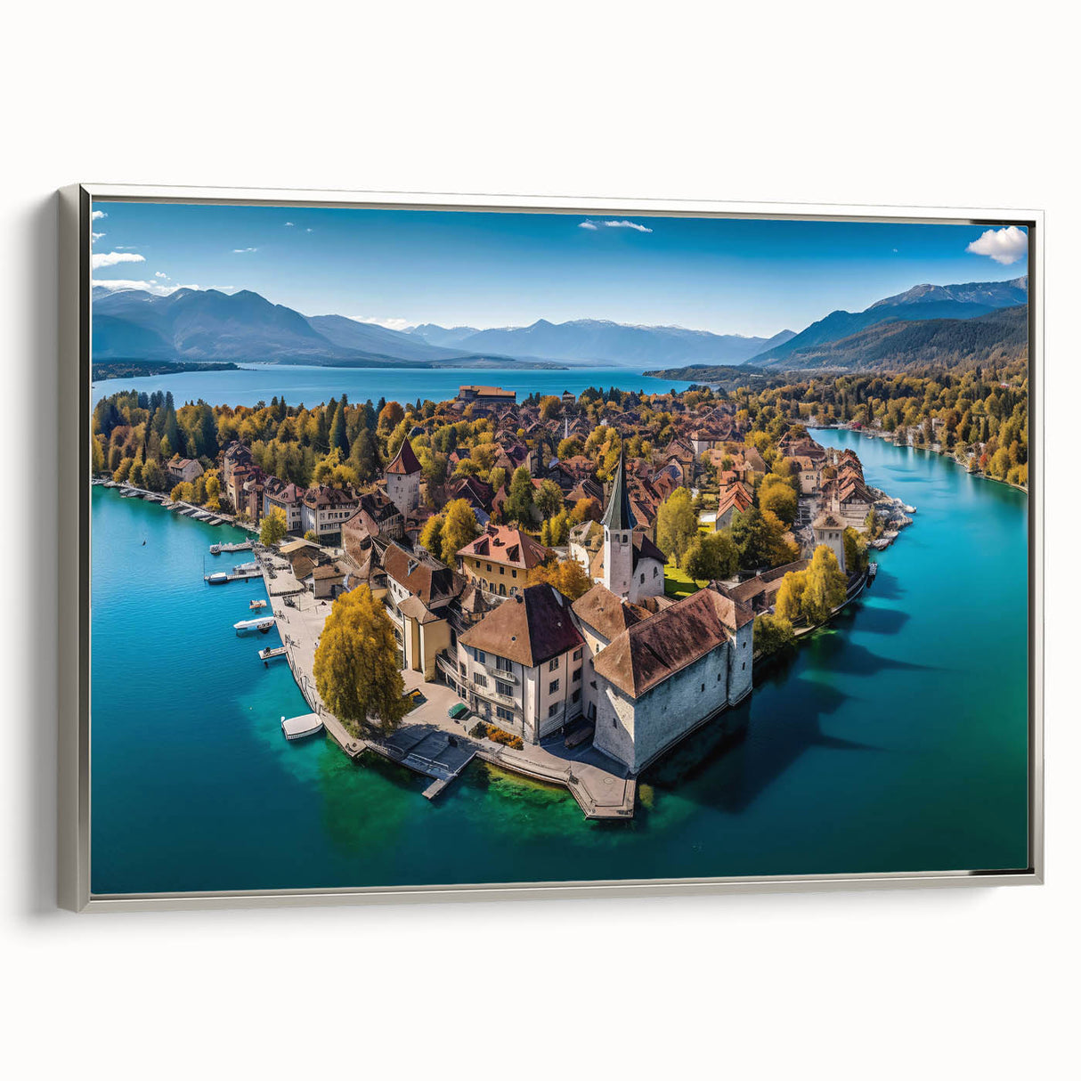 Capture the breathtaking beauty of the French Alps with this serene wall art, featuring a picturesque village nestled on the shores of a tranquil lake. Surrounded by golden autumn foliage, this scenic landscape blends the charm of French alpine life with the peacefulness of nature. The crystal-clear water reflects the vibrant colors of the trees and rooftops, creating a harmonious and calming view that will elevate any space in your home.