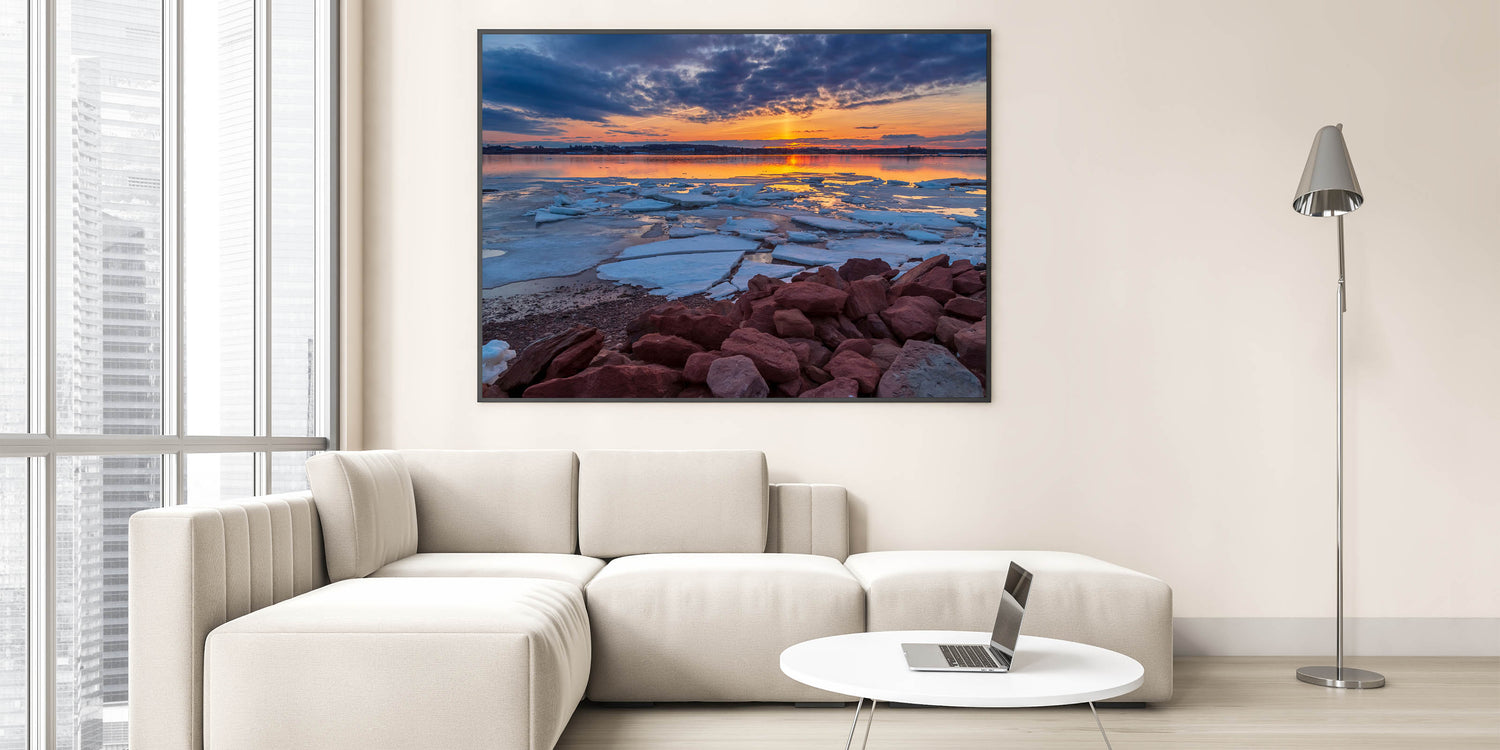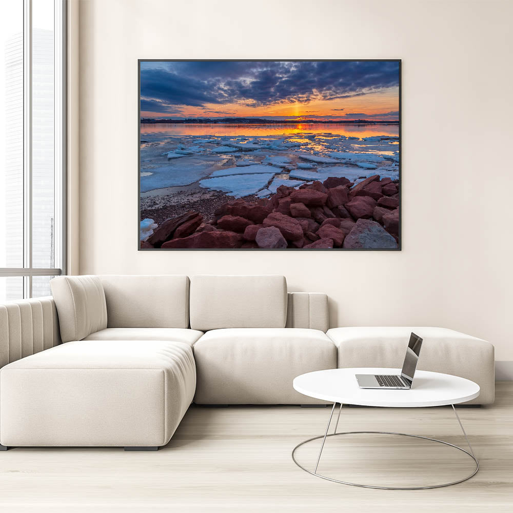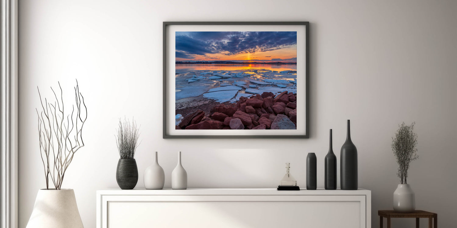 Experience the breathtaking beauty of a Prince Edward Island winter sunset with this stunning wall art. The icy waters, reflecting the vivid colors of the setting sun, are contrasted by the rugged red rocks in the foreground. This piece perfectly captures the serene yet powerful beauty of PEI's winter landscapes, where nature’s raw elements converge in a mesmerizing display of color and texture.